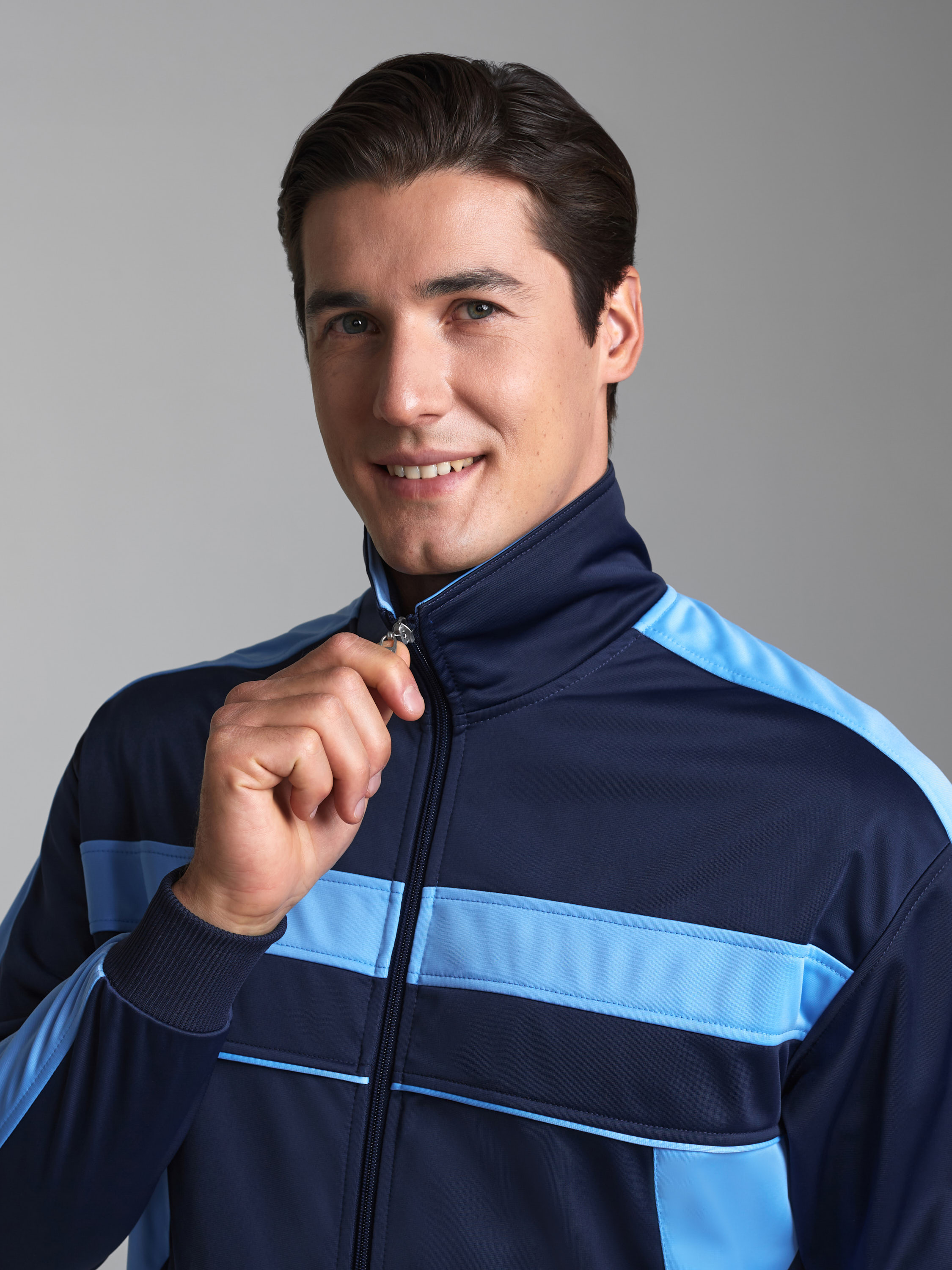 Спортивный костюм выполнен из полиэстеровой ткани с изнаночным начесом. Карманы куртки расположены в шве отрезных бочков с листочками и молниями. Карманы брюк прорезные с листочками и молниями. Посадку по фигуре обеспечивает эластичная трикотажная рибана по поясу и рукавам куртки. По боковой линии рукава, центральной части полочек, в отрезных боковых деталях использованы цветные вставки, которые позволяют костюму создать яркий образ. Брюки прямые. Пояс по линии талии регулируется шнурком. На левой полочке и брюках вышивка фирменного логотипа.