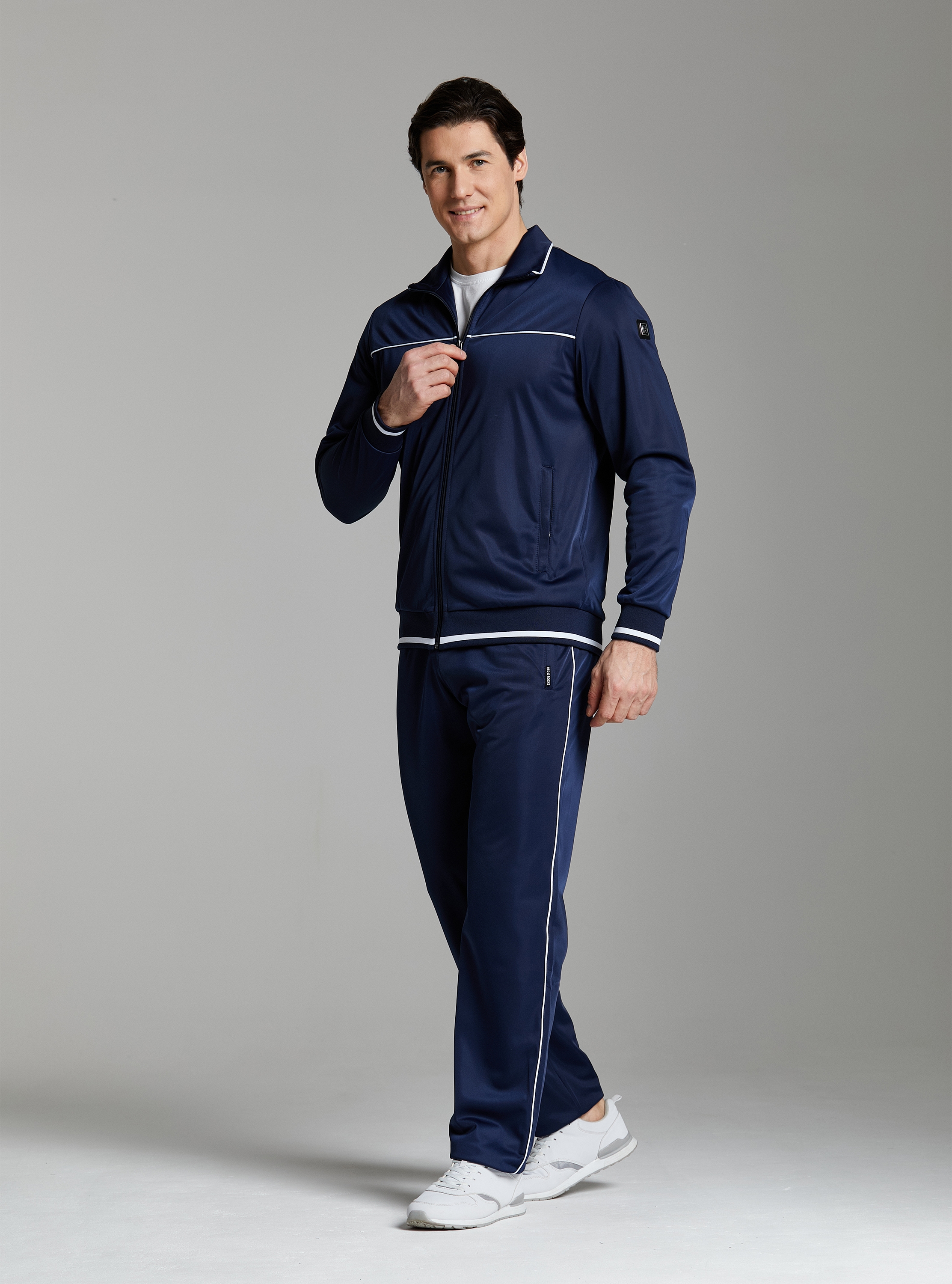 Спортивный костюм из полиэстеровой ткани с изнаночным начесом, в стиле "ретро-спорт"с российской символикой. Карманы куртки и брюк прорезные с молниями. Куртка свободного силуэта, застегивается на молнию. Посадку по фигуре обеспечивает эластичная трикотажная рибана пояса куртки. На плечах яркие вставки из контрастной ткани.Слева на груди вышивка - герб России..Воротник-стойка. Брюки прямого силуэта. На левой брючине - контрастные вставки в цвет российского флага. Пояс брюк на широкой резинке, по линии талии дополнительно регулируется шнурком. 100% полиэстер
