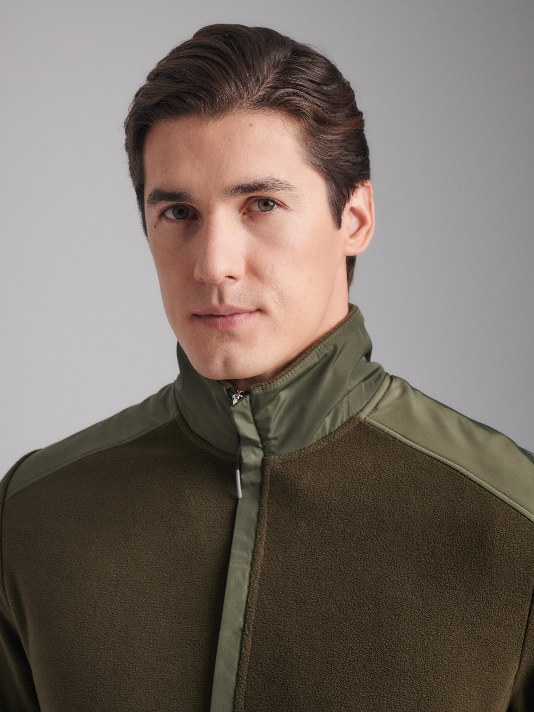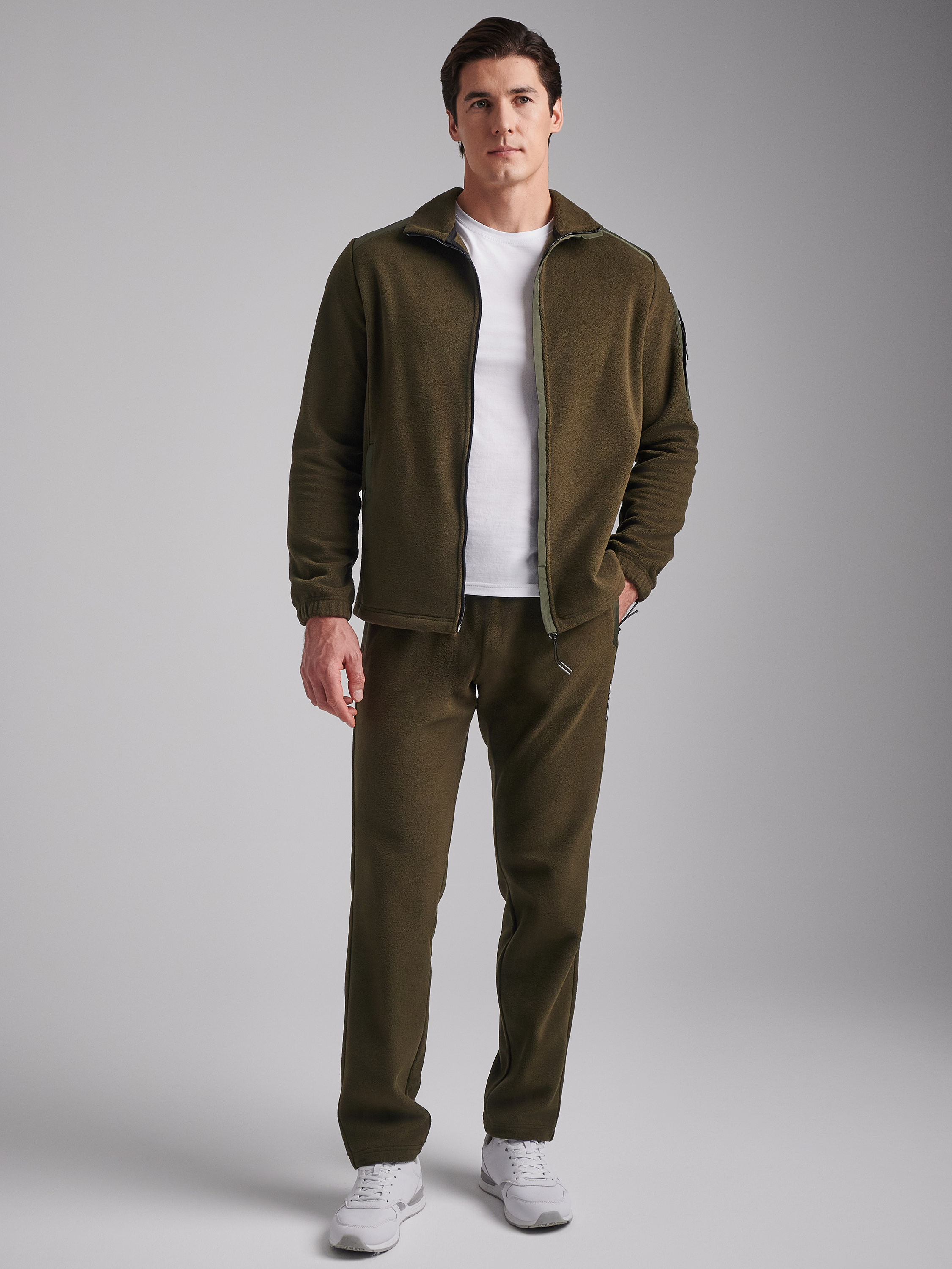 Костюм мужской из флиса. Куртка костюма с воротником-стойкой, застегивается на молнию. Передняя часть воротника и передняя часть куртки простеганы с водонепроницаемой плащевкой. Рукава покроя реглан. Верхний край воротника, низ рукавов и низ куртки окантованы эластичной тесьмой. Под швом рукава слева на груди нашит фирменный шеврон. Карманы куртки прорезные, с планками. Брюки прямые. Карманы прорезные с планками, слева под карманом нашит фирменный шеврон. Эластичный пояс брюк дополнительно фиксируется шнуром. 100% полиэстер