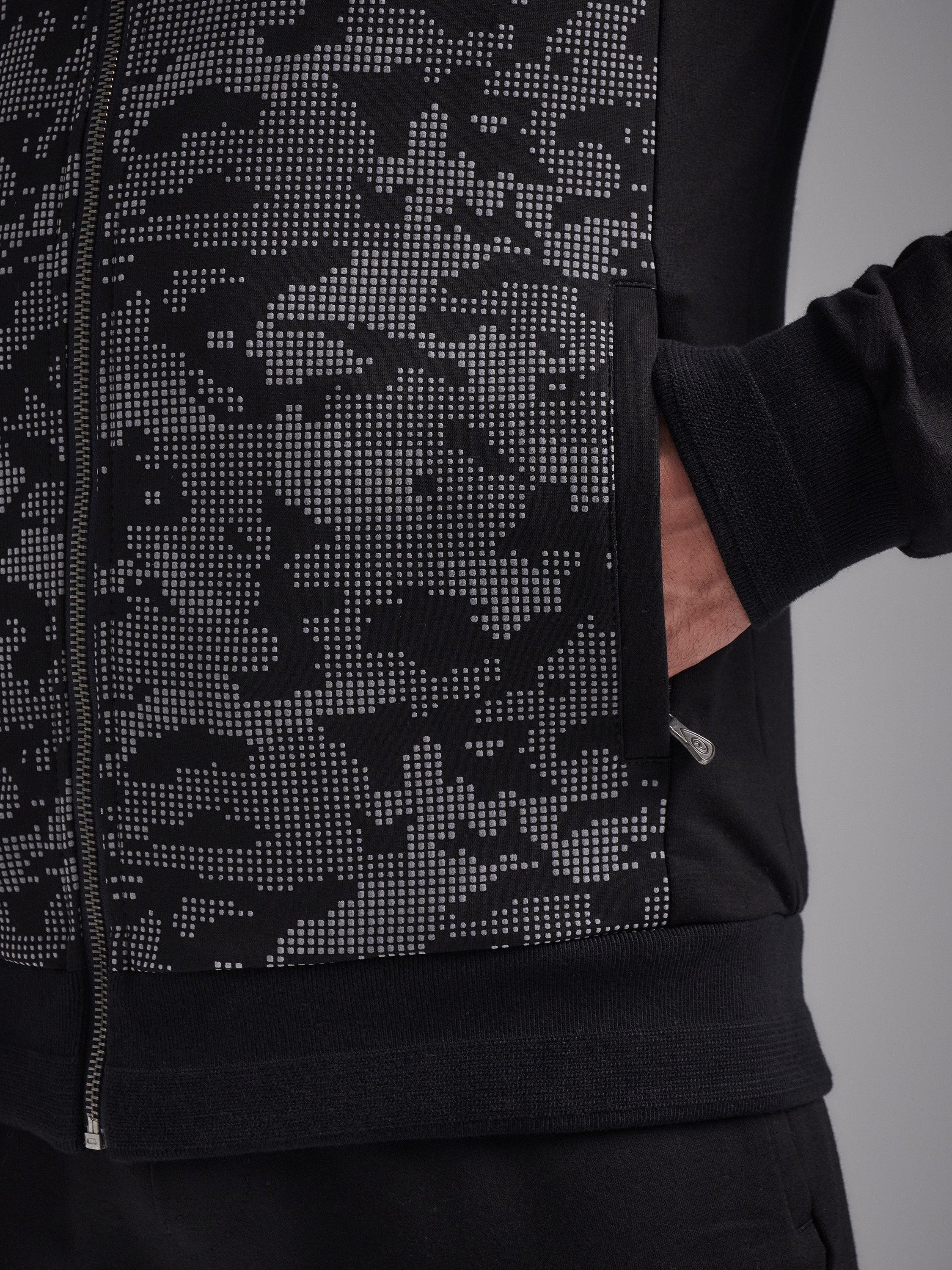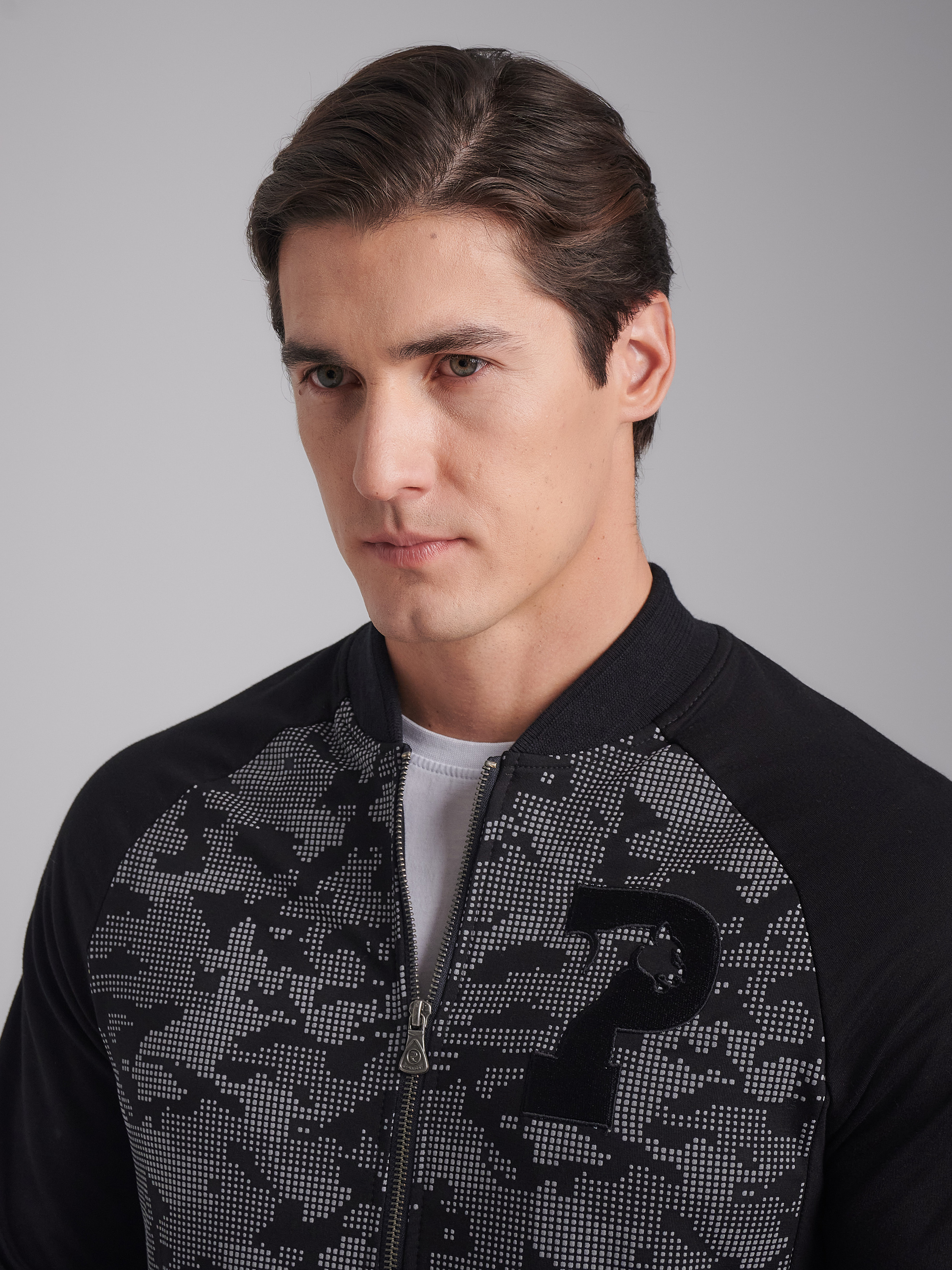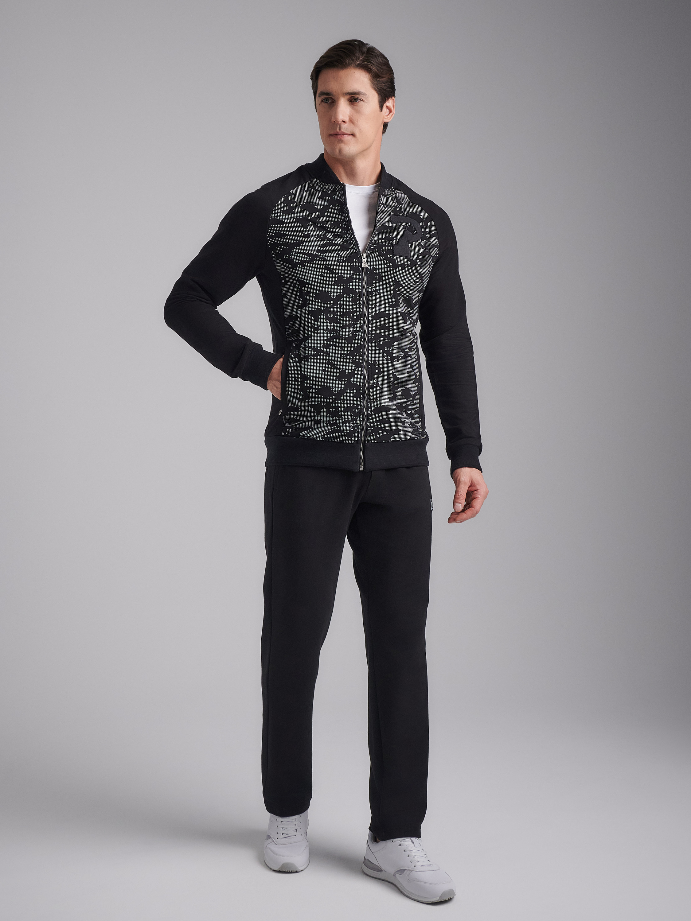 Спортивный костюм из хлопкового трикотажного полотна. Куртка костюма на поясе, с воротником - стойкой, застегивается на молнию. Перед и спинка куртки – из трикотажного полотна с объемным принтом. Рукава покроя реглан. Карманы куртки и брюк с молниями, закрытыми планками, в рельефах. На груди куртки слева фирменная вышивка. Пояс и манжеты куртки изготовлены из плотного эластичного полотна с серыми полосами. Брюки прямые. Пояс брюк по линии талии с эластичной резинкой, дополнительно регулируется шнуром. На левом рукаве и под левым карманом шеврон с фирменным логотипом. 77% хлопок, 17% полиэстер, 6% эластан