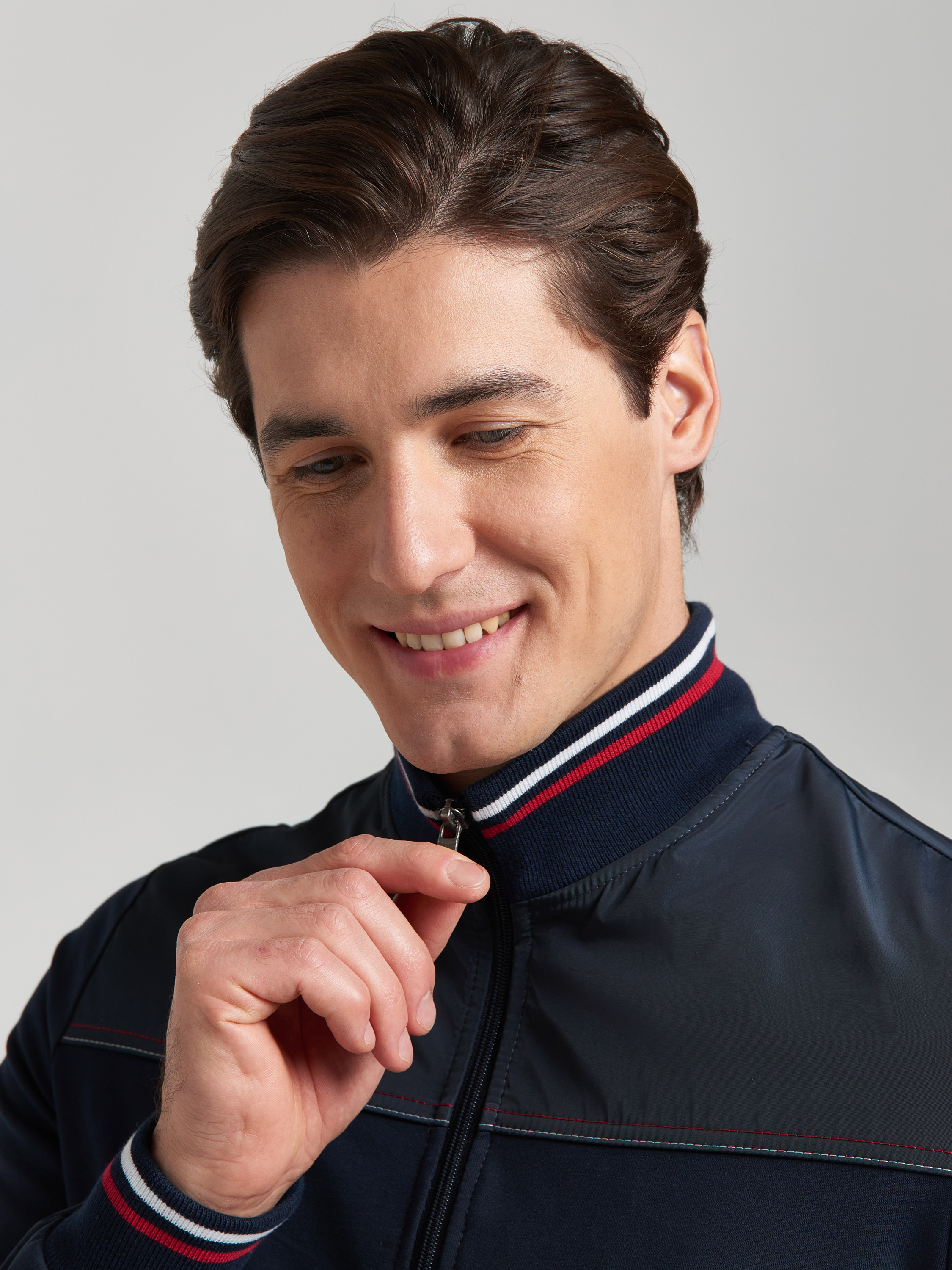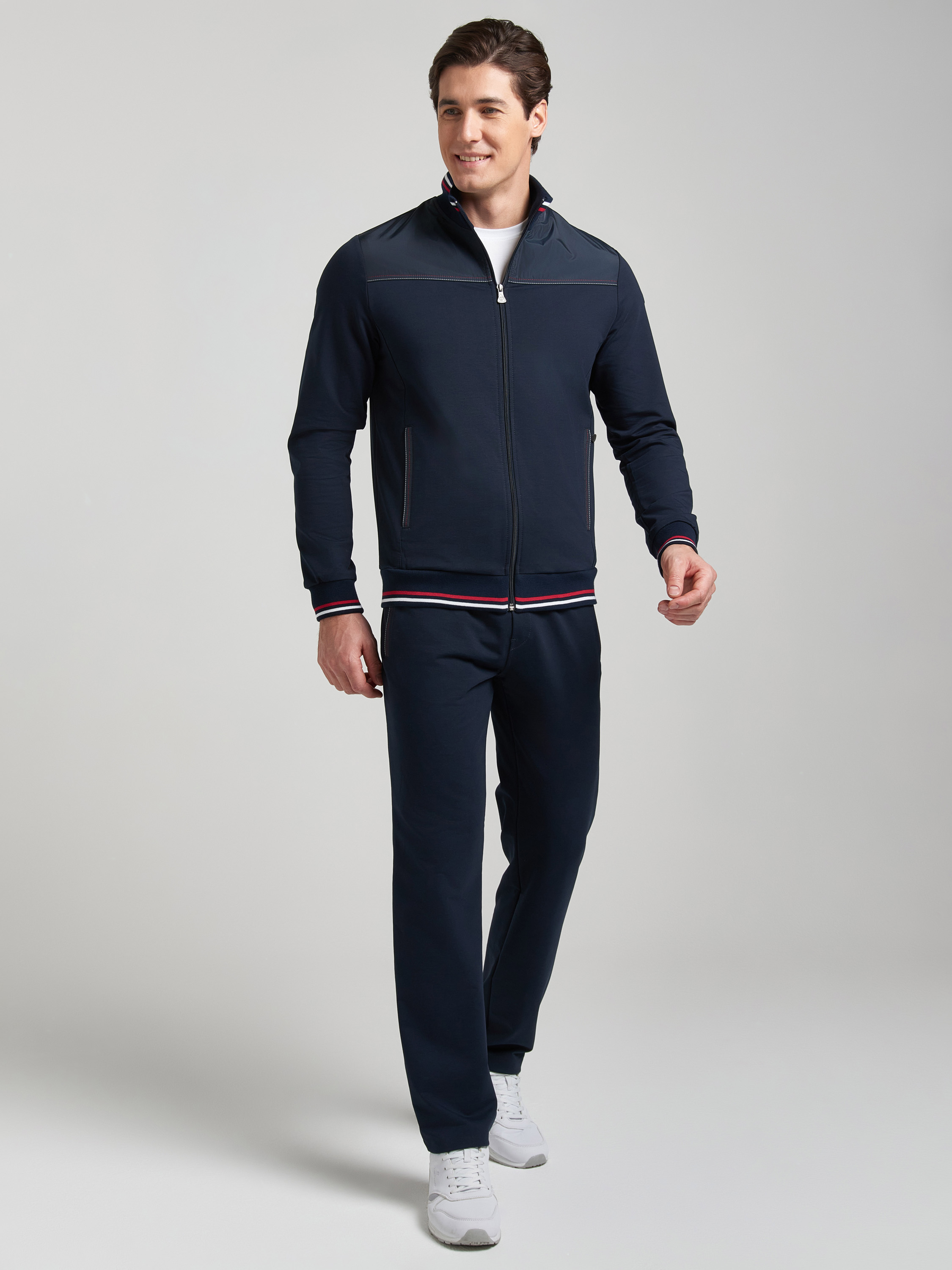 Мужской спортивный костюм из эластичного хлопкового трикотажного полотна. Куртка прямая с воротником, застегивается на молнию. Рукава втачные. Кокетки куртки и карманы отделанны плащевкой в тон основной ткани. Воротник, манжеты и пояс куртки выполнены из полосатого эластичного трикотажа. Контрастные отстрочки кокеток и планок кармана выполнены в цветовой гамме полос воротника. Брюки прямого силуэта. Прорезные карманы куртки и брюк застегиваются на молнии. Пояс брюк эластичный, по линии талии дополнительно регулируется шнуром. 77% хлопок, 17% полиэстер, 6% эластан