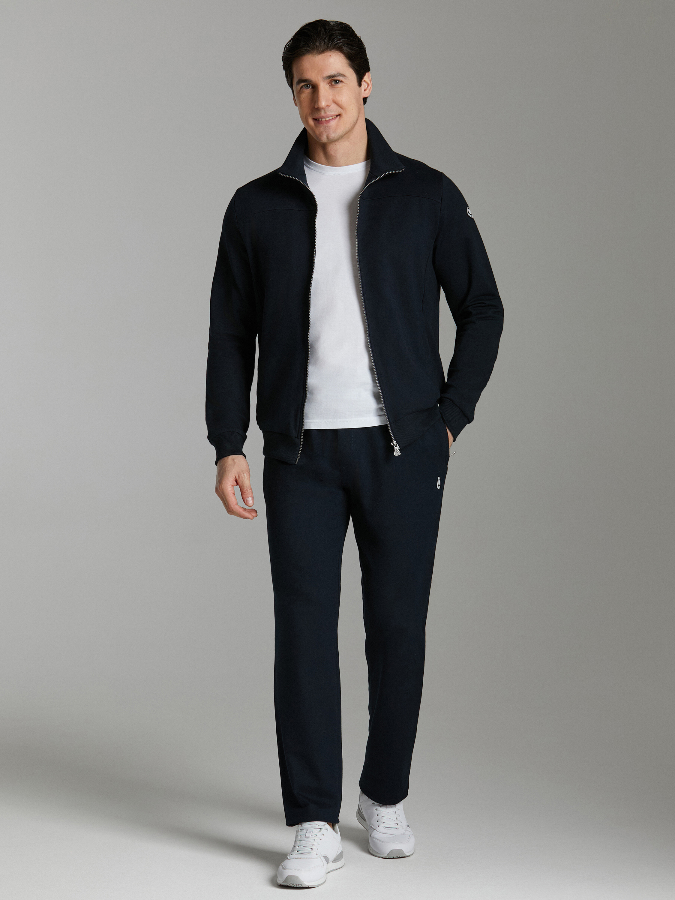 Мужской спортивный костюм из эластичного хлопкового трикотажного полотна. Куртка прямая с воротником, застегивается на молнию. Рукава втачные.Воротник, манжеты и пояс куртки выполнены из эластичного трикотажа. Брюки прямого силуэта. Прорезные карманы куртки и брюк застегиваются на молнии. Пояс брюк эластичный, по линии талии дополнительно регулируется шнуром.