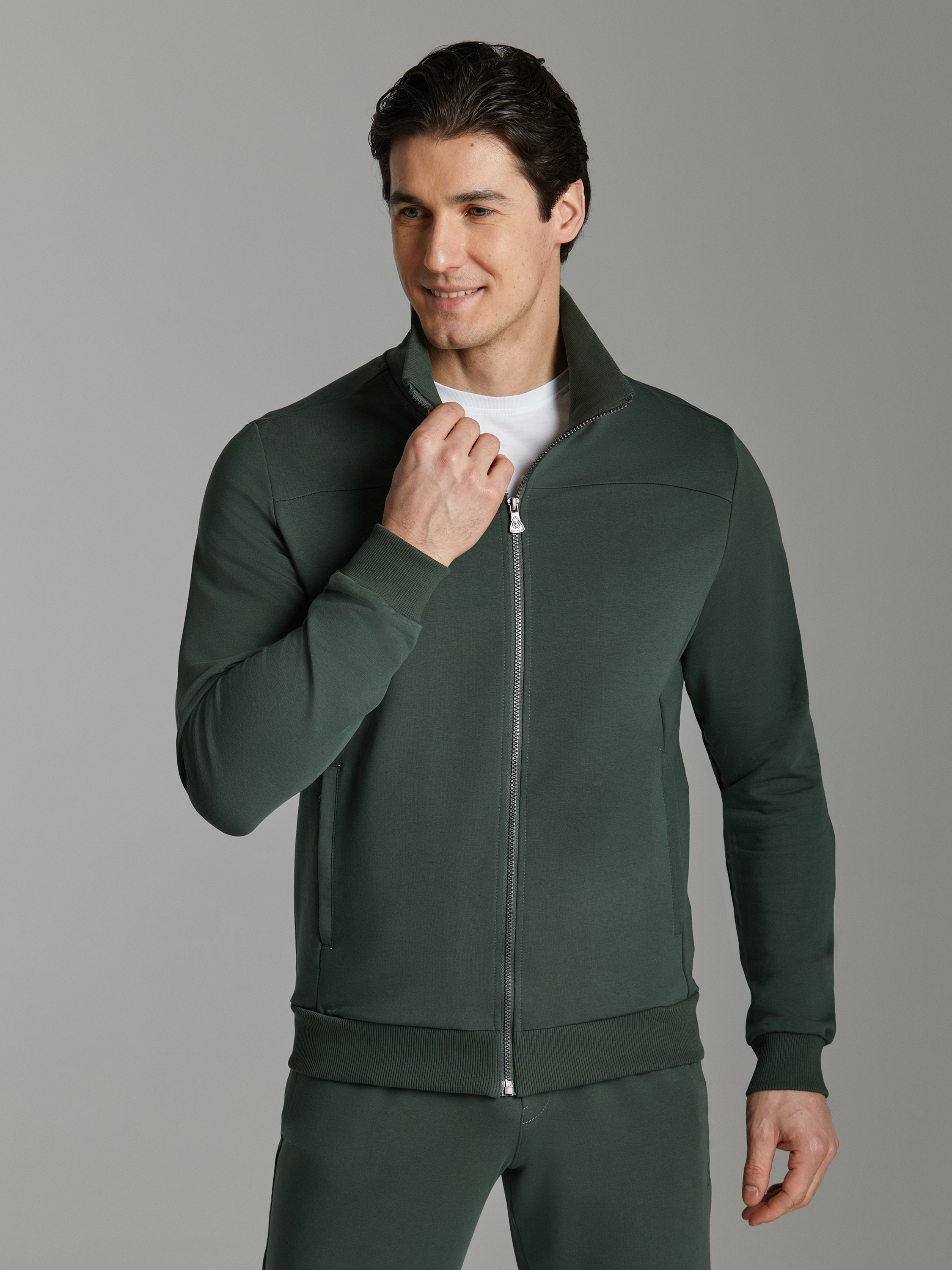 Мужской спортивный костюм из эластичного хлопкового трикотажного полотна. Куртка прямая с воротником, застегивается на молнию. Рукава втачные.Воротник, манжеты и пояс куртки выполнены из эластичного трикотажа. Брюки прямого силуэта. Прорезные карманы куртки и брюк застегиваются на молнии. Пояс брюк эластичный, по линии талии дополнительно регулируется шнуром. 77% хлопок, 17% полиэстер, 6% эластан