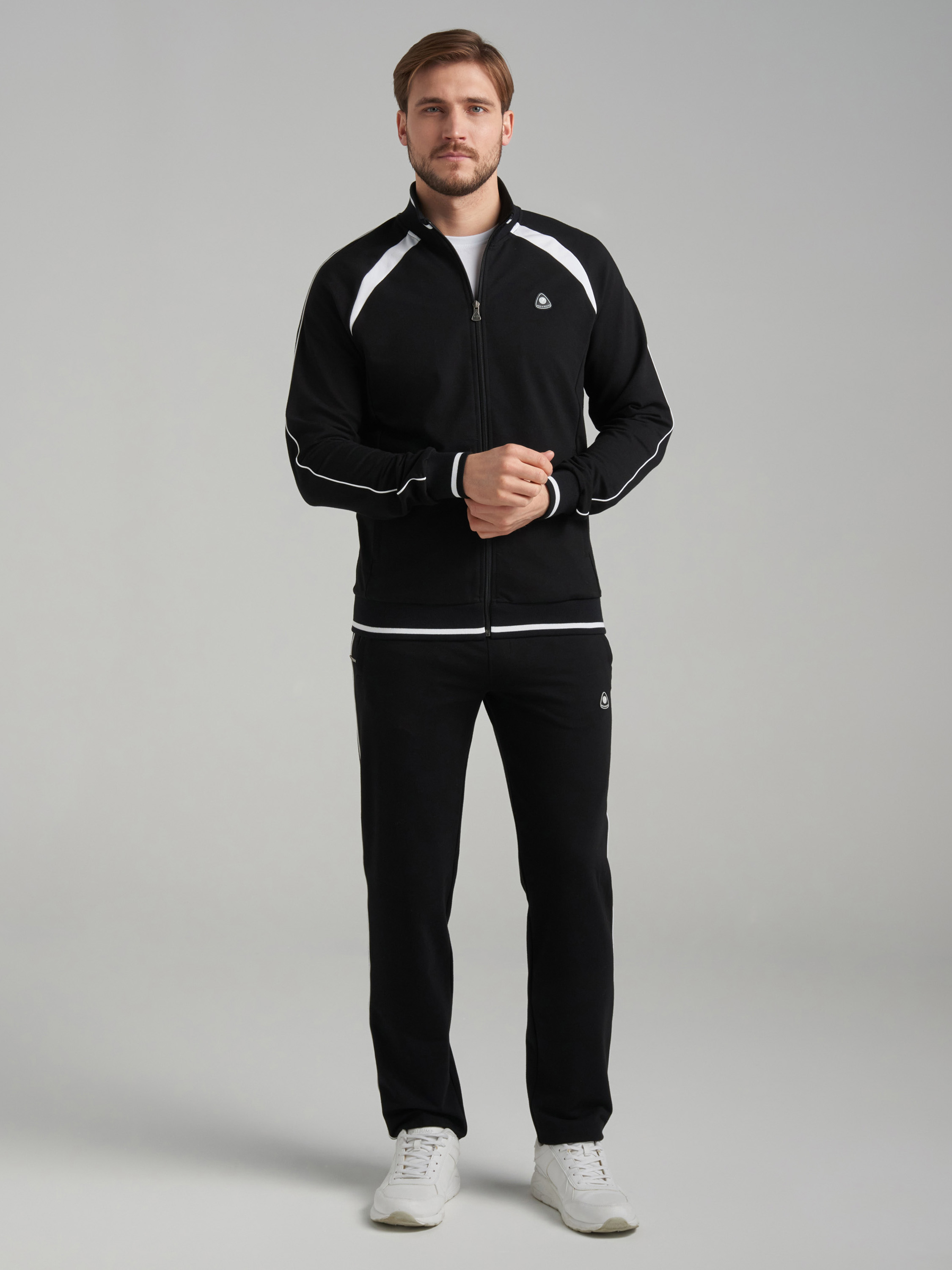 Спортивный костюм из хлопкового трикотажного полотна. Куртка костюма на поясе, с воротником-стойкой, застегивается на молнию. Рукава покроя реглан. По плечевому шву рукавов и боковым швам брюк проложен кант белого цвета. Стилистика костюма поддерживается белой вставкой по плечам. карманы куртки и брюк прорезные с планками, застегиваются на молнии. Пояс, воротник и манжеты куртки изготовлены из эластичного подвяза с узкой белой полосой . Брюки прямые, зауженные книзу. Пояс брюк по линии талии с эластичной резинкой так же дополнительно регулируется шнуром. Слева на груди и под левым карманом брюк нашиты шевроны с фирменным логотипом... 77% хлопок, 17% полиэстер, 6% эластан