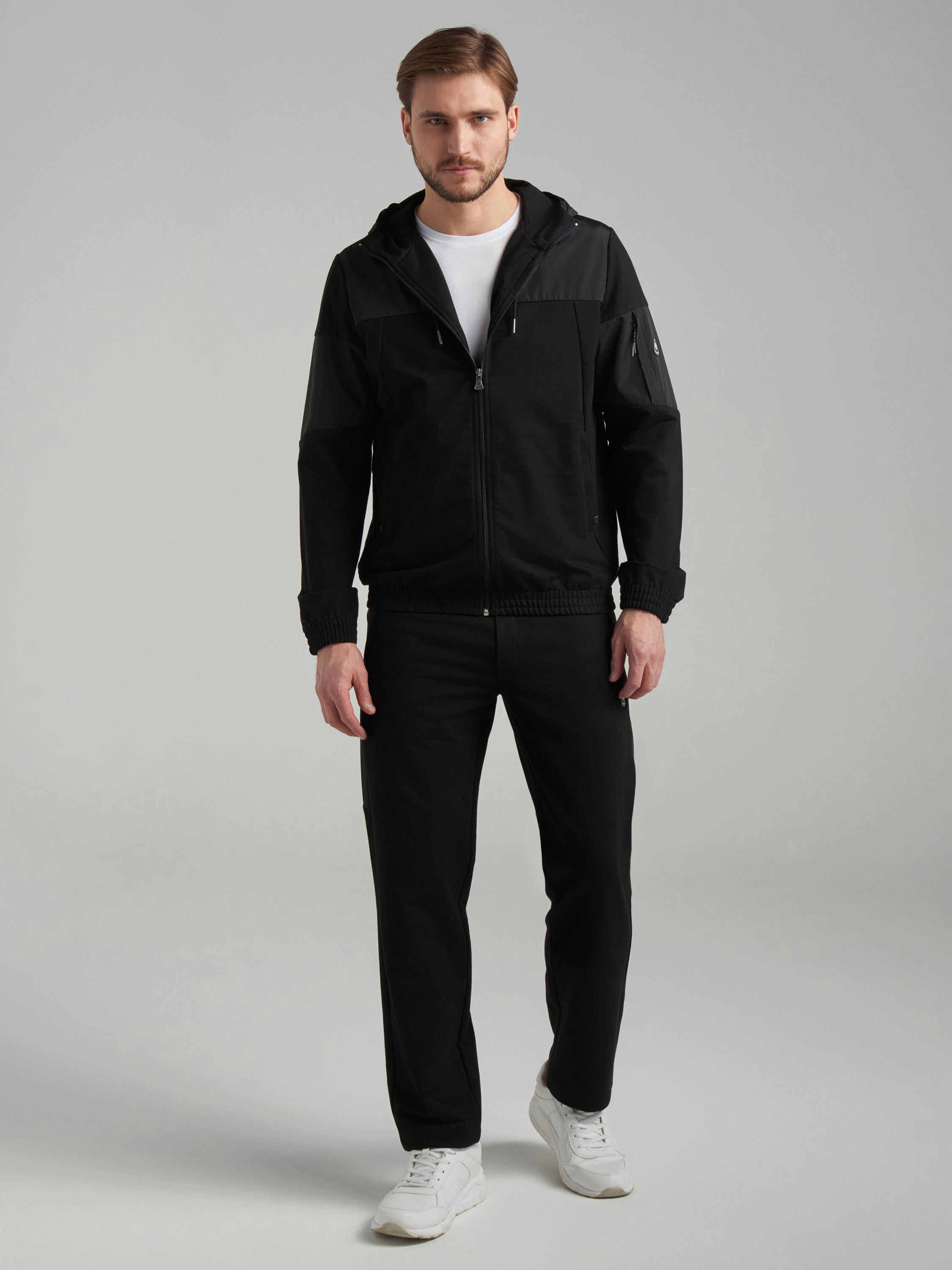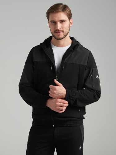 Спортивный костюм из хлопкового трикотажного полотна .Куртка костюма на поясе, с воротником-стойкой, с капюшоном, застегивается на молнию. Рукава втачные. Несколько деталей костюма изготовлены из водонепроницаемой плащевой ткани в тон изделия - это капюшон,кокетка куртки, вставка левого рукава и боковые вставки брюк. Карманы куртки и брюк с молниями, распологаются в рельефах. На рукаве куртки слева предусмотрен дополнительный карман, он также с молнией. Капюшон ветрозащитный, с высокой цельнокроенной стойкой. Пояс и манжеты куртки собраны на эластичную резину. Брюки прямые, зауженные книзу. Пояс брюк по линии талии так же с эластичной резинкой, дополнительно регулируется шнуром. На левом рукаве и под левым карманом брюк нашиты шевроны с фирменным логотипом. 77% хлопок, 17% полиэстер, 6% эластан