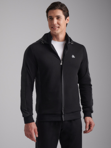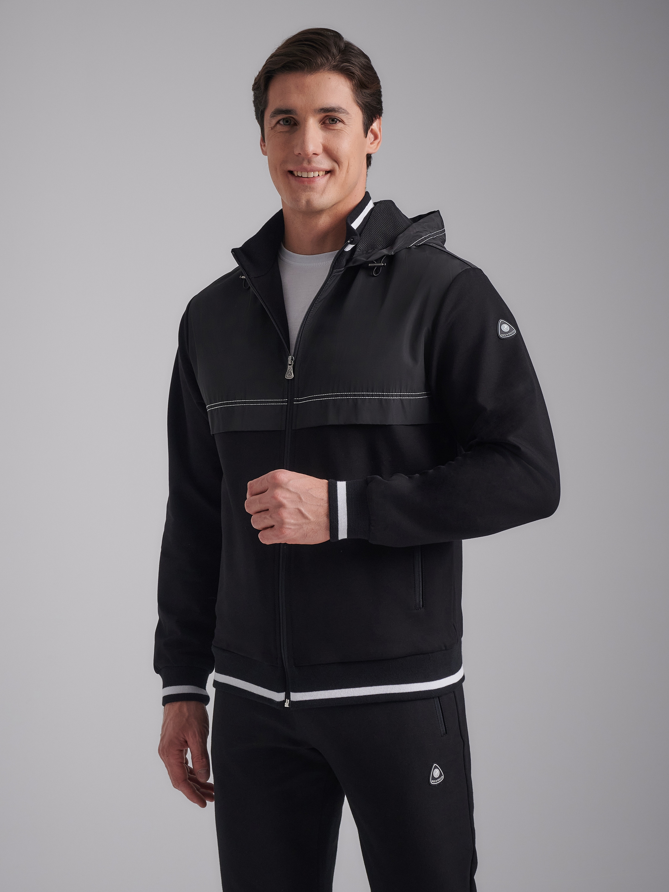 Спортивный костюм из хлопкового трикотажного полотна . Куртка костюма на поясе, с воротником-стойкой, с легким капюшоном, застегивается на молнию. Рукава втачные. Несколько деталей костюма изготовлены из водонепроницаемой плащевой ткани в тон изделия - это капюшон, кокетки куртки, нижние вставки задних брючин. Все карманы комплекта прорезные,застегиваюся на молнии. Лицевая часть капюшона регулиреутся резиновым шнуром с помощью металлических фиксаторов.Пояс, воротник и манжеты куртки изготовлены из эластичного подвяза с узкой белой полосой. Брюки прямые, зауженные книзу. Пояс брюк по линии талии с эластичной резинкой так же дополнительно регулируется шнуром. На левом рукаве и под левым карманом брюк нашиты шевроны с фирменным логотипом.... 77% хлопок, 17% полиэстер, 6% эластан