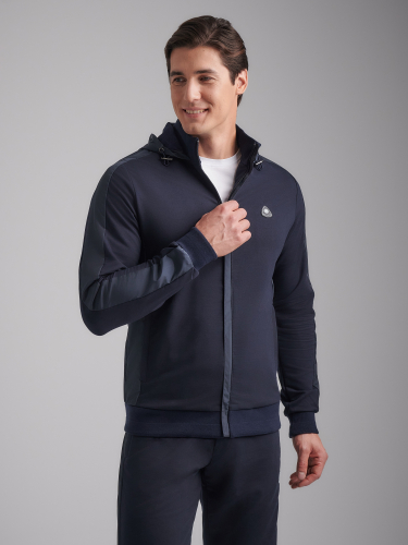 Спортивный костюм из хлопкового трикотажного полотна. Куртка костюма на поясе, с воротником-стойкой, с легким капюшоном, застегивается на молнию. Рукава втачные. Несколько деталей костюма изготовлены из водонепроницаемой плащевой ткани в тон изделия - это капюшон, вставки рукавов, переходящие в плечевые кокетки, бочки куртки, боковые вставки брюк. Ветрозащитная планка из плащевой ткани закрывает молнию. Все карманы комплекта застегиваюся на молнии и расположены в швах боковых деталей, Лицевая часть капюшона регулиреутся резиновым шнуром с помощью металлических фиксаторов.Пояс, воротник и манжеты куртки изготовлены из эластичного подвяза. Брюки прямые, зауженные книзу. Пояс брюк по линии талии с эластичной резинкой так же дополнительно регулируется шнуром. На левой груди и под левым карманом брюк нашиты шевроны с фирменным логотипом..... 77% хлопок, 17% полиэстер, 6% эластан