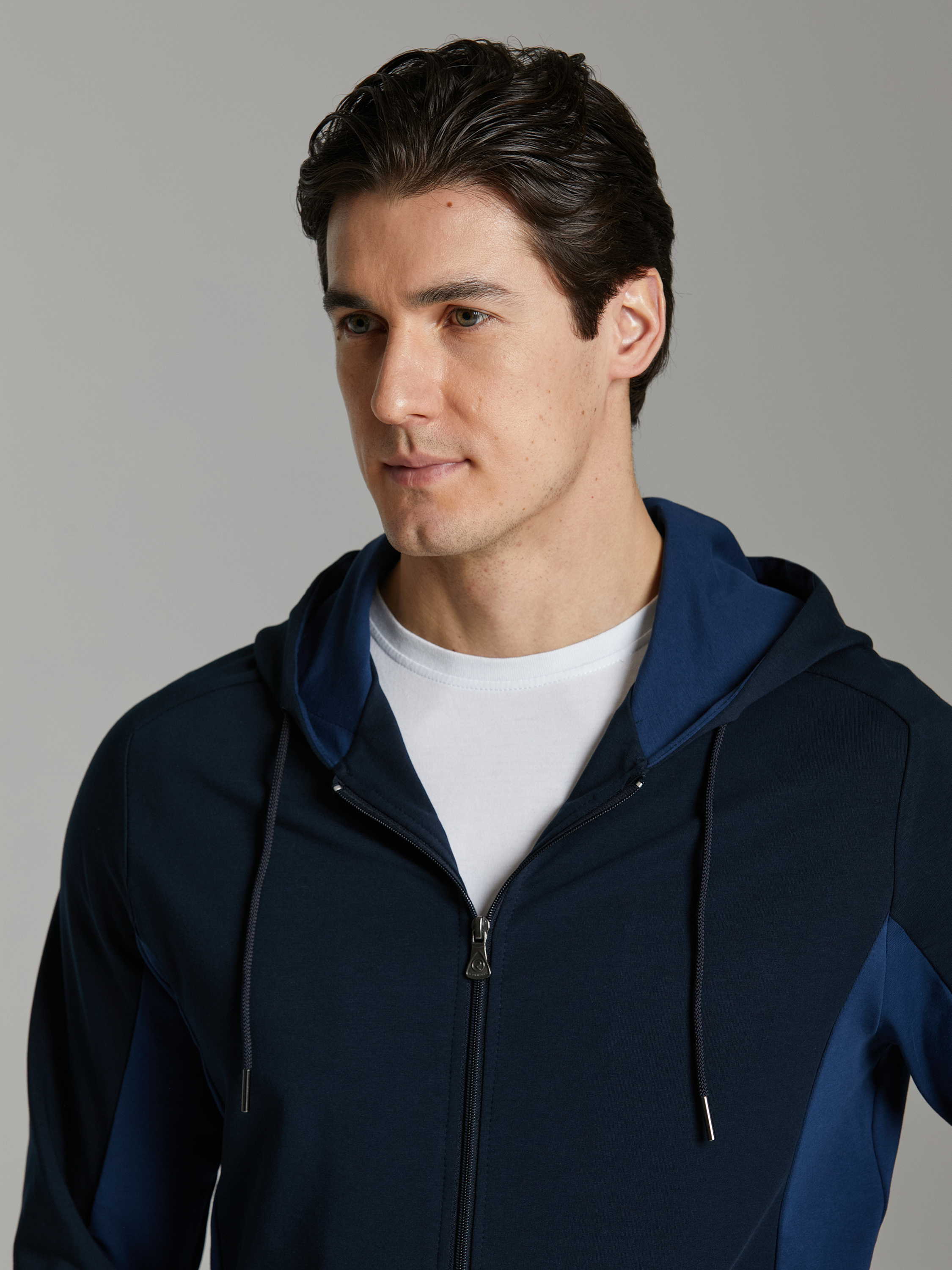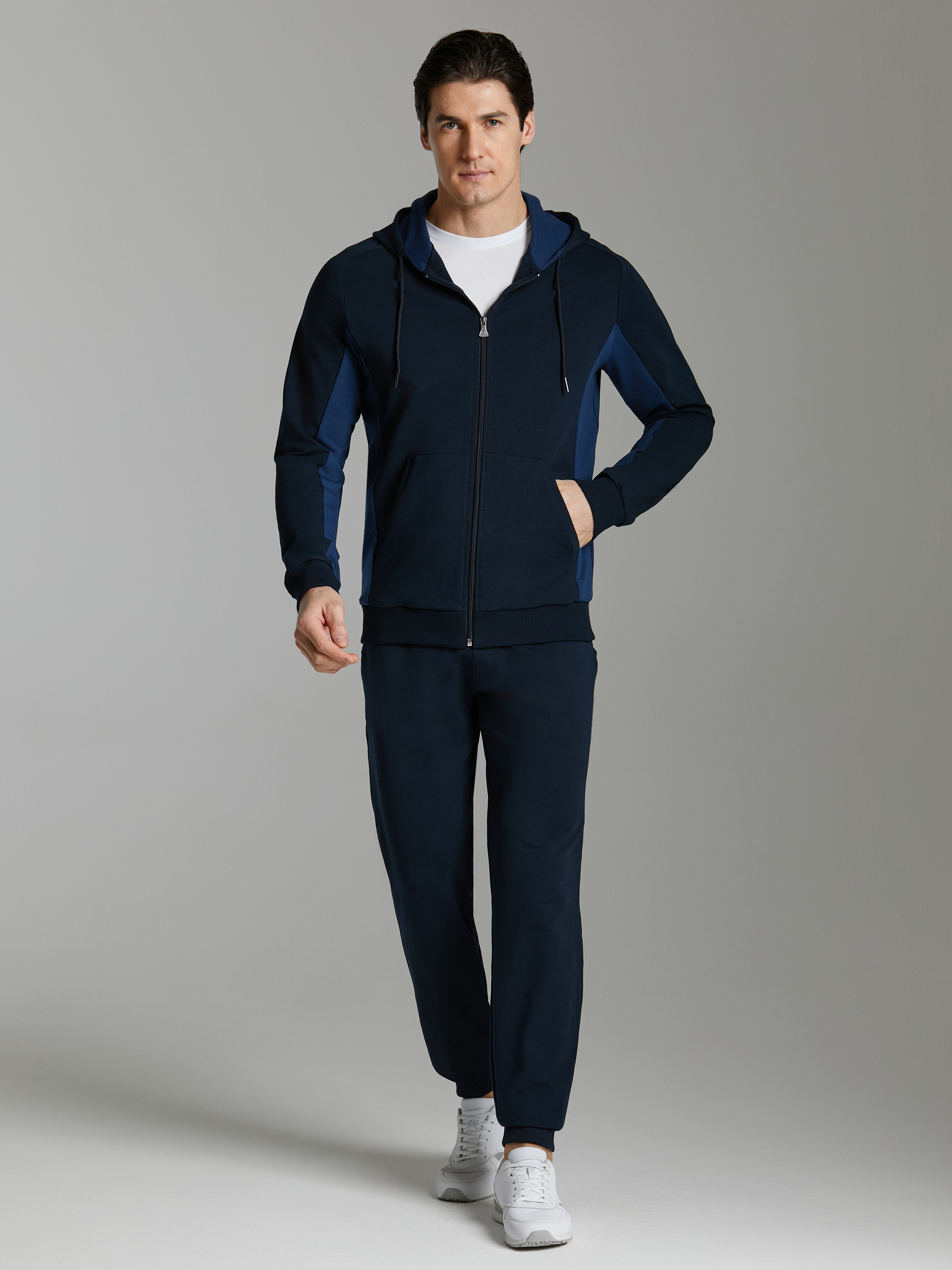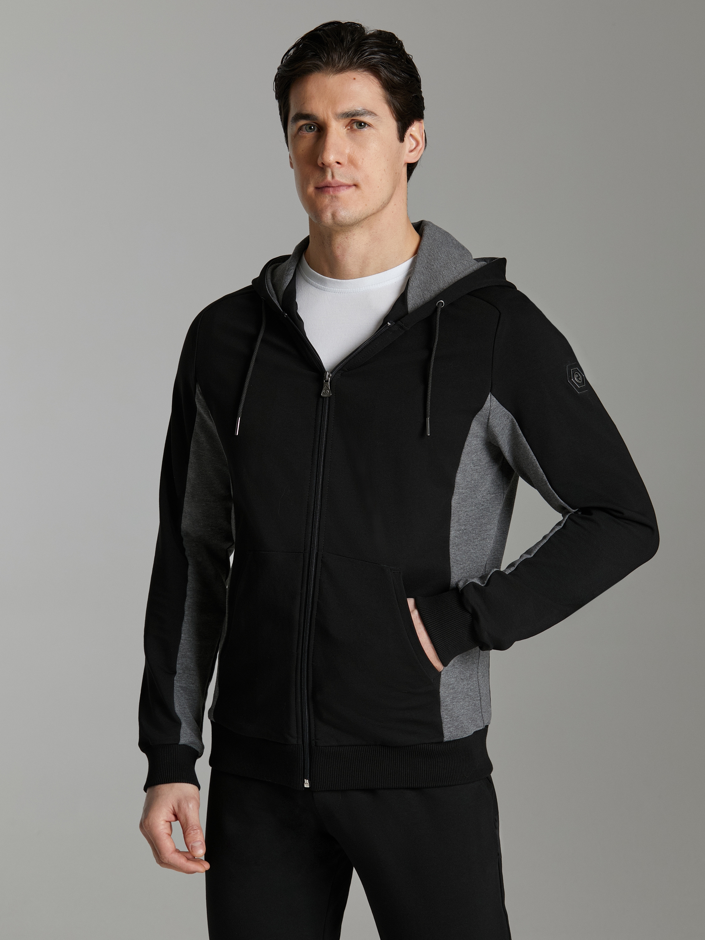 Мужской артикул 11M-RR-1827 черного цвета спортивный костюм изготовлен из хлопкового трикотажного полотна. Куртка костюма на поясе, с капюшоном, застегивается на молнию. Рукава куртки покроя реглан, очень удобны и комфортны в движении. Карманы классические - накладные "кенгуру". Капюшон двойной, лицевая часть капюшона регулируется шнуром. Контрастные боковые вставки куртки сочетаются с подкладкой капюшона. Пояс и манжеты куртки изготовлены из эластичного трикотажа. Брюки зауженные к низу, с манжетами. Карманы брюк в боковых подрезах, справа есть дополнительный задний карман. Пояс брюк по линии талии с эластичной резинкой, дополнительно регулируется шнуром. На левом рукаве и под верхним углом заднего кармана брюк нашивки с фирменным логотипом.
