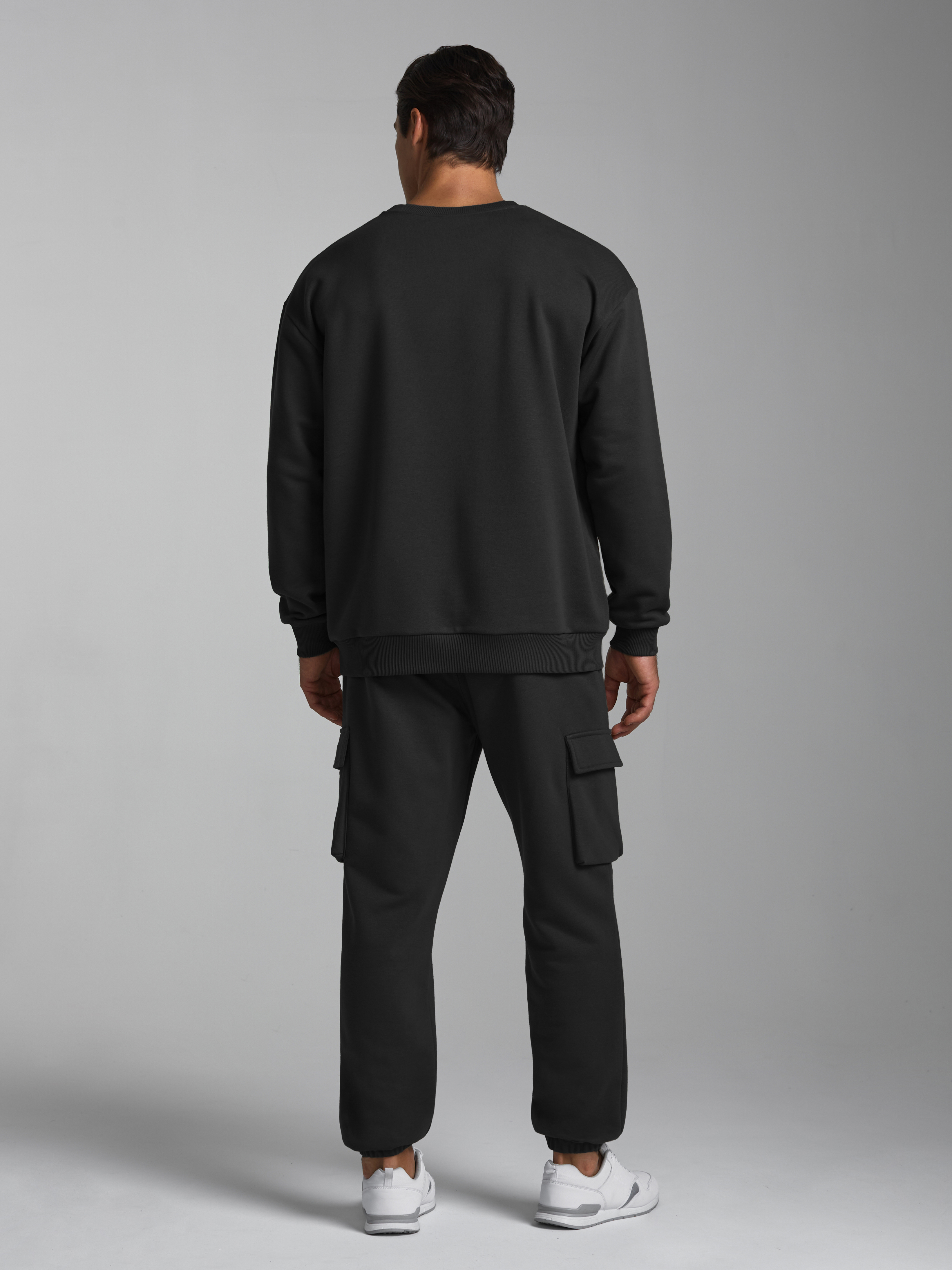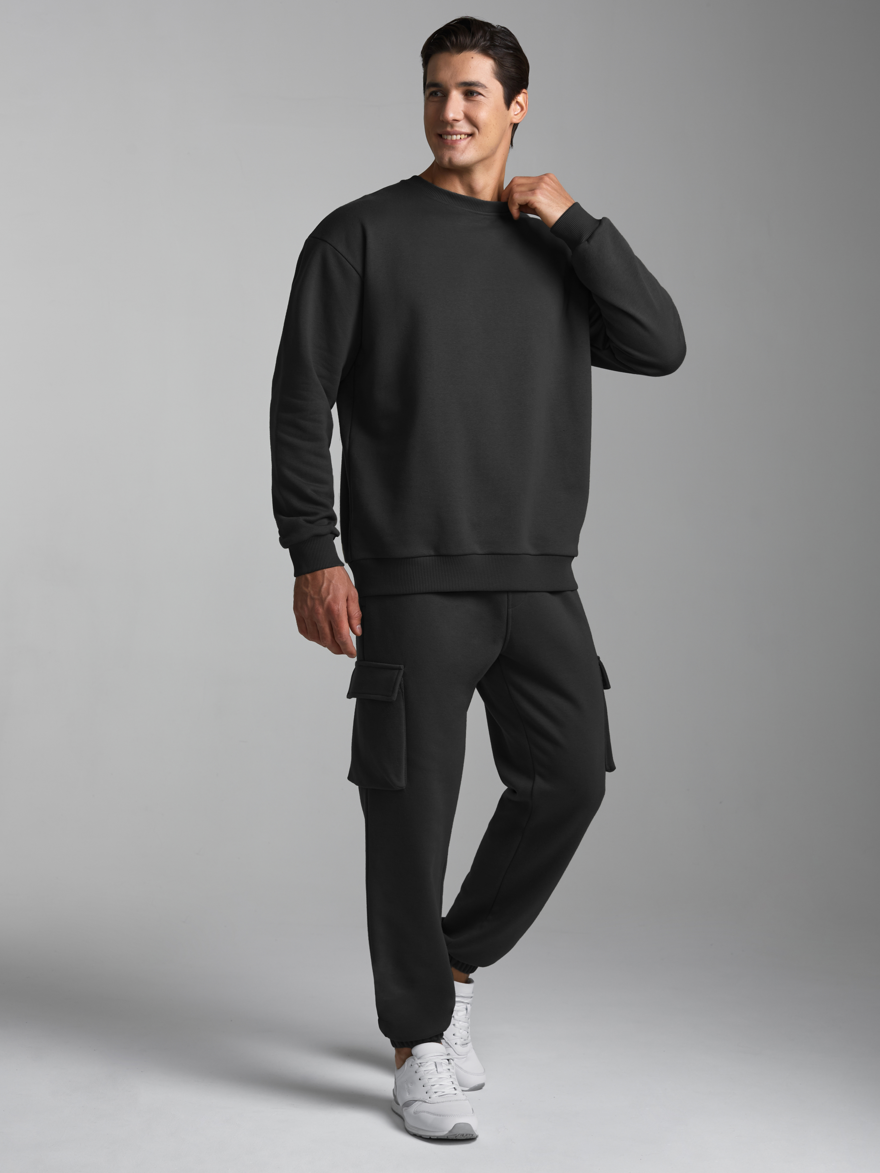 Мужской спортивный костюм , из плотного трикотажа с петельной изнанкой. Верх комплекта - свитшот ( джемпер) свободного силуэта. Рукава втачные, широкие со спущенной линией плеча. Джемпер без застежки. По вороту, низу рукавов и низу джемпера пришита рельефная трикотажная резинка. На брюках "Карго" два объемных накладных кармана с клапанамии и еще два кармана в боковых подрезах. Брюки зауженны книзу на манжет. Пояс брюк по линии талии с эластичной резинкой, дополнительно регулируется шнуром. 80% хлопок, 20% полиэстер