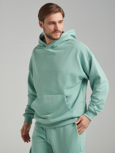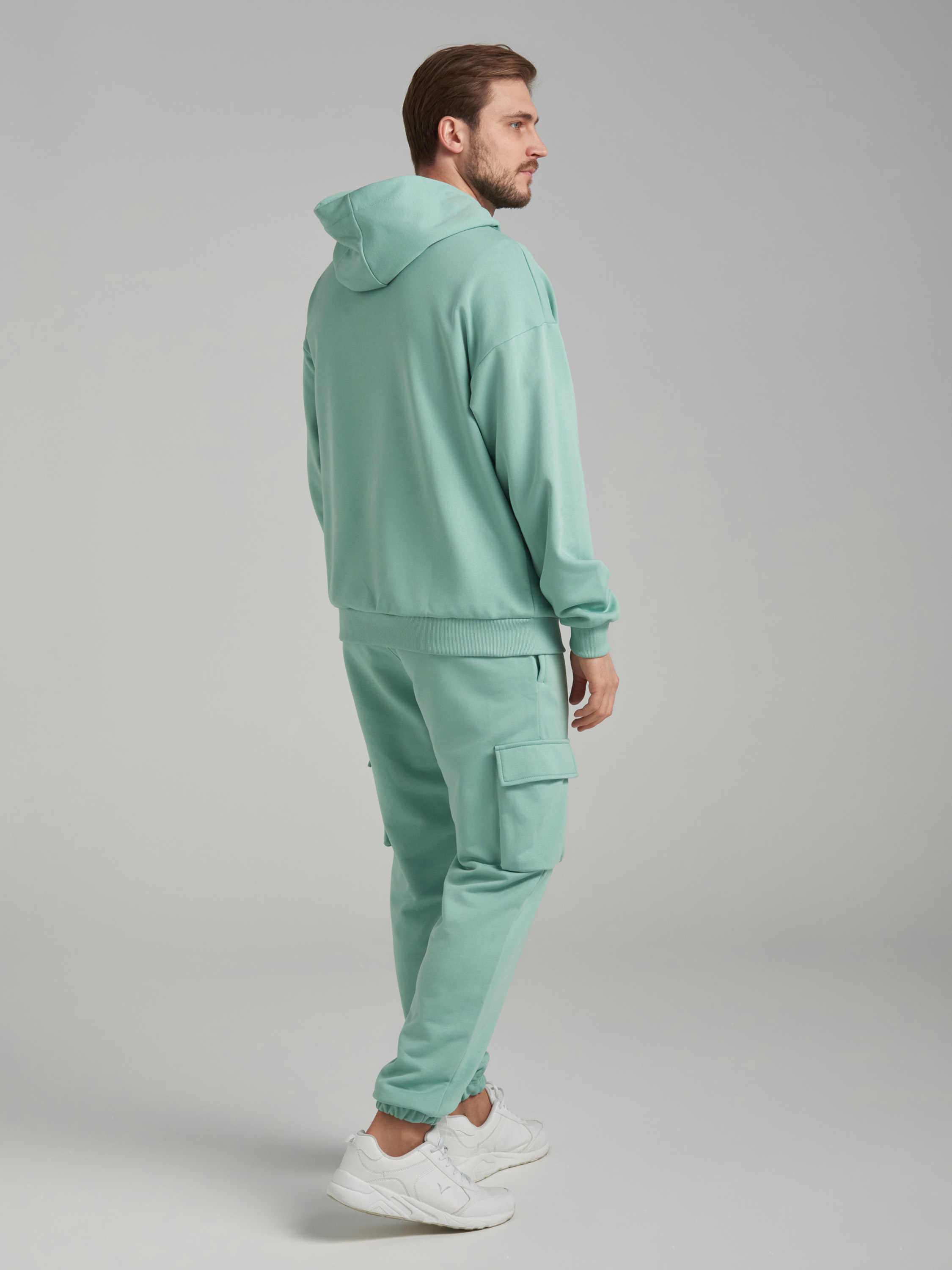 Мужской спортивный костюм из плотного трикотажа с петельной изнанкой. Верх комплекта - толстовка-худи с капюшоном, с накладным карманом "кенгуру". Рукава толстовки втачные, свободные со спущенной линией плеча, с эластичными манжетами. Брюки "Карго" с объемными накладными карманами с клапанамии имеют два кармана дополнительных в боковых подрезах. Брюки зауженны книзу на резинку. Пояс брюк эластичный, по линии талии дополнительно регулируется шнуром. 80% хлопок, 20% полиэстер
