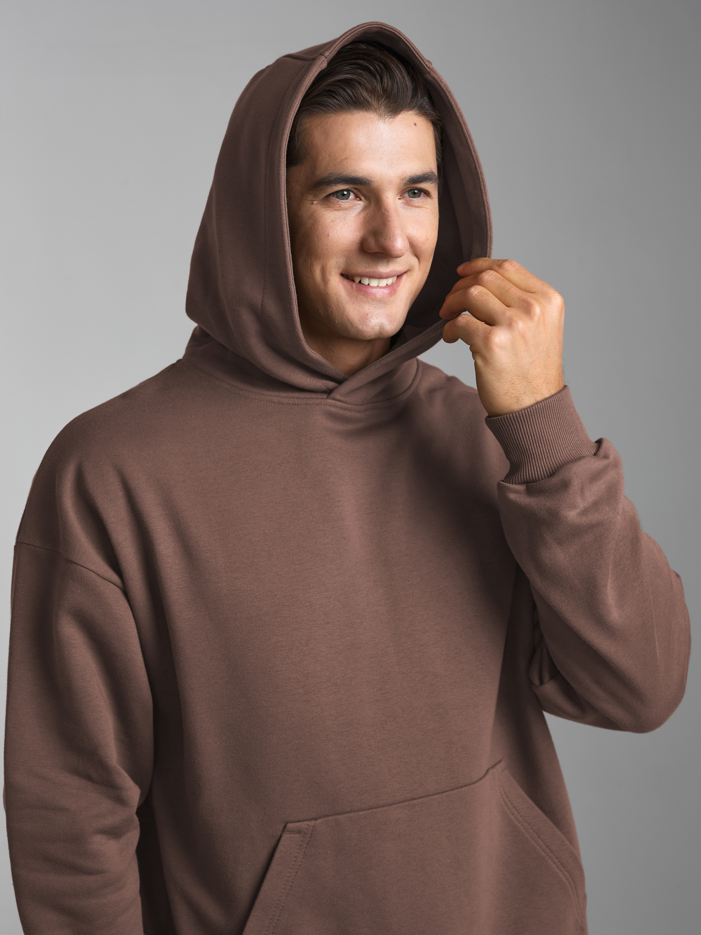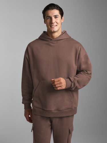 Мужской спортивный костюм из плотного трикотажа с петельной изнанкой. Верх комплекта - толстовка-худи с капюшоном, с накладным карманом "кенгуру". Рукава толстовки втачные, свободные со спущенной линией плеча, с эластичными манжетами. Брюки "Карго" с объемными накладными карманами с клапанамии имеют два кармана дополнительных в боковых подрезах. Брюки зауженны книзу на резинку. Пояс брюк эластичный, по линии талии дополнительно регулируется шнуром. 80% хлопок, 20% полиэстер