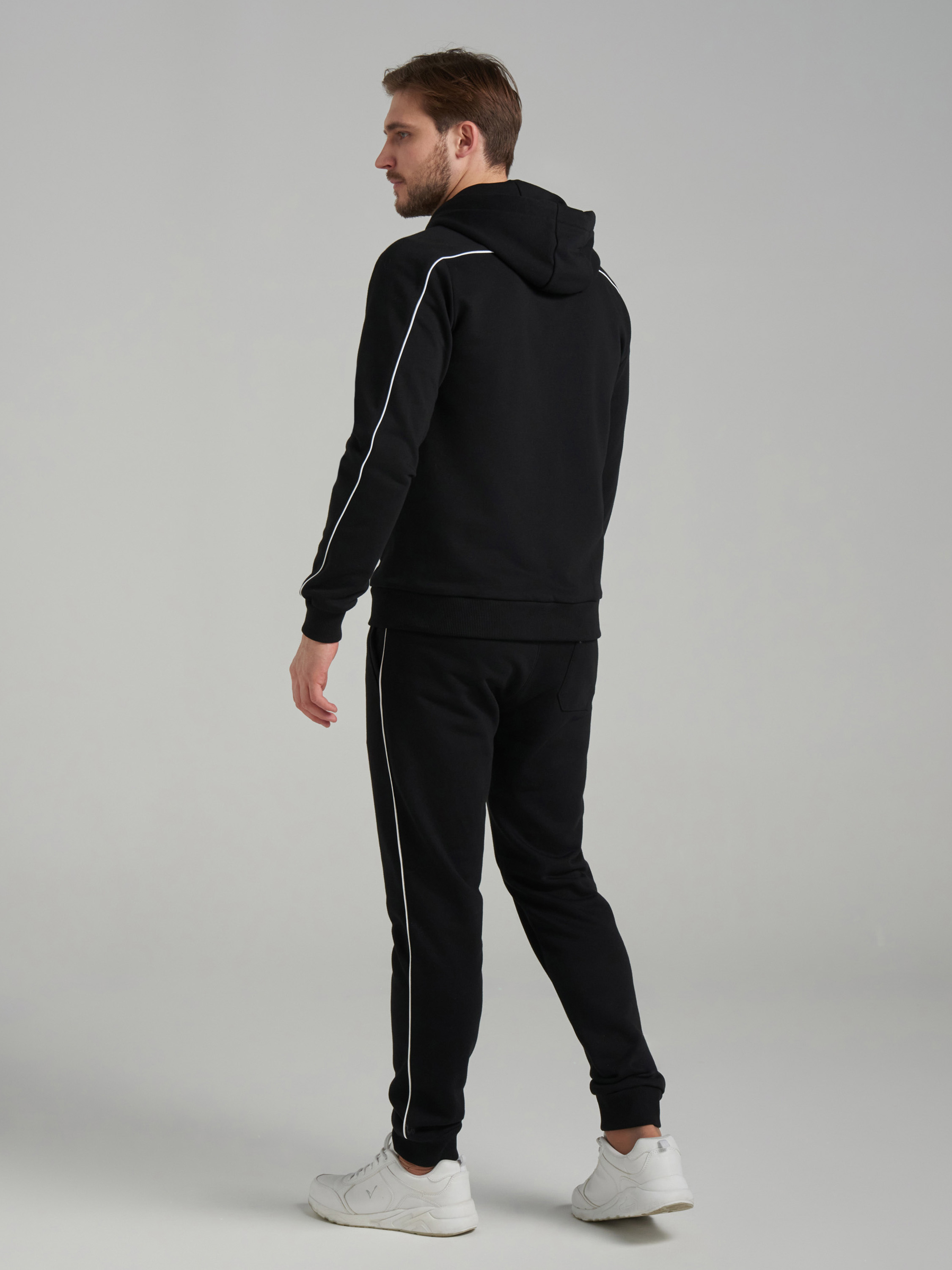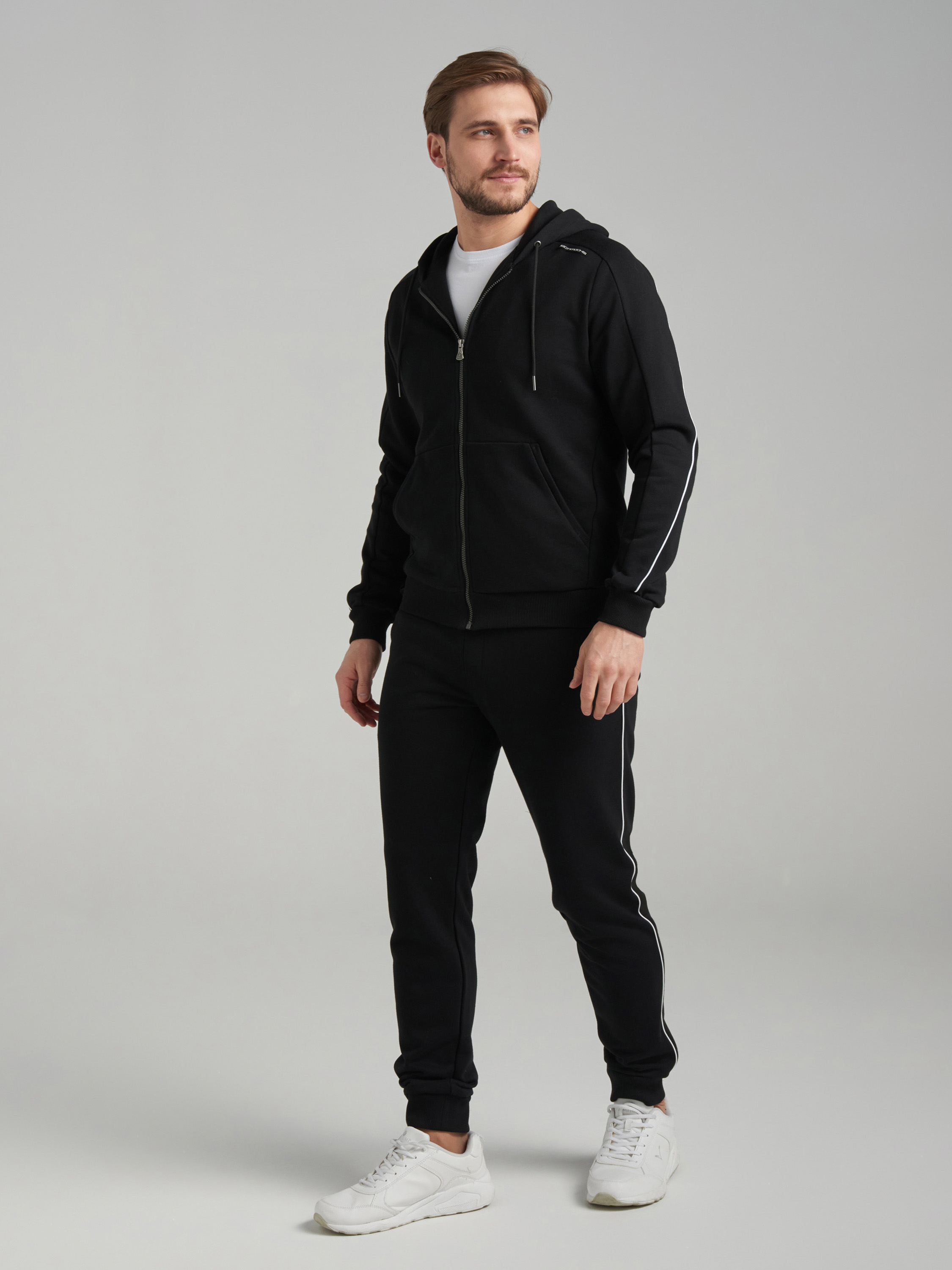 Спортивный костюм изготовлен из плотного хлопкового трикотажного полотна с петельной изнанкой. Куртка костюма на поясе, с капюшоном, застегивается на молнию. По плечам и верхней части рукавов есть вставка, отделанная белым кантом. Комфортный двухшовный капюшон по лицевой части регулируется шнуром. На куртке есть удобные накладные карманы «кенгуру». Пояс и манжеты куртки изготовлены из плотной эластичной трикотажной резинки. Брюки зауженные, низ брюк с манжетами. Передние карманы брюк в боковых подрезах, есть накладной задний карман, справа. Пояс брюк по линии талии с эластичной резинкой, дополнительно регулируется шнуром. На заднем кармане брюк, и под швом кокетки куртки - шевроны с фирменным логотипом. 65% хлопок, 35% полиэстер