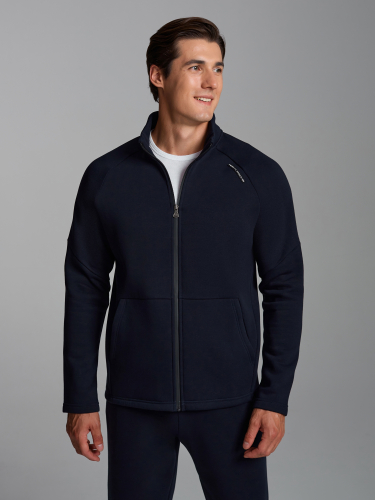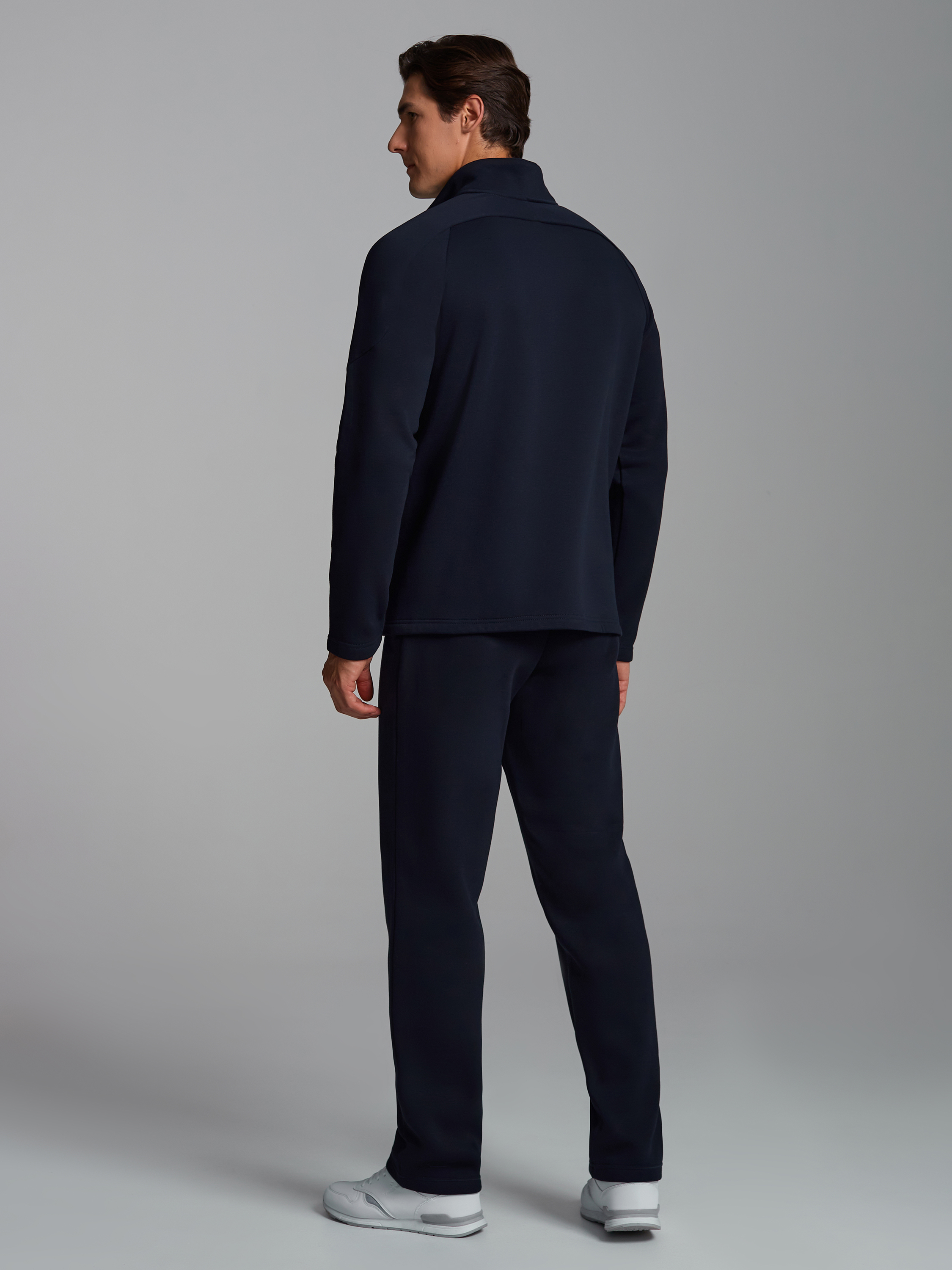 Спортивный костюм с вороником-стойкой, из трехниточного плотного трикотажа с начесом по изнанке.Рукава покроя реглан. Куртка застегивается на молнию.На куртке удобные карманы-кенгуру. На брюках два боковых кармана. Брюки прямого силуэта, низ брюк слегка заужен. Пояс брюк по линии талии с эластичной тесьмой дополнительно регулируется шнуром. Слева на кокетке куртки и на планке кармана брюк шеврон с фирменным логотипом. 65% хлопок, 35% полиэстер