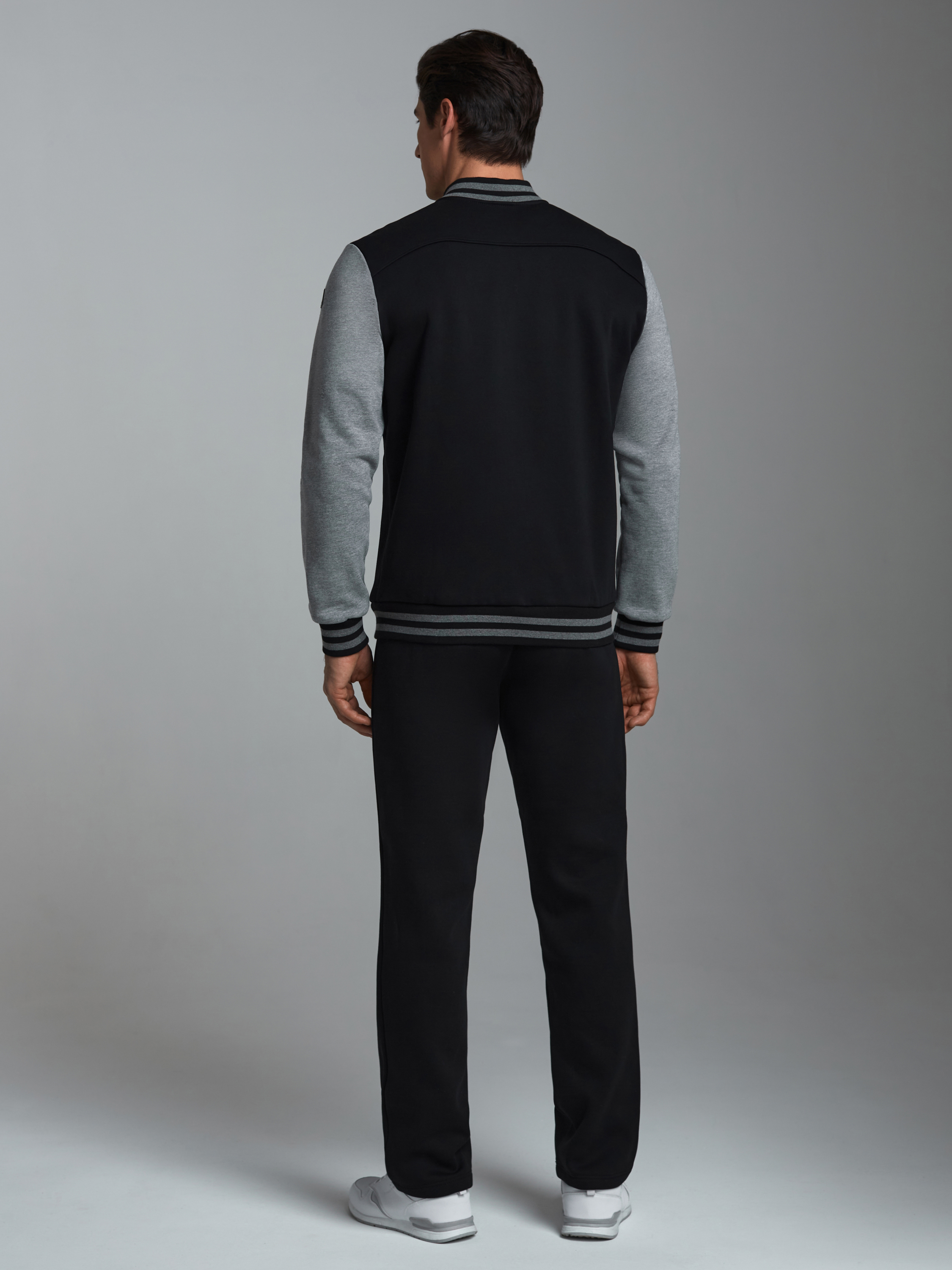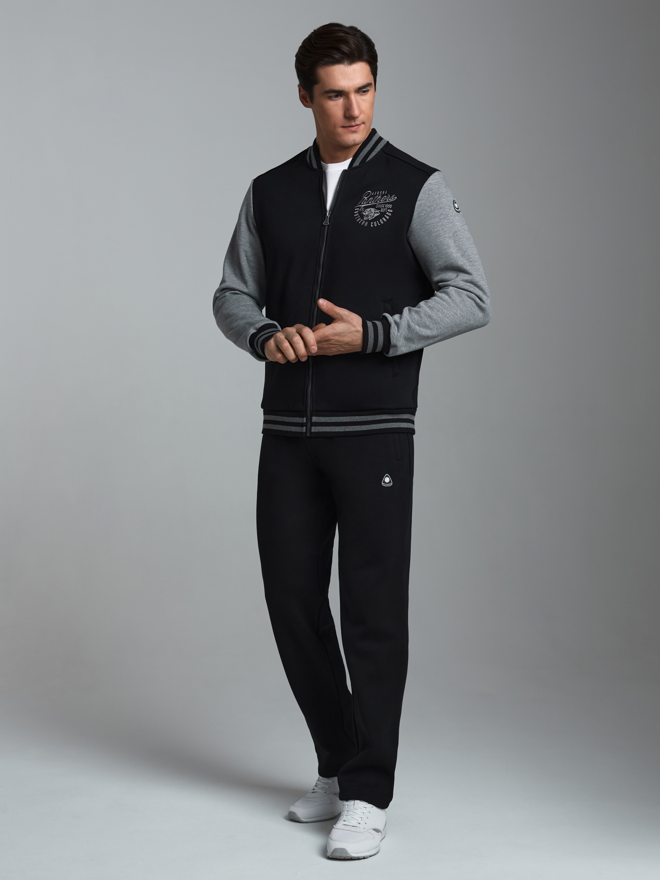 Спортивный костюм из плотного хлопкового трикотажного полотна с изнаночным начесом. Куртка на поясе с воротником, застегивается на молнию. Рукава втачные.Куртка скомбинирована из двух видов полотна, с контрастными рукавами. Яркость изделия подчеркивает клубная вышивка на груди и использование полосатого полотна для пояса, воротника и манжет куртки. Карманы куртки и брюк прорезные, с молниями . Брюки по низу заужены манжетами.Брюки прямого силуэта.Пояс брюк эластичный, по линии талии дополнительно регулируется шнурком. 65% хлопок, 35% полиэстер