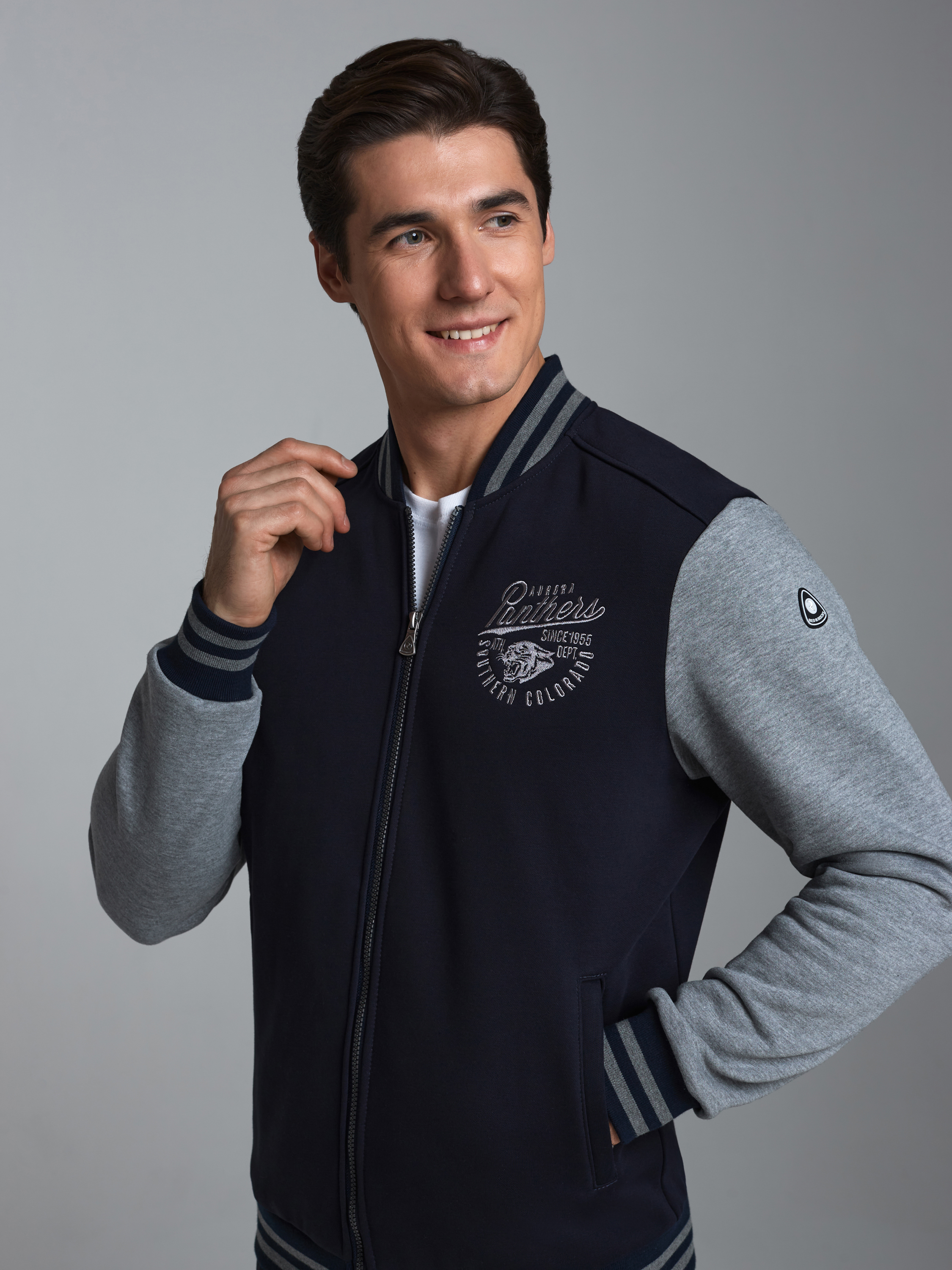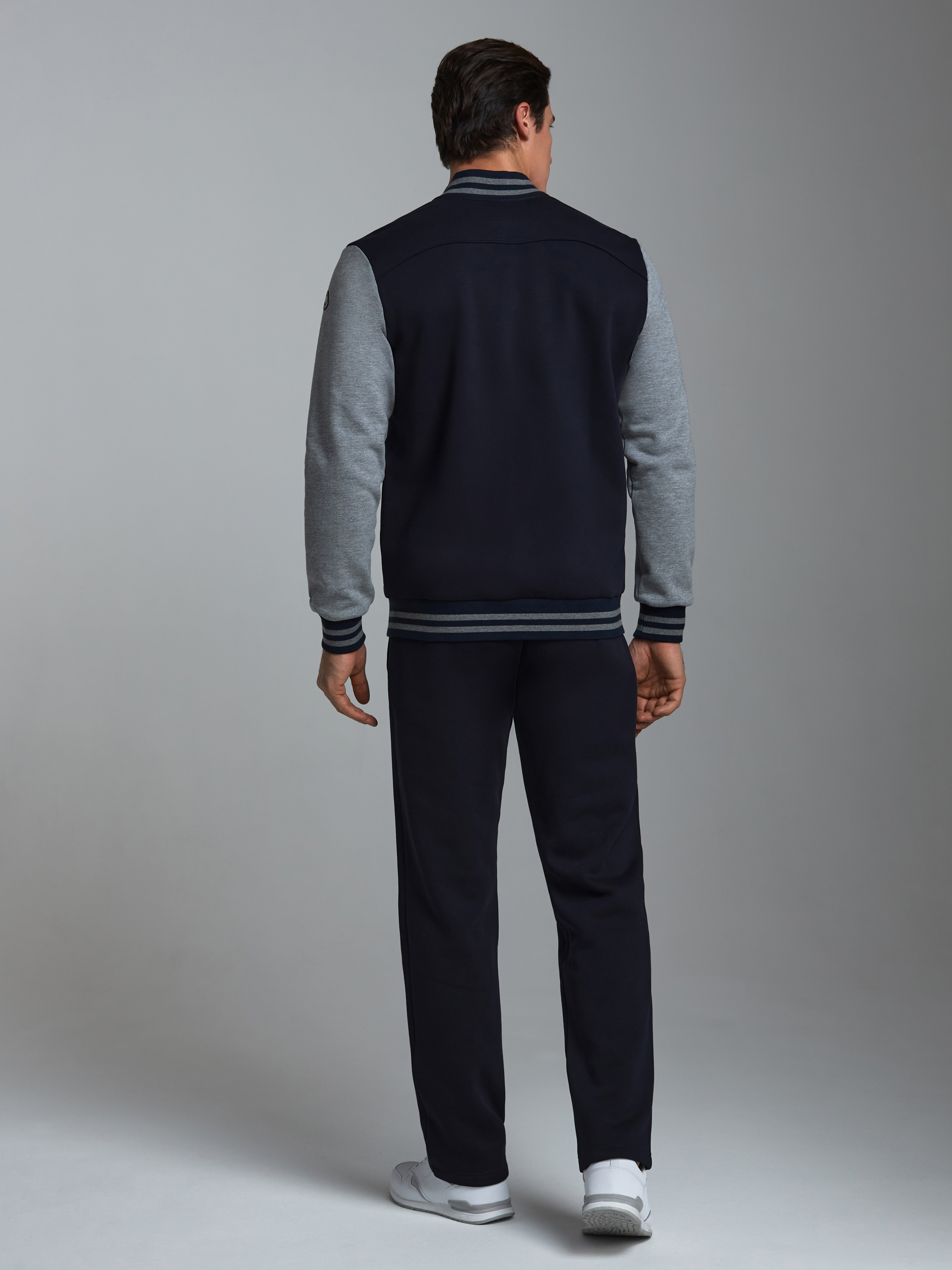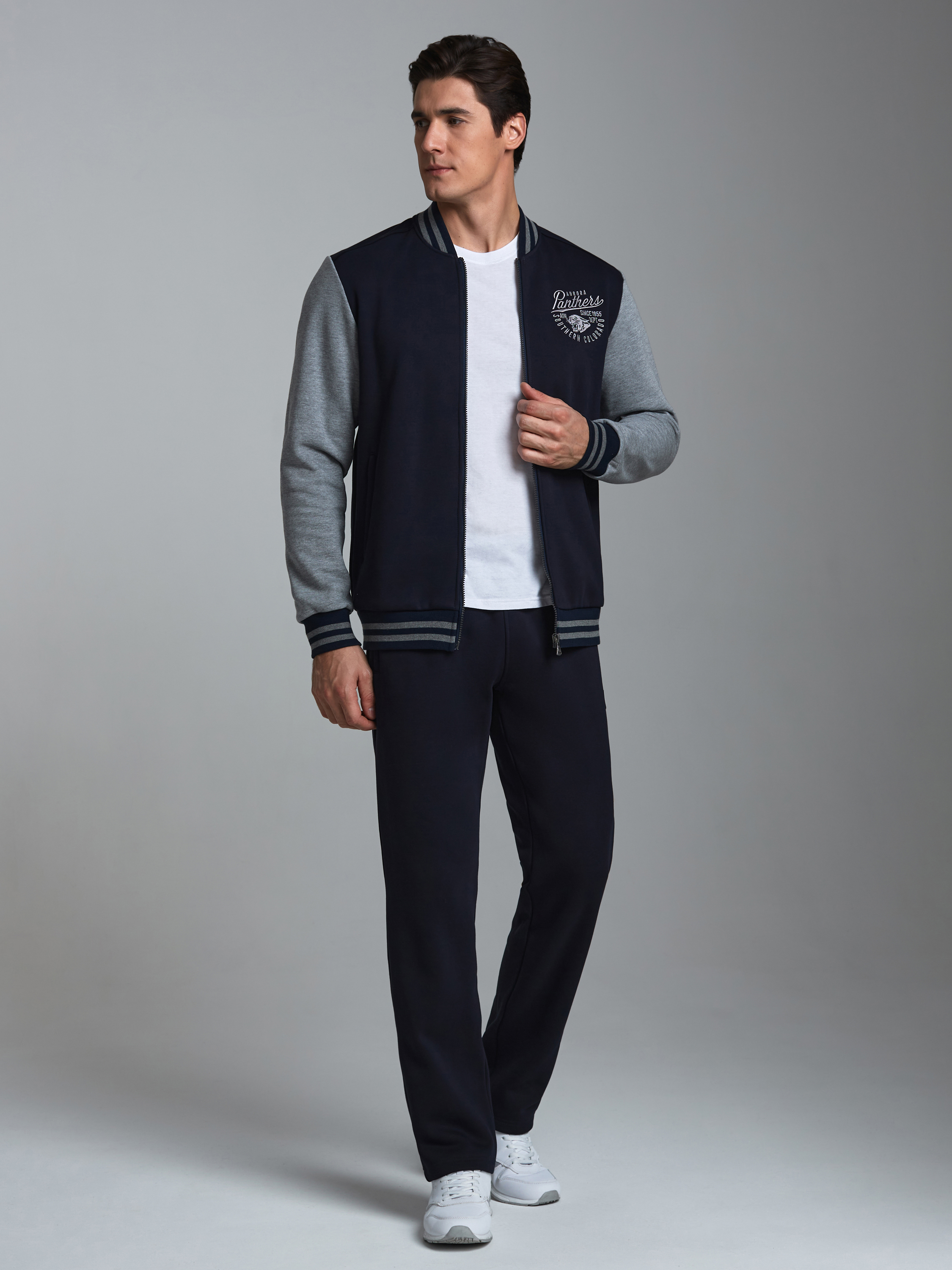 Спортивный костюм из плотного хлопкового трикотажного полотна с изнаночным начесом. Куртка на поясе с воротником, застегивается на молнию. Рукава втачные.Куртка скомбинирована из двух видов полотна, с контрастными рукавами. Яркость изделия подчеркивает клубная вышивка на груди и использование полосатого полотна для пояса, воротника и манжет куртки. Карманы куртки и брюк прорезные, с молниями . Брюки по низу заужены манжетами.Брюки прямого силуэта.Пояс брюк эластичный, по линии талии дополнительно регулируется шнурком. 65% хлопок, 35% полиэстер