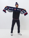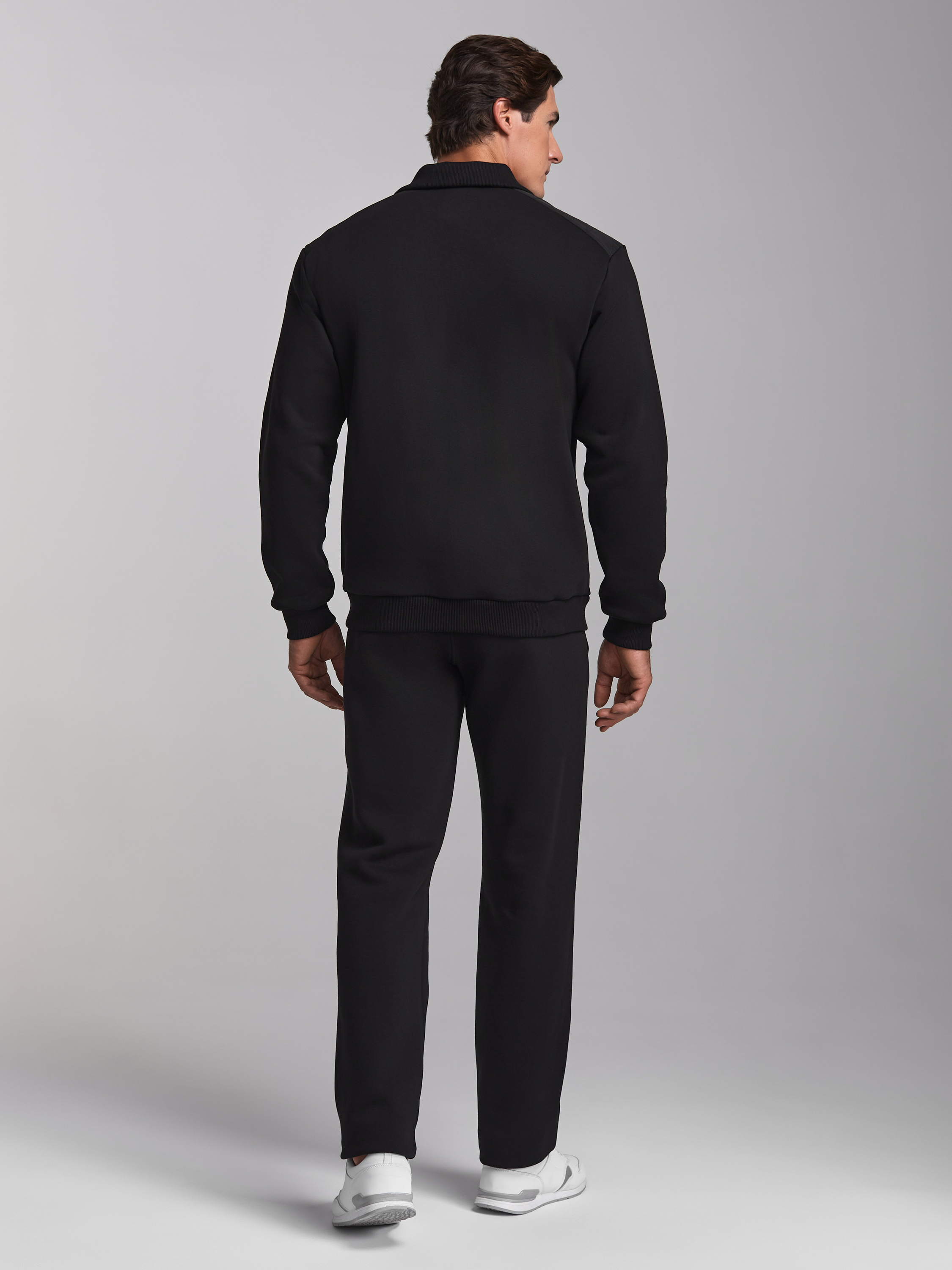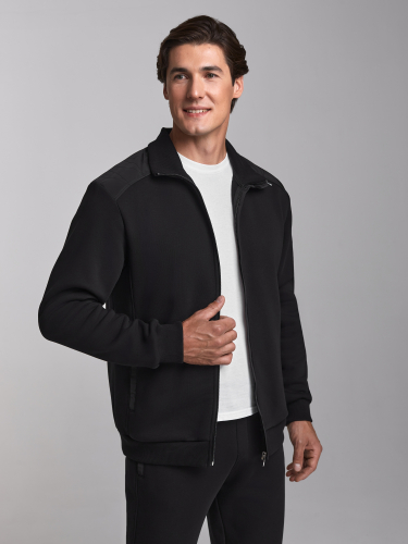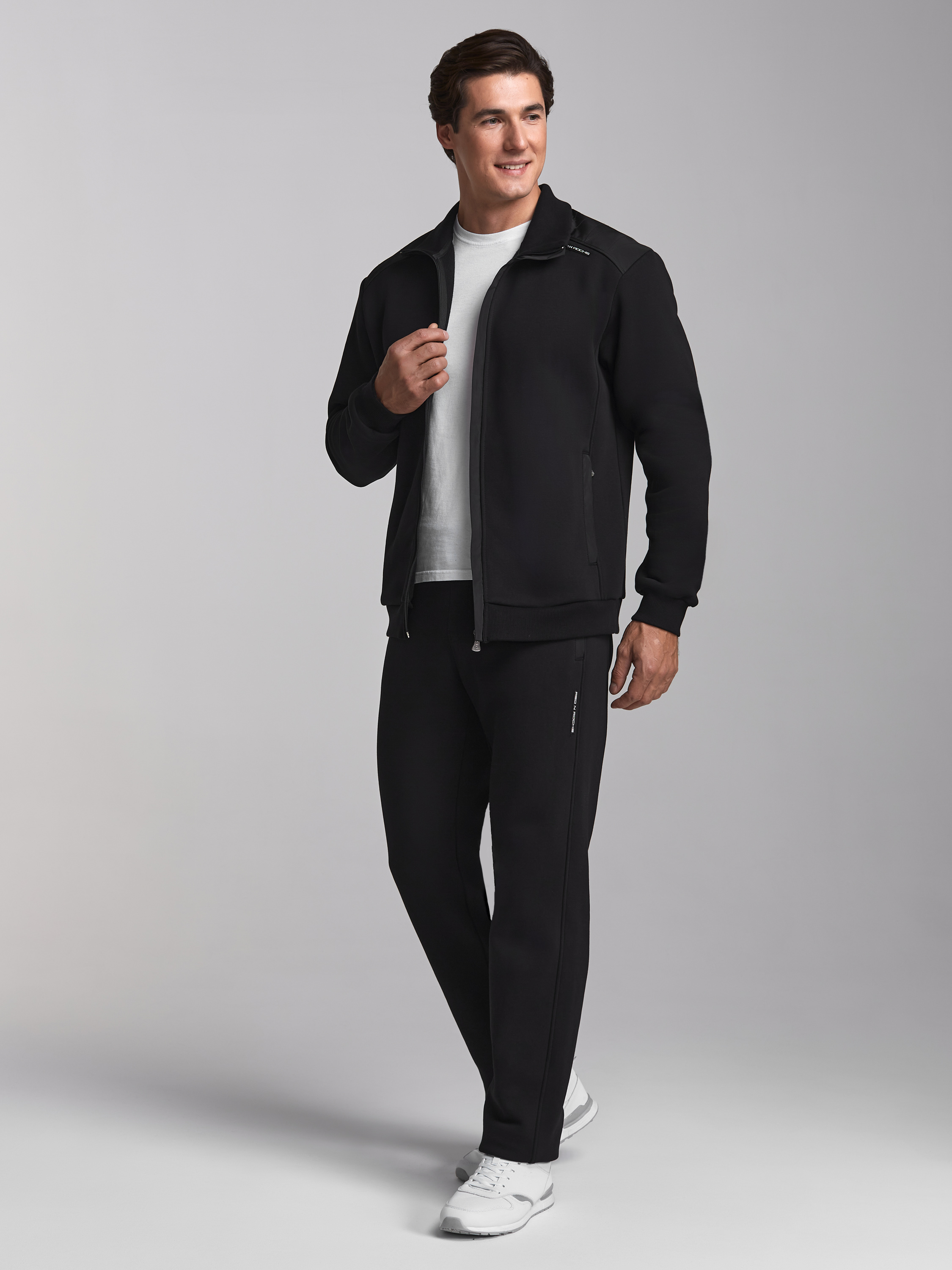 Спортивный костюм изготовлен из плотного хлопкового трикотажного полотна с изнаночным начесом и отделан плотной влагоотталкивающей плащевой тканью. Куртка костюма на поясе, с воротником, застегивается на молнию. Плечевые кокетки, нижний воротник и планки карманов куртки и брюк продублированы плащевой тканью. Кокетки и воротник дополнительно выстеганы фигурной строчкой. Молния куртки закрыта ветрозащитной планкой. Карманы куртки и брюк прорезные, застегиваются на молнии. Воротник, пояс и манжеты куртки изготовлены из плотной эластичной трикотажной резинки. Брюки прямые. Пояс брюк по линии талии с эластичной резинкой, дополнительно регулируется шнуром. Под швом кокетки на куртке и под карманом брюк - шевроны с фирменным логотипом. 65% хлопок, 35% полиэстер