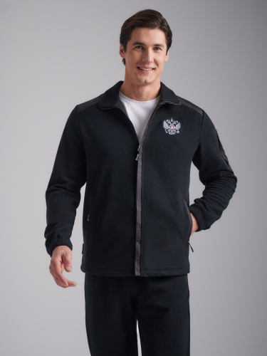 Мужской спортивный костюм из плотного хлопкового трикотажа с изнаночным начесом. Костюм состоит из куртки с воротником на молнии и брюк. Куртка свободного силуэта на поясе, рукава покроя реглан. На изделии много модных функциональных деталей. Кокетка, Прорезные боковые карманы куртки и брюк застегиваются на молнии. Брюки прямые В пояс брюк вшита эластичная резинка, ширина пояса дополнительно регулируется шнуром. На плече под швом кокетки и под карманом брюк слева - шеврон с фирменным логотипом. 65% хлопок, 35% полиэстер