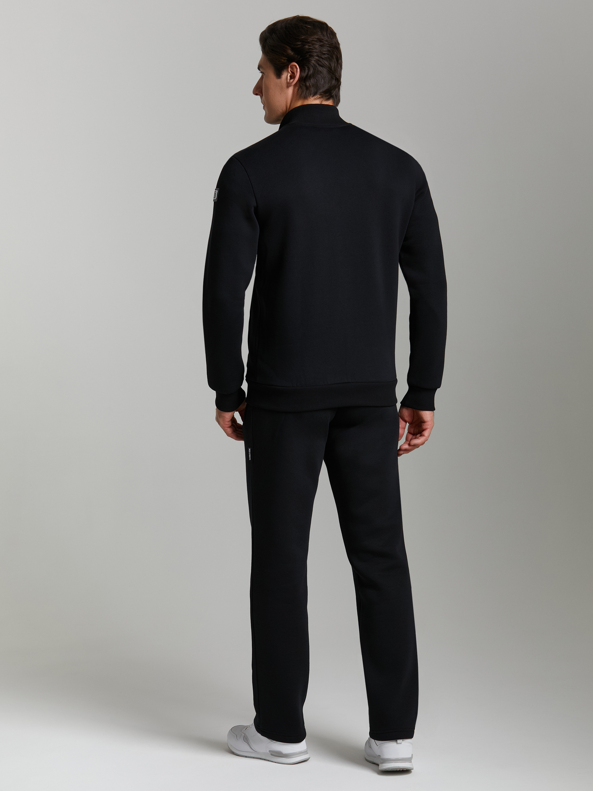 Мужской артикул 12M-RR-1830 черного цвета спортивный спортивный костюм из хлопкового трикотажного полотна с изнаночным начесом. Костюм состоит из удобной куртки на поясе, с воротником-стойкой, куртка застегивается на молнию. Рукава втачные. На рукаве слева настрочен фирменный шеврон с металлическим логотипом. Пояс, воротник и манжеты куртки изготовлены из эластичного полотна. Карманы куртки и брюк застегиваются на молнии. Брюки прямого силуэта, слегка заужены книзу. Пояс брюк по линии талии с эластичной резинкой, дополнительно регулируется шнуром. Костюм создан для комфортного отдыха и тренировок в прохладное время года. 65% хлопок, 35% полиэстер