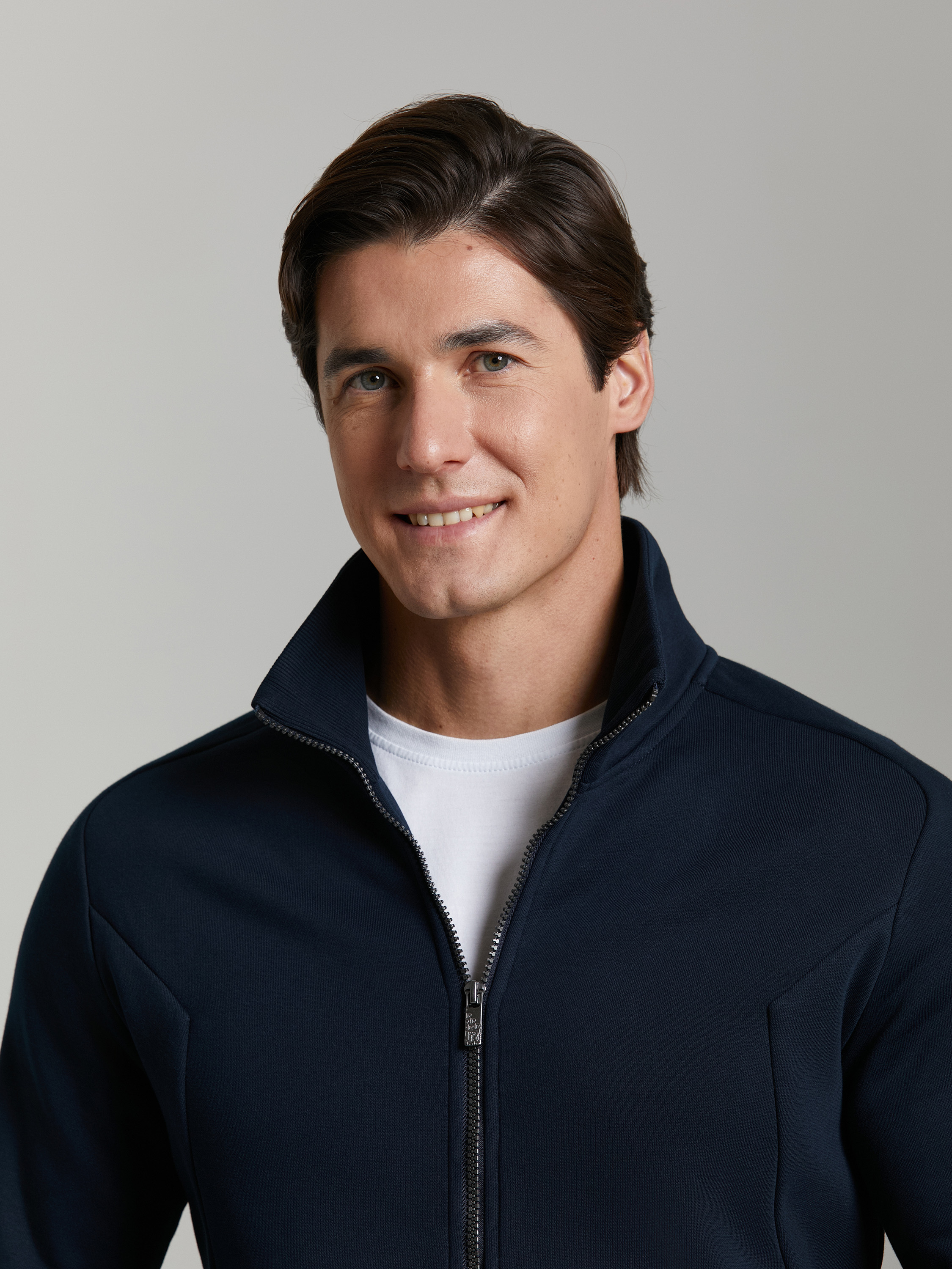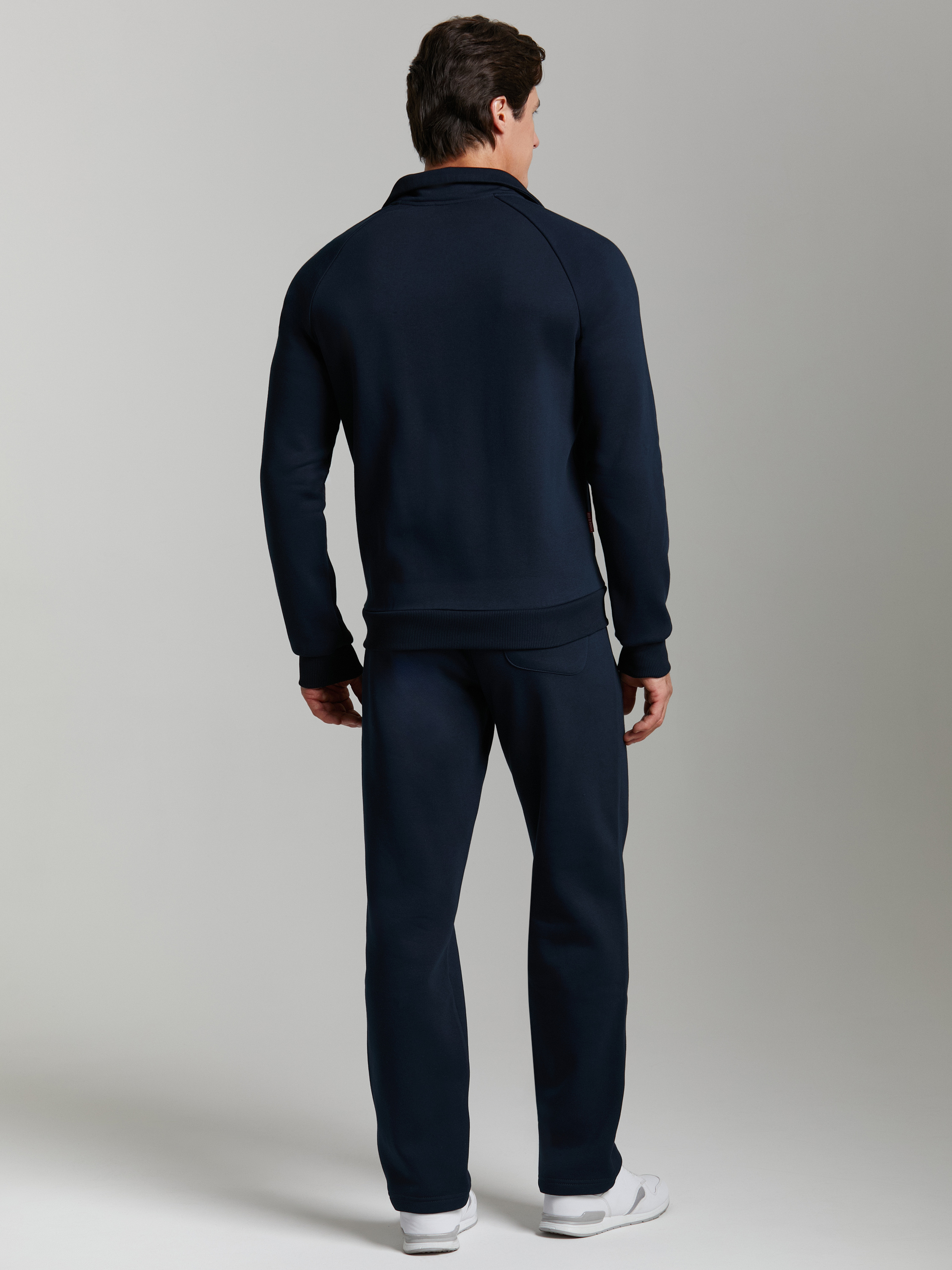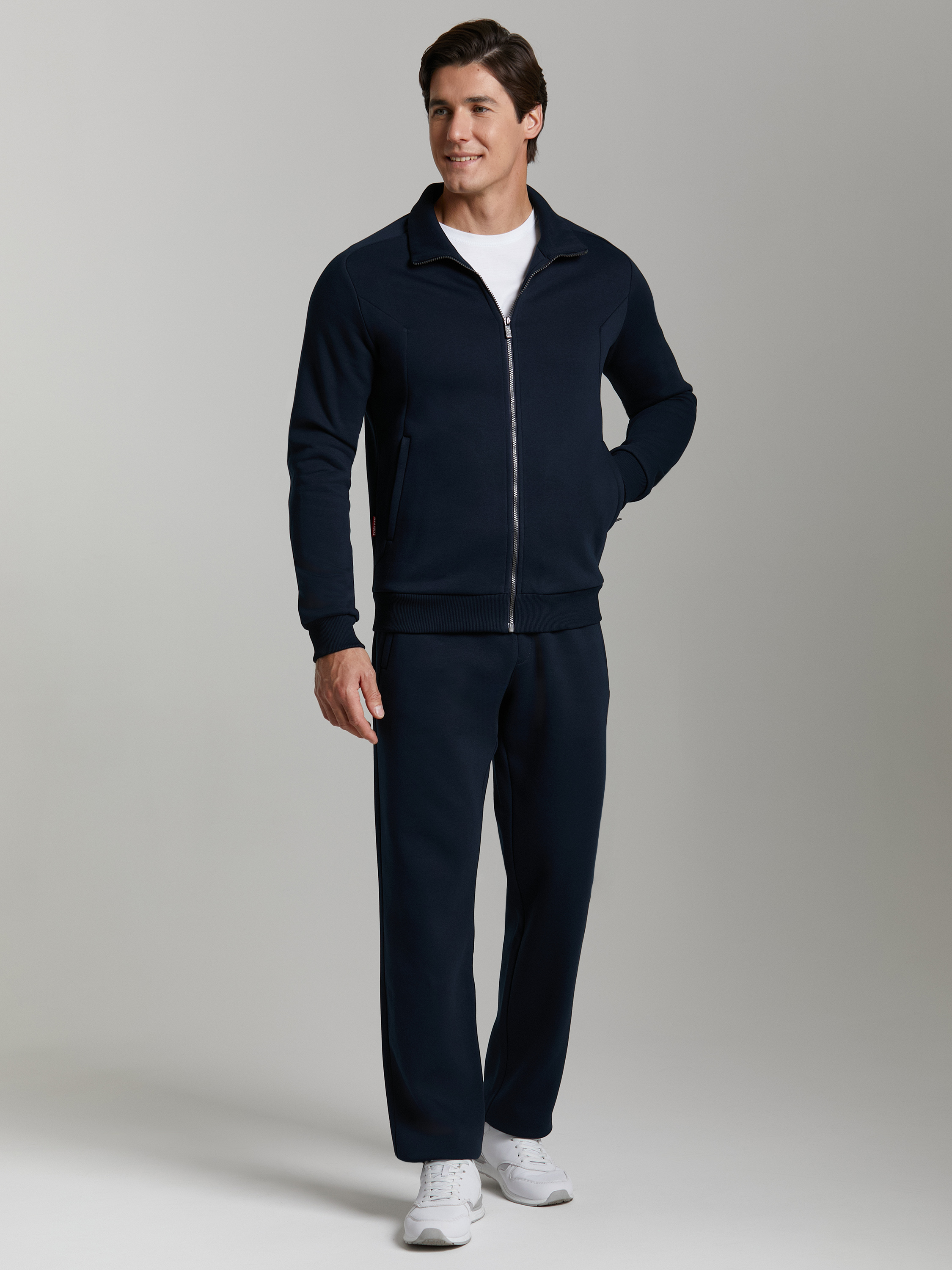 Мужской артикул 12M-RR-1863 темно-синего цвета спортивный спортивный костюм из хлопкового трикотажного полотна с изнаночным начесом. Костюм состоит из удобной куртки на поясе, с воротником-стойкой, куртка застегивается на молнию. Рукава покроя реглан. Угловые рельефы по переду куртки переходят в удобные наклонные карманы с молниями. На рукаве слева настрочен фирменный шеврон с металлическим логотипом. Пояс, воротник и манжеты куртки изготовлены из эластичного подкладочного материала. Карманы брюк с молниями так же выполнены в подрезах боковой вставки. Брюки прямого силуэта, слегка заужены книзу. Пояс брюк по линии талии с эластичной резинкой, дополнительно регулируется шнуром. Костюм создан для комфортного отдыха и тренировок в прохладное время года. 65% хлопок, 35% полиэстер
