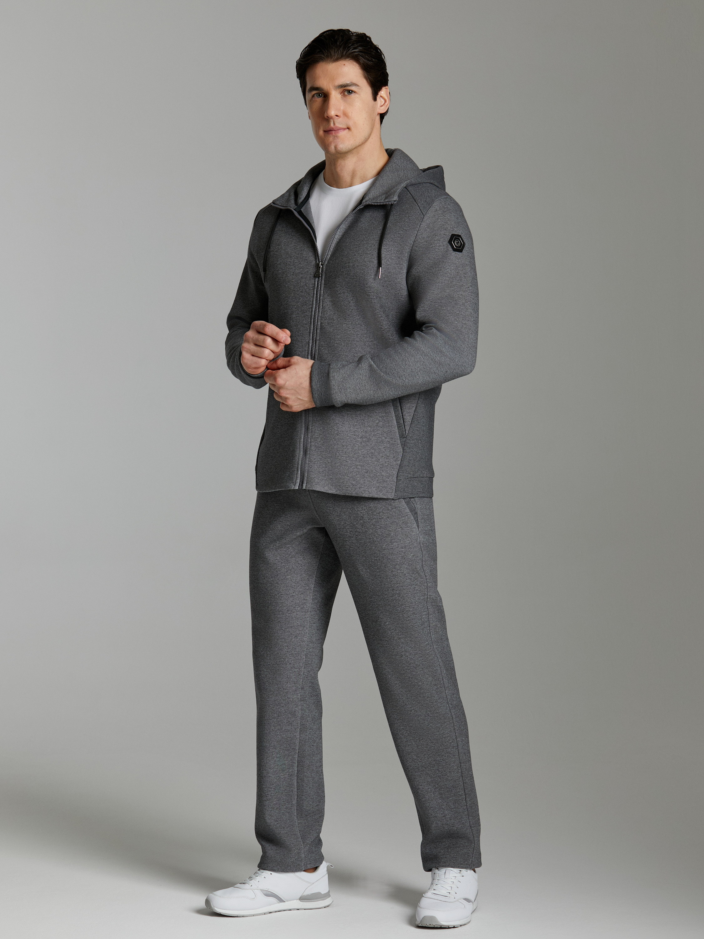 Современная модель мужского костюма из жаккардового трикотажного полотна. Куртка с капюшоном, на молнии, с карманом-кенгуру. Рукава покроя реглан, выполнены из контрастного трикотажного полотна. По низу куртки слегка заужен поясом, рукава с манжетами. Карманы брюк прорезные, наклонные. Низ брюк с манжетами. Пояс брюк эластичный, дополнительно регулируется шнуром. На слева на груди и на левой брючине под карманом - фирменный логотип. На правый рукав логотип нанесен методом термопечати. 80% хлопок, 20% полиэстер