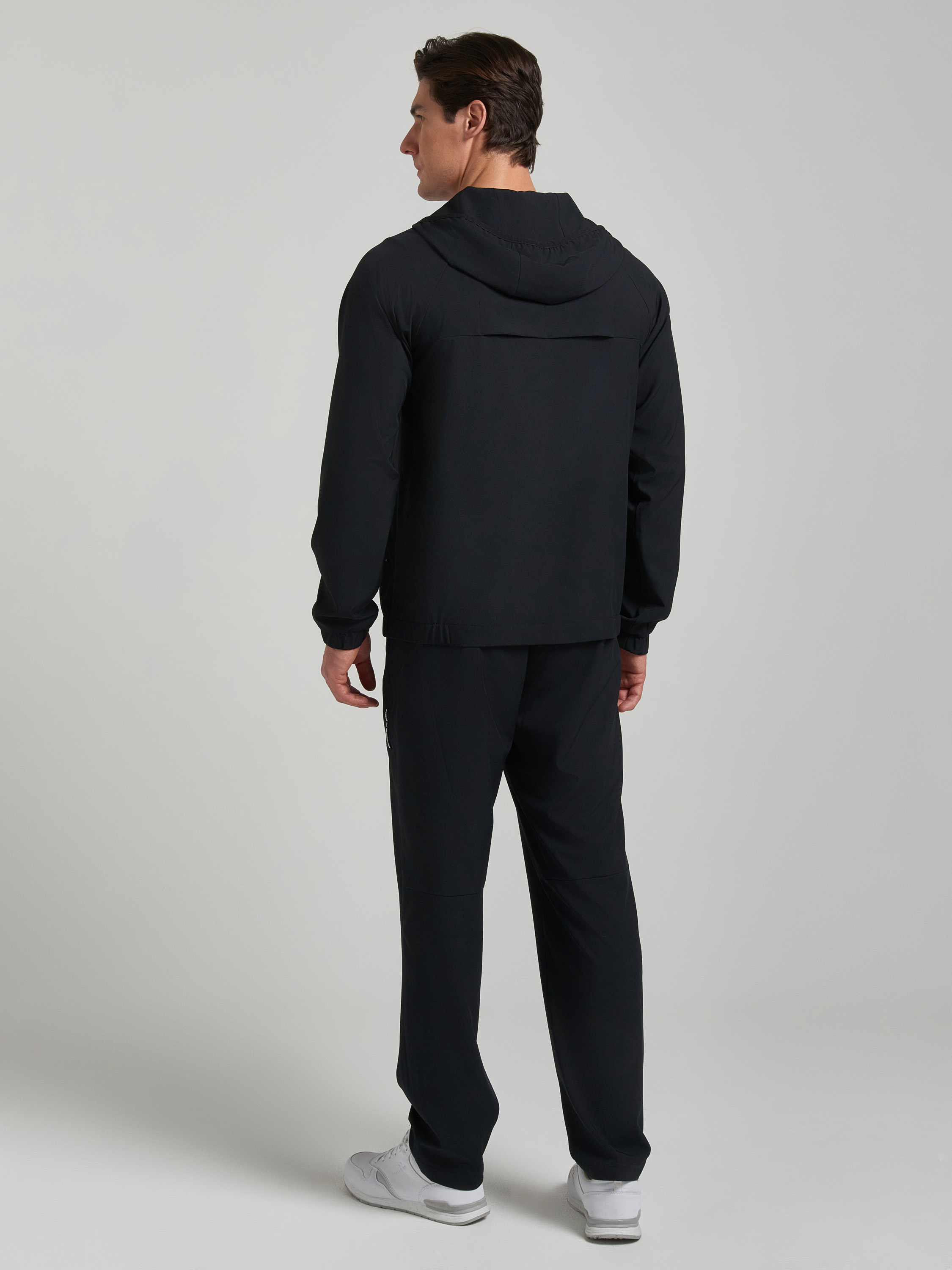 Костюм изготовлен из легкой плащевой ткани. Куртка на молнии, на поясе, с капюшоном, без подкладки. Спереди куртки - кокетки. В левой кокетке - карман с потайной молнией. В вертикальных рельефах выполнены удобные карманы с открытой молнией. На спинке отлетная кокетка с клапанами, обеспечивающими оптимальный воздухообмен. Лицевая часть капюшона окантована эластичной тесьмой. Брюки прямого силуэта, впереди прорезные карманы с молниями. На задних половинках брюк - кокетка, в шве которой расположен правый задний карман с молнией. Пояс брюк выполнен с широкой эластичной резиной, дополнительно фиксируется шнуром. 94% полиэстер, 6% лайкра