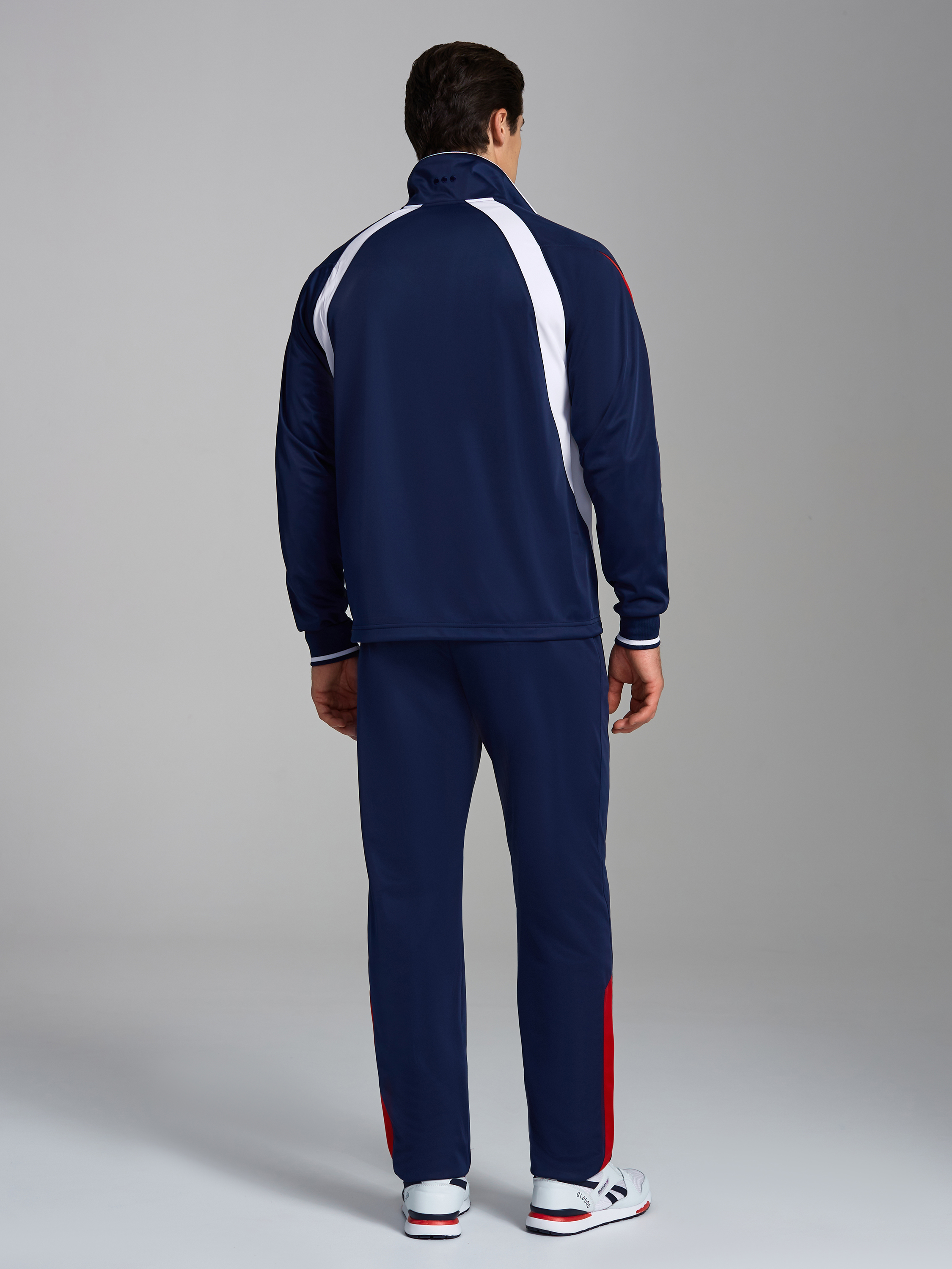 Спортивный костюм выполнен из полиэстровой ткани с изнаночным начесом. Карманы куртки расположены в шве отрезных бочков с листочками и молниями. На полочках и спинке выполненны отрезные детали белого цвета, что создает рельефность изделя. Воротник из основной ткани в двух разных контрастных цветах, на задней стороне воротника выполнена вышивка фирменного логотипа. По изу рукавов куртки вставлена эластичная рибана с цветными полосками. По рукавам выполнены отрезные вставки из контрастного цвета. Пояс в брюках из рибаны, по линии талии регулируется шнурком. Карманы прорезные на листочках и с молниями. На задней половине брюк выполнена отрезная фигурная кокетка. В нижней части брюк по боковому шву расположены контрастные вставки. На левой полочке вышивка "герб". На левой половине брюк вышивка в цвет основной ткани фирменного логотипа. 100% полиэстер