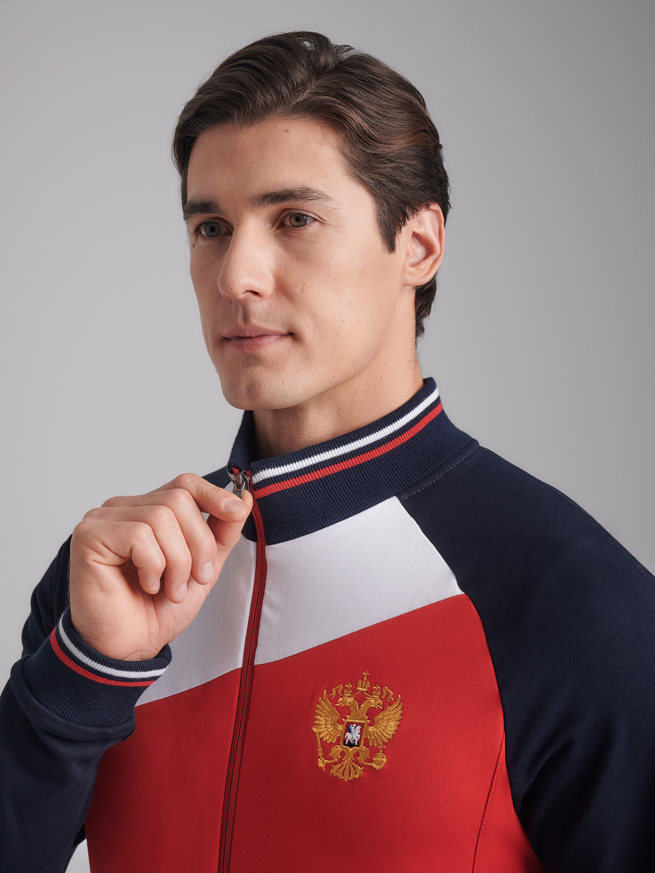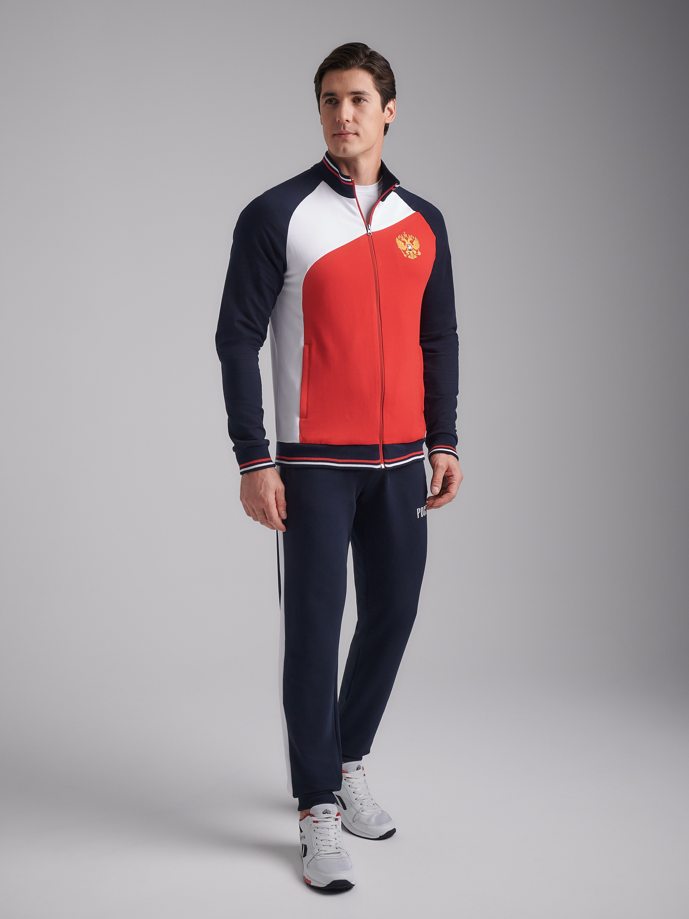 Спортивный костюм выполнен из хлопкового трикотажного полотна. Куртка с воротником на молнии. Низ куртки, рукавов и воротник из эластичного трикотажа с полосами. Спереди на куртке - контрастные вставки в цвет российского флага. карманы куртки в рельефах, застегиваются на молнию. на груди куртки слева - вышивка российского герба, на левом рукаве - шеврон российского флага. Брюки с контрастными боковыми вставками. Низ брюк с манжетами. Карманы брюк прорезные на молниях. слева под карманом - вышивка Россия. Пояс брюк дополнительно фиксируется шнуром