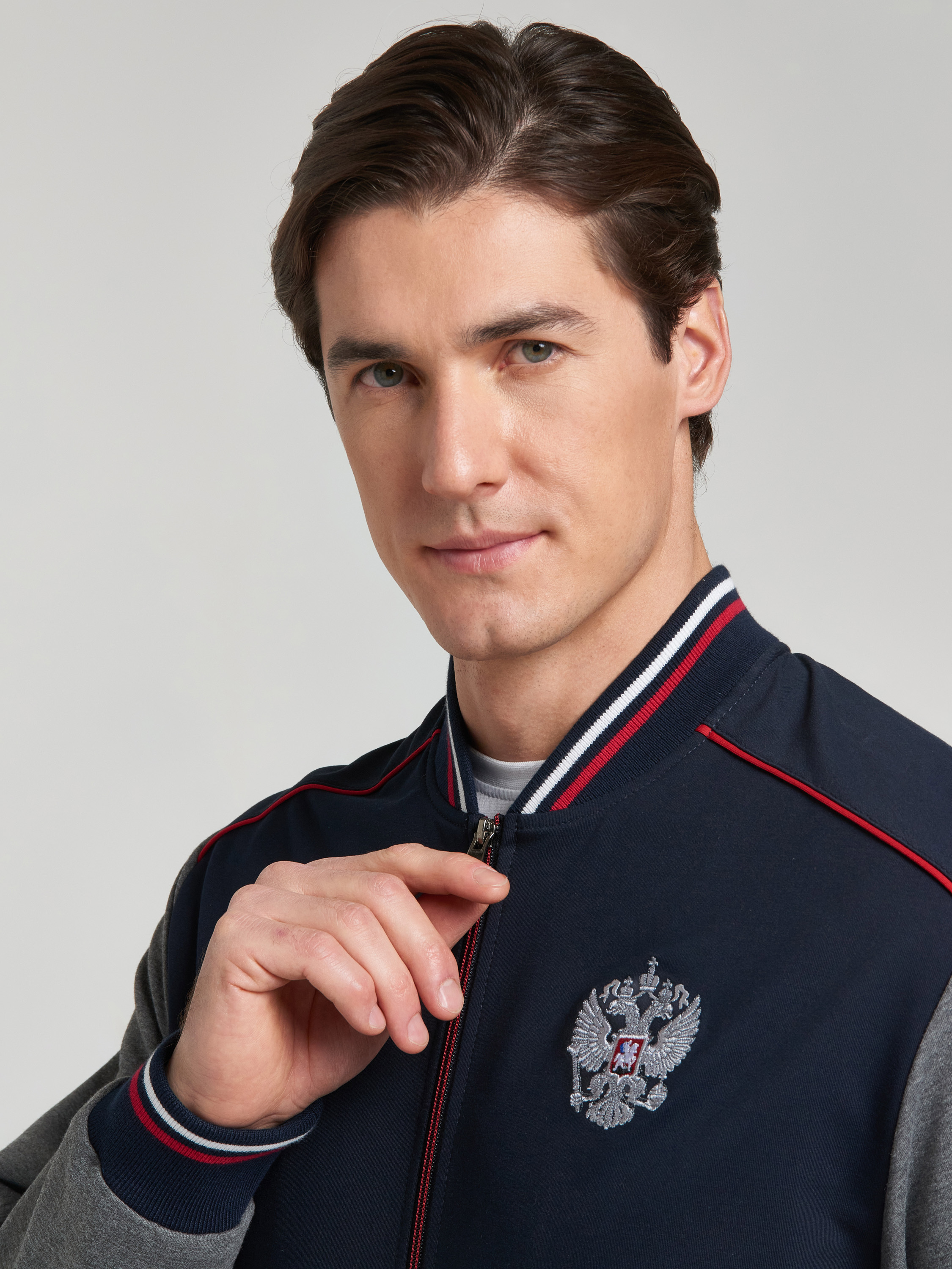 Спортивный костюм из хлопкового трикотажного полотна с элементами российской символики. Куртка костюма в стиле "бомбер" на поясе, с воротником-стойкой, застегивается на молнию. Рукава втачные из серого меланжевого полотна. Перед и спинка курки синего цвета. По плечевой кокетке проложен красный кант. Изделие богато украшено вышивками. На левой груди вышивка герба России. На спинке вышивка Россия, Russian Federation. На левом рукаве шеврон с российсим флагом. Пояс, воротник и манжеты куртки изготовлены из эластичного подвяза с красными белыми полосами. Карманы куртки и брюк прорезные, на молниях. Брюки прямого силуэта, слегка заужены книзу. Под левым карманом брюк вышивка Россия.Пояс брюк по линии талии с эластичной резинкой, дополнительно регулируется шнуром. 77% хлопок, 17% полиэстер, 6% эластан