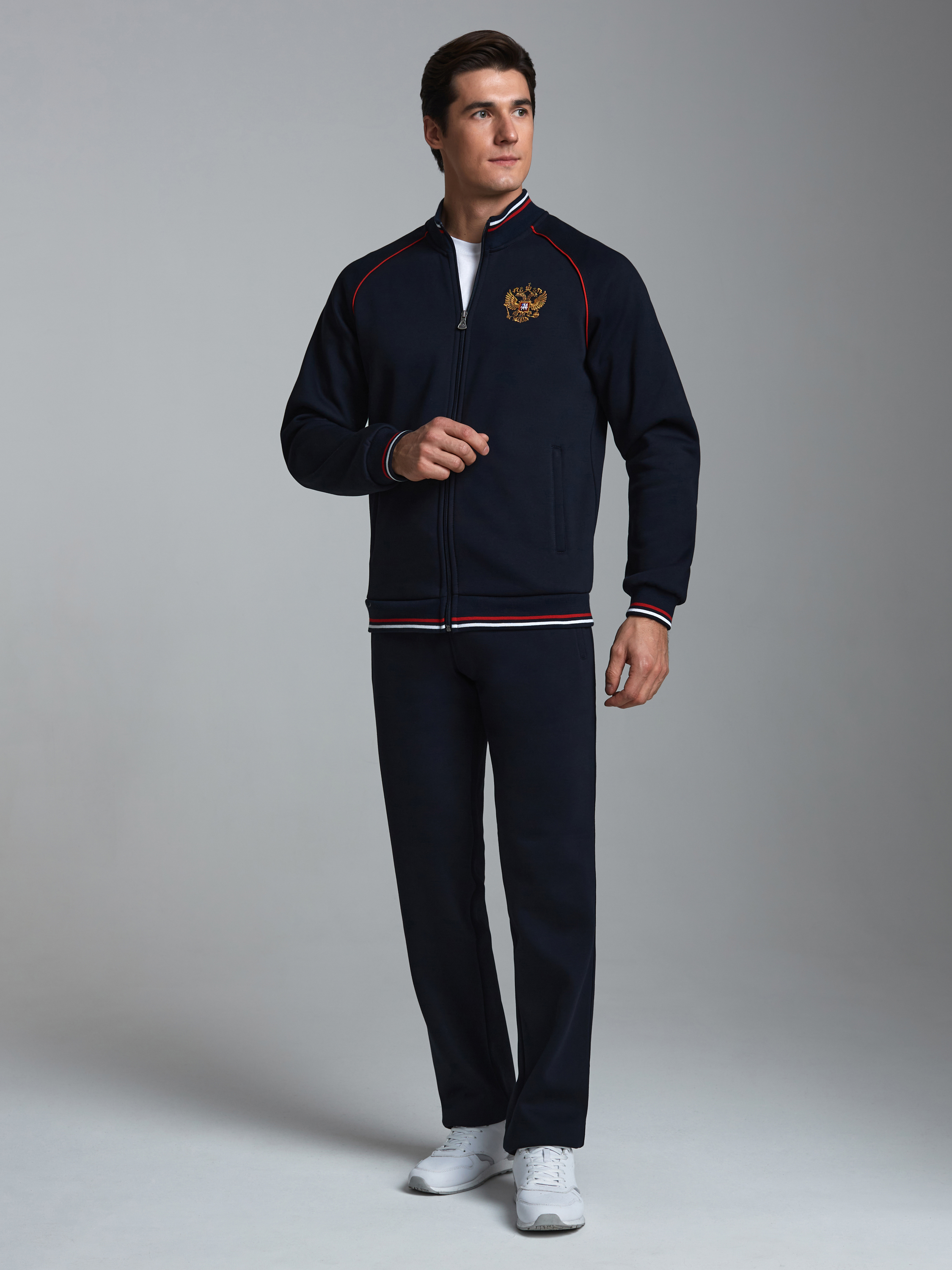 Спортивный костюм из хлопкового трикотажного полотна с начесом. Куртка на поясе с воротником, застегивается на молнию. Рукава покроя реглан, шов втачивания рукавов выделен красным кантом. Карманы куртки прорезные с планками, застегиваются на молнию . На груди куртки слева - вышивка - герб России.. Воротник, манжеты и пояс куртки выполнены из полосатого эластичного трикотажа. Брюки прямые, с прорезными карманами на молнии .Пояс брюк эластичный, по линии талии дополнительно регулируется шнурком.
