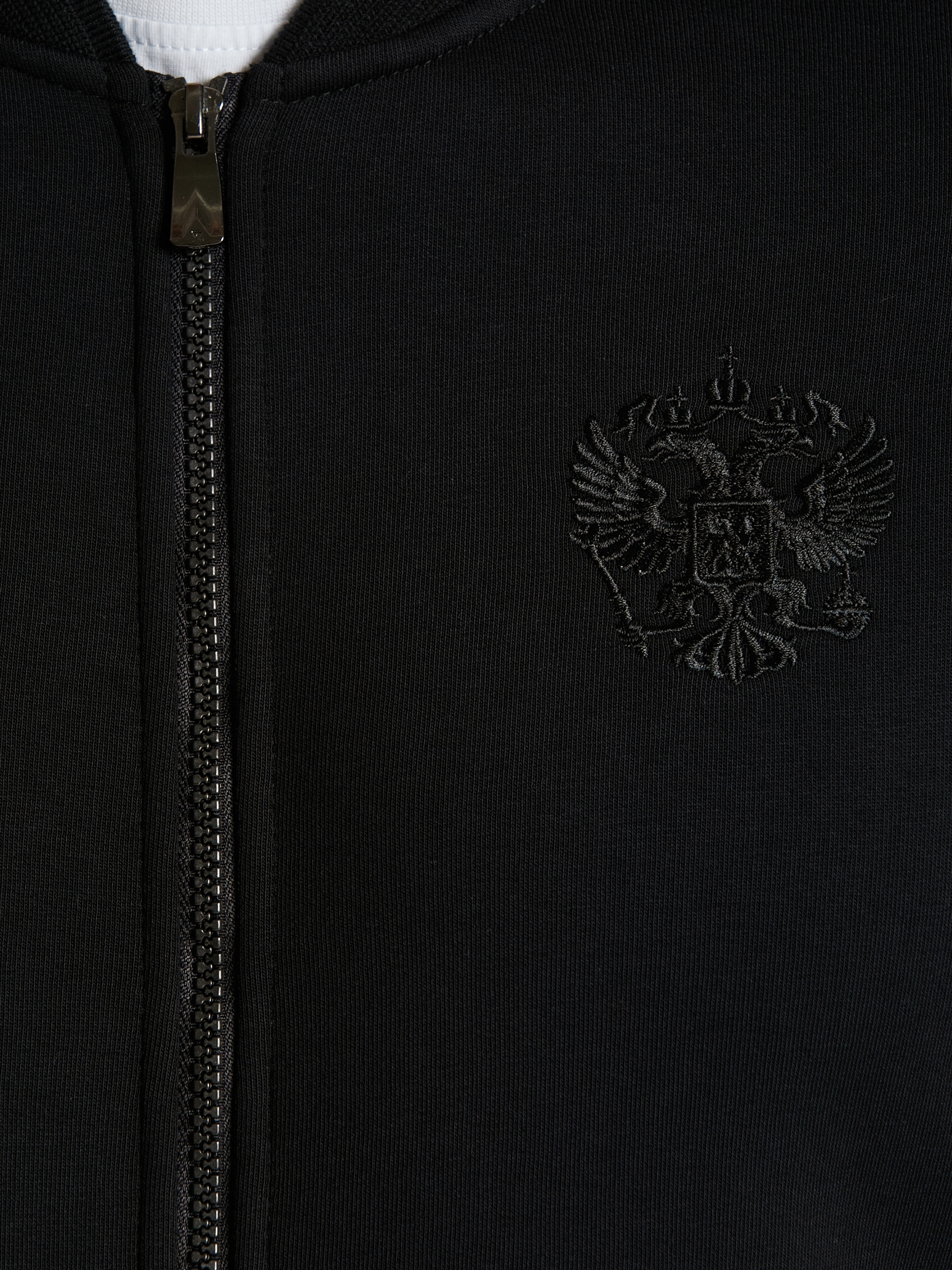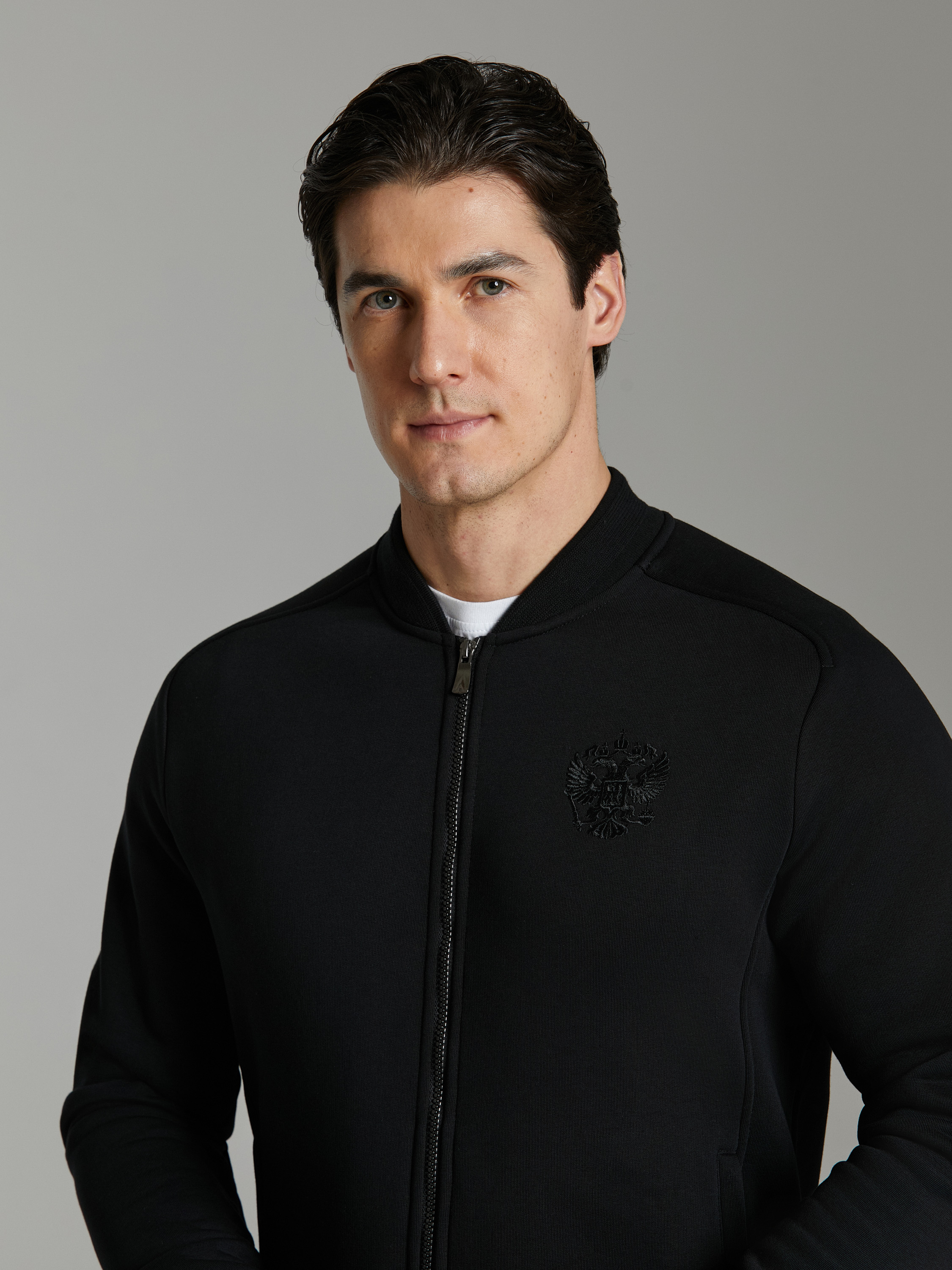 Спортивный костюм изготовлен из плотного хлопкового трикотажного полотна с изнаночным начесом. Куртка костюма на поясе, с воротником-стойкой, застегивается на молнию. Костюм оформлен вышивками с российской символикой. На куртке, на груди слева вышит герб России, на спине надпись РОССИЯ. Все вышивки выполнены шелковыми нитями в цвет ткани. Рукава куртки покроя реглан. Воротник, пояс и манжеты куртки изготовлены из плотной эластичной трикотажной резинки с рельефной полосой. Карманы куртки и брюк прорезные, с молниями. Брюки прямые. Пояс брюк по линии талии с эластичной резинкой, дополнительно регулируется шнуром. Под левым карманом брюк вышивка РОССИЯ. 65% хлопок, 35% полиэстер