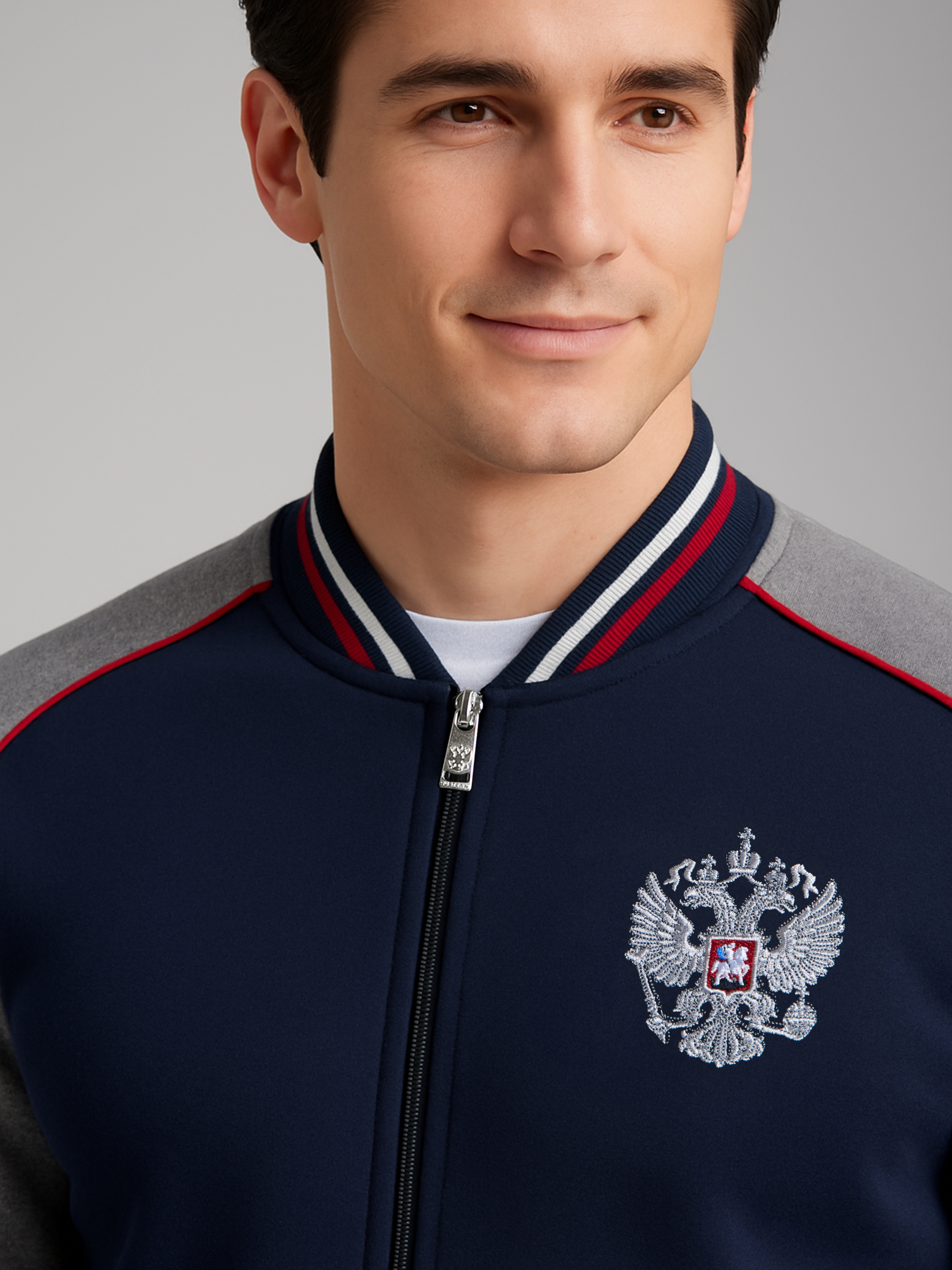 Мужской артикул 12M-RT-1860 темно-синего цвета спортивный спортивный костюм из хлопкового трикотажного полотна с изнаночным начесом с элементами российской символики. Куртка костюма в стиле "бомбер" на поясе, с воротником-стойкой, застегивается на молнию. Рукава покроя реглан из серого меланжевого полотна. Перед и спинка куртки темно-синего цвета. По плечевой кокетке проложен красный кант. Изделие богато украшено вышивками. На левой груди вышивка герба России. На спинке вышивка Россия. На левом рукаве шеврон с российским флагом. Пояс, воротник и манжеты куртки изготовлены из темно-синего эластичного подкладочного материала с красными и белыми полосами. Карманы куртки и брюк прорезные, на молниях, выделены ярко-красными кантами. Брюки темно-синие, прямого силуэта, слегка заужены книзу. Под левым карманом брюк вышивка Россия. Пояс брюк по линии талии с эластичной резинкой, дополнительно регулируется шнуром.