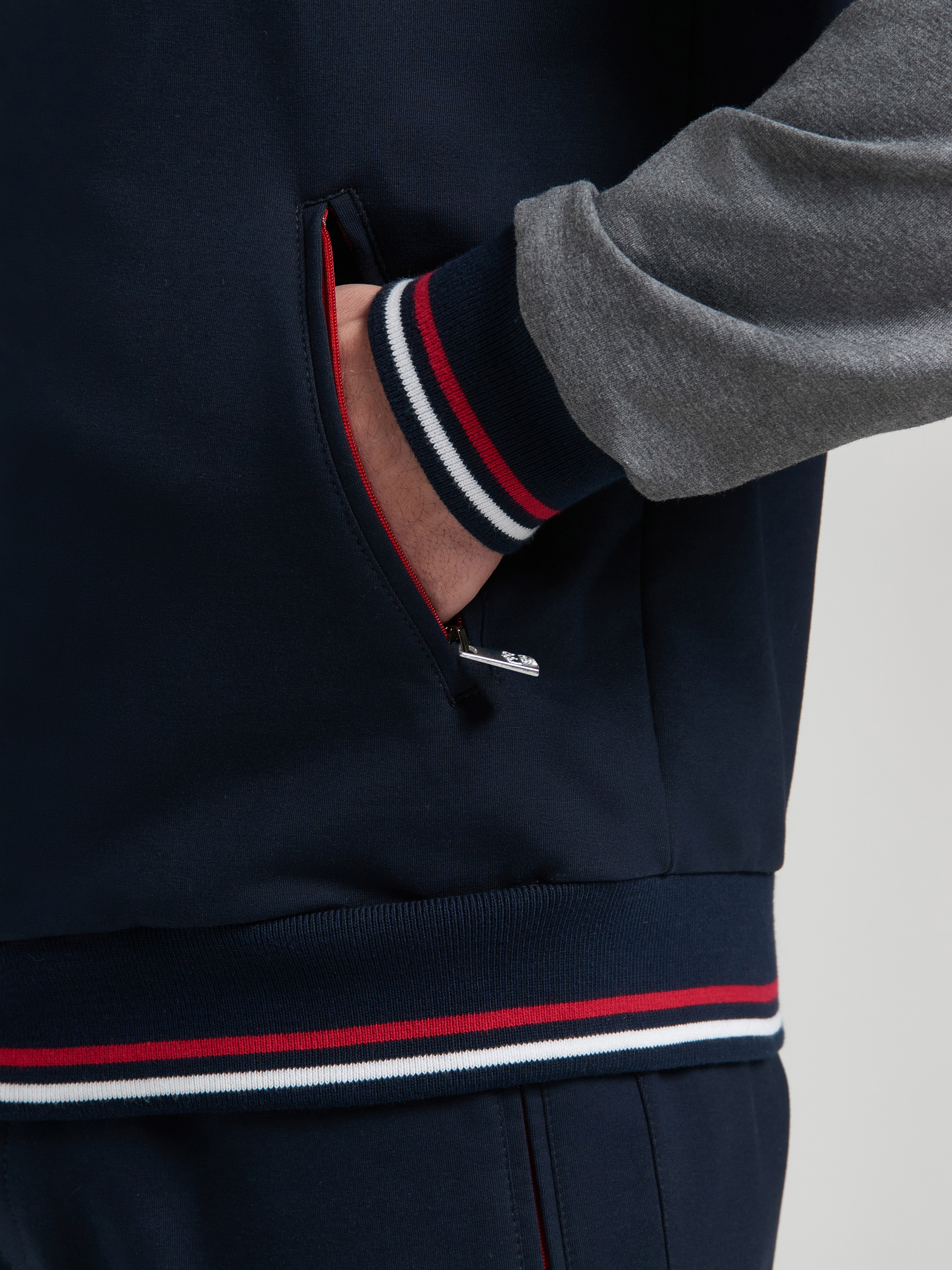Мужской артикул 12M-RT-1860 темно-синего цвета спортивный спортивный костюм из хлопкового трикотажного полотна с изнаночным начесом с элементами российской символики. Куртка костюма в стиле "бомбер" на поясе, с воротником-стойкой, застегивается на молнию. Рукава покроя реглан из серого меланжевого полотна. Перед и спинка куртки темно-синего цвета. По плечевой кокетке проложен красный кант. Изделие богато украшено вышивками. На левой груди вышивка герба России. На спинке вышивка Россия. На левом рукаве шеврон с российским флагом. Пояс, воротник и манжеты куртки изготовлены из темно-синего эластичного подкладочного материала с красными и белыми полосами. Карманы куртки и брюк прорезные, на молниях, выделены ярко-красными кантами. Брюки темно-синие, прямого силуэта, слегка заужены книзу. Под левым карманом брюк вышивка Россия. Пояс брюк по линии талии с эластичной резинкой, дополнительно регулируется шнуром. 65% хлопок, 35% полиэстер