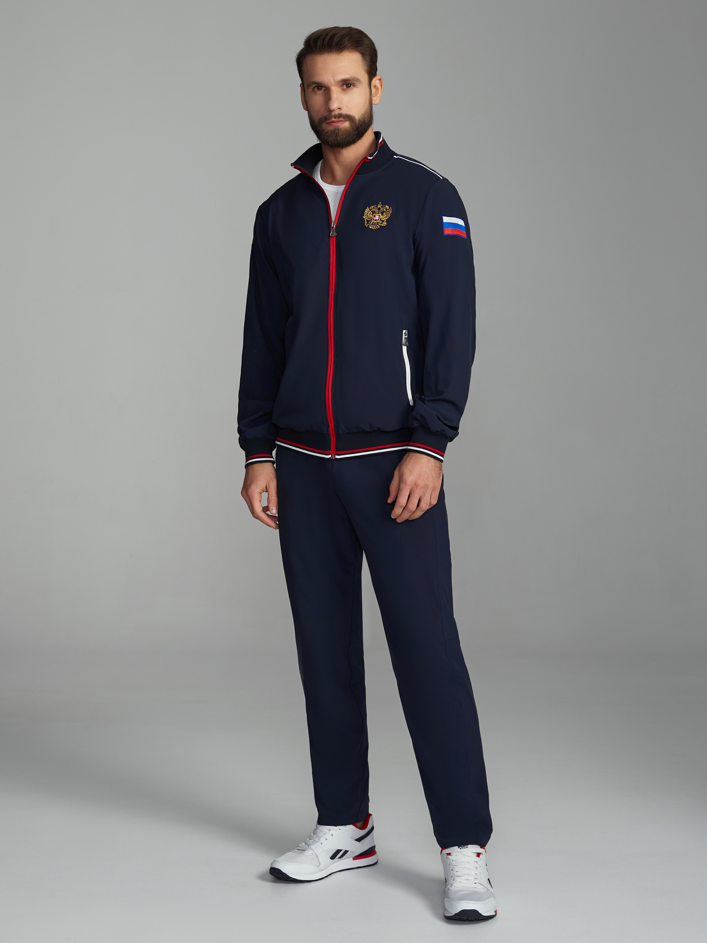 Спортивный мужской костюм изготовлен из легкой плащевой ткани с добавлением лайкры, которая при носке обладает упругим растяжением подобно трикотажному полотну. Куртка на молнии с воротником, с подкладкой из легкой трикотажной сетки. Куртка свободного силуэта, заужена книзу поясом из трикотажной резинки с полосками, воротник- стойка также выполнен из трикотажной резинки.. Карманы прорезные, с открытыми молниями. Крой рукава - втачной, низ рукава слегка заужен трикотажным манжетом с контрастными полосами. Слева на груди вышивка "герб России", На левом рукаве вышивка аппликация - флаг России, на спине надпись RUSSIA. Все вышивки выполнены цветными шелковыми нитями. Брюки костюма на сетчатой подкладке. Карманы брюк прорезные с открытыми молниями. Слева под карманом настрочен шеврон с фирменным логотипом.