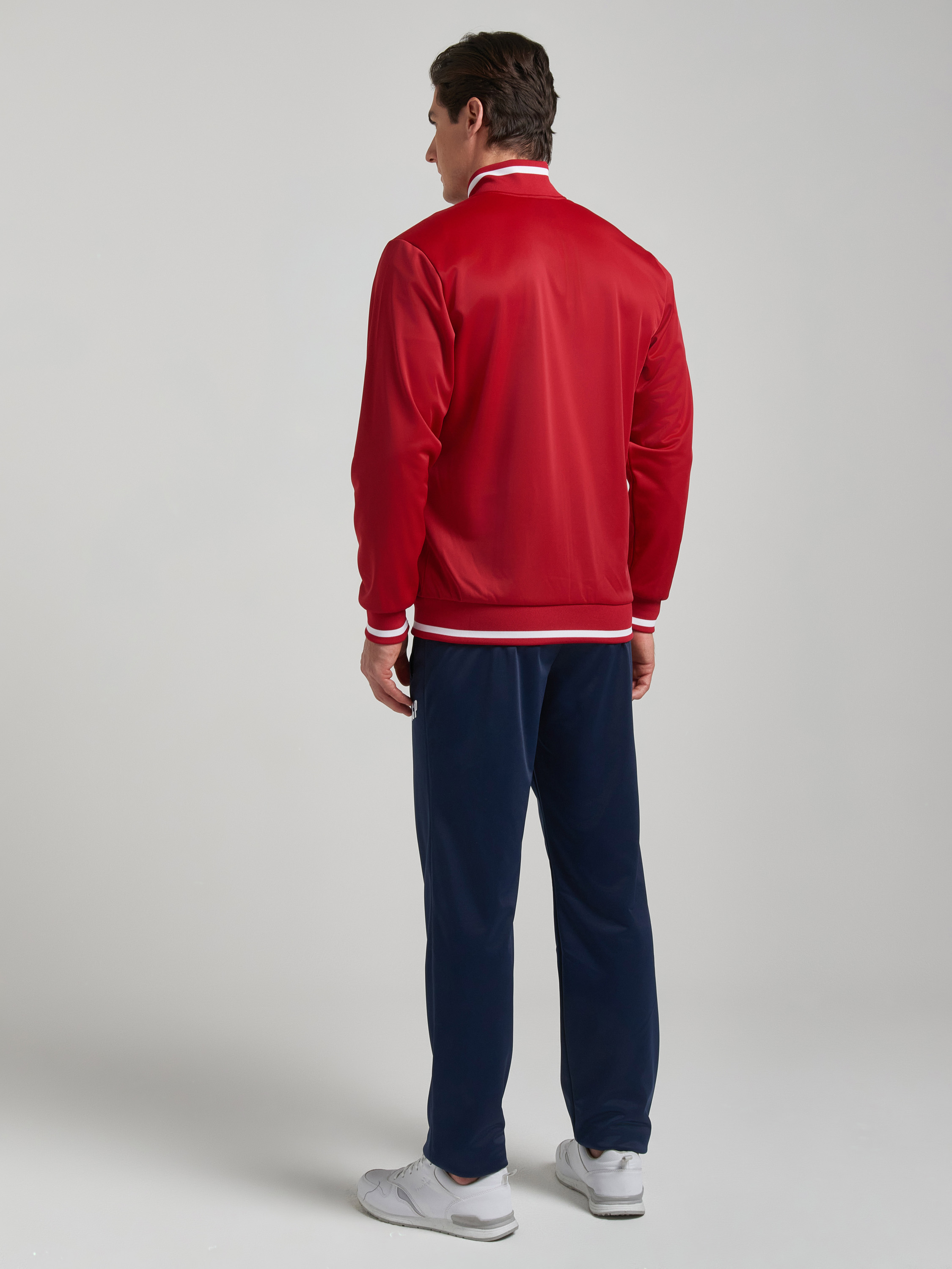 Яркий мужской спортивный костюм в символике СССР, выполнен из трикотажного полотна с изнаночным начесом. Куртка прямого силуэта, с воротником, на поясе, застегивается на молнию. Рукава втачные. Карманы куртки на молниях. Воротник, пояс и манжеты куртки из полосатого трикотажного полотна. На груди куркинастрочены горизонтальные белые полосы, на вставке между полосами вышивка-аппликация СССР. Брюки прямые, карманы брюк прорезные, с молниями. Под левым карманом вышивка СССР белыми нитями. Пояс брюк эластичный, по линии талии дополнительно регулируется шнурком. 100% полиэстер