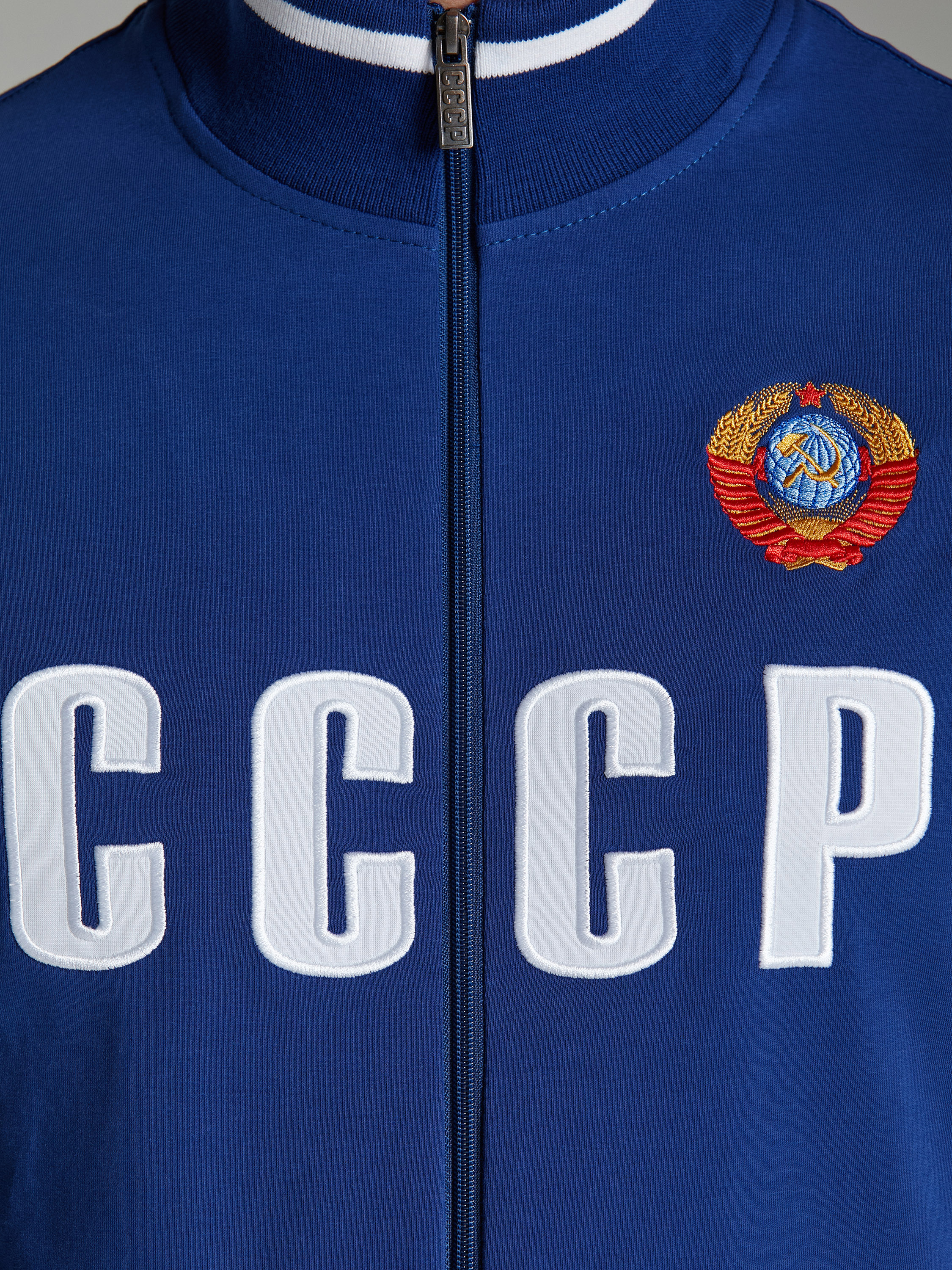 Спортивный костюм из хлопкового трикотажного полотна в ретро-стиле СССР. Куртка костюма на поясе, с воротником, застегивается на молнию. Рукава втачные. Изделие богато украшено вышивками. На уровне груди большая вышивка-аппликация СССР. Слева, ближе к плечу, вышивка герба СССР, выполненная цветными шелковыми нитями.Пояс, воротник и манжеты куртки изготовлены из эластичного подвяза с белыми полосами. Карманы куртки и брюк прорезные, на молниях. Брюки прямого силуэта, слегка заужены книзу. Под левым карманом брюк вышивка СССР.Пояс брюк по линии талии с эластичной резинкой, дополнительно регулируется шнуром.. 95% хлопок, 5% эластан