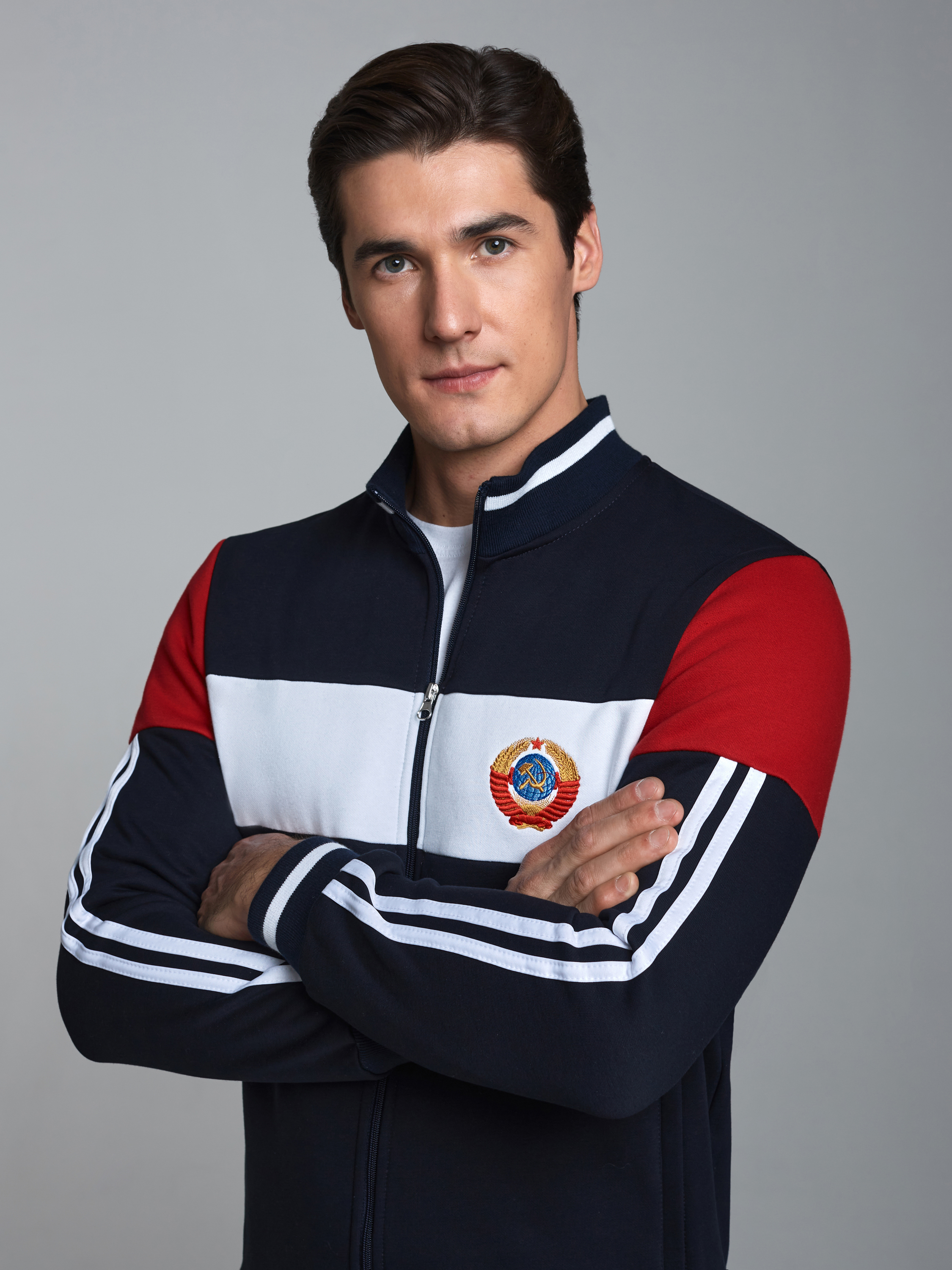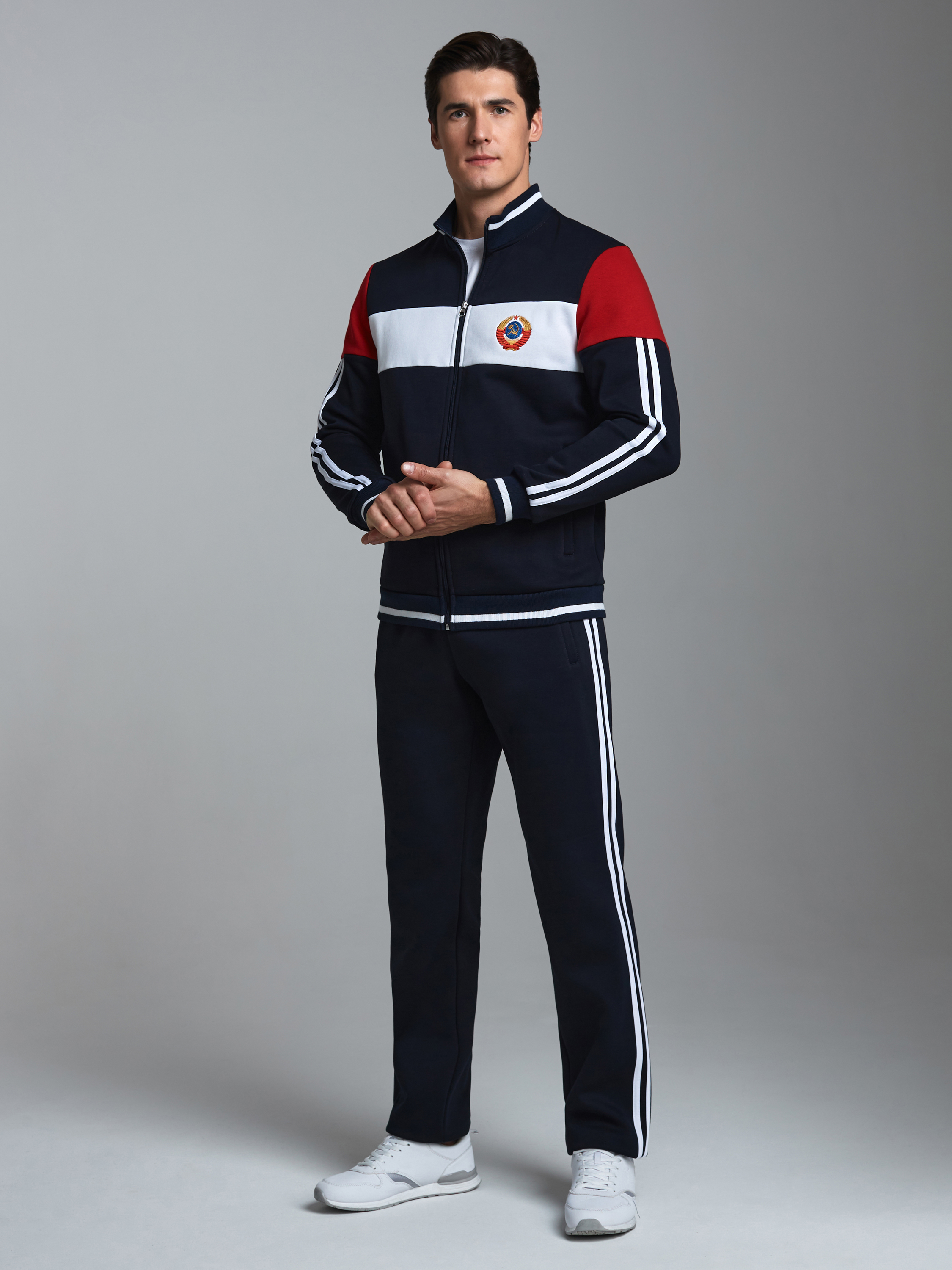Спортивный костюм из трехниточного трикотажа с начесом по изнанке в классической расцветке триколор. Куртка с белой вставкой по полочке с вышивкой "герб СССР". Карманы на куртке и брюках прорезные с листочками и с молниями. Воротник, манжеты рукавов и пояс куртки из эластичной рибаны. Часть рукава, в области плеча отрезная из красной ткани. По рукавам и по боковым швам брюк настрочены белые лампасы. Брюки прямые. Пояс по линии талии регулируется шнурком. На спинке куртки выполнена вышивка "СССР".