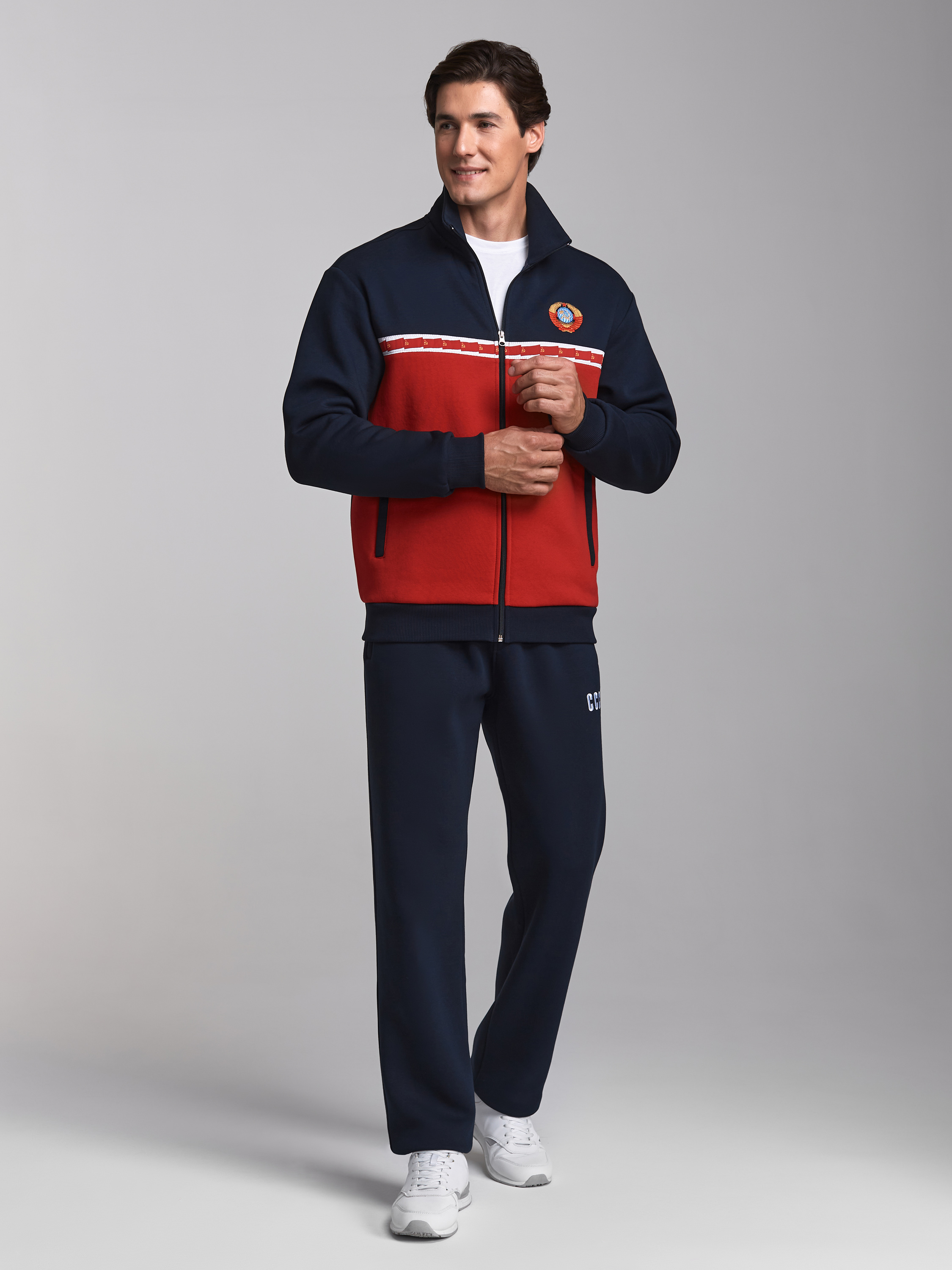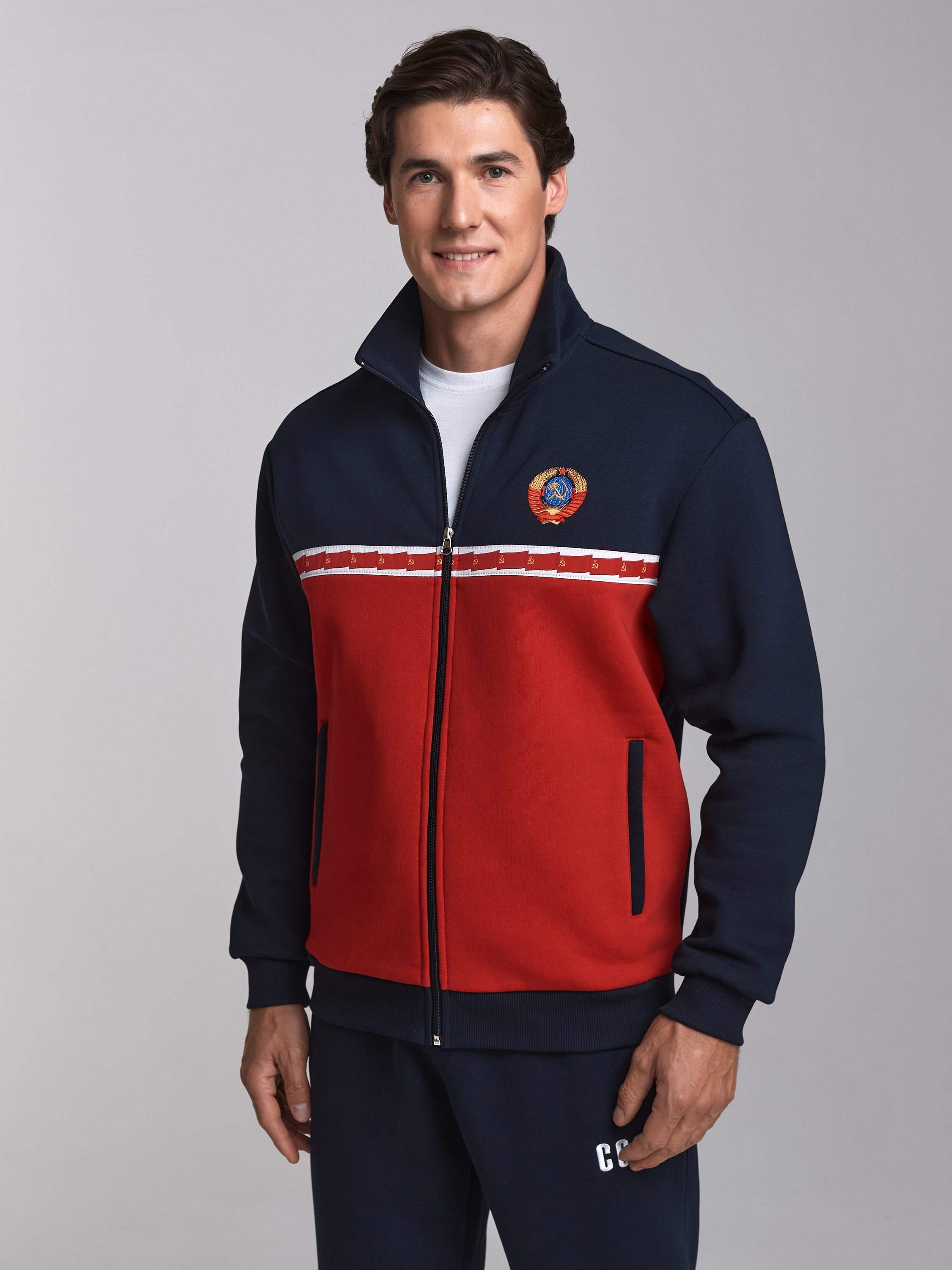 Спортивный костюм изготовлен из плотного хлопкового трикотажного полотна с изнаночным начесом. Куртка костюма на поясе, с воротником-стойкой, застегивается на молнию. Оформление костюма выполнено в символике СССР. Передняя часть куртки комбинированная – из темно-синей и красной ткани, по границе деталей настрочена белая жаккардовая лента с флагами. На левой кокетке вышивка герба СССР, выполнена цветными шелковыми нитями. На спине вышивка -аппликация СССР. Воротник, пояс и манжеты куртки изготовлены из плотной эластичной трикотажной резинки. Карманы куртки и брюк прорезные, с молниями. Брюки прямые. Пояс брюк по линии талии с эластичной резинкой, дополнительно регулируется шнуром. Под левым карманом брюк белая вышивка СССР. 65% хлопок, 35% полиэстер