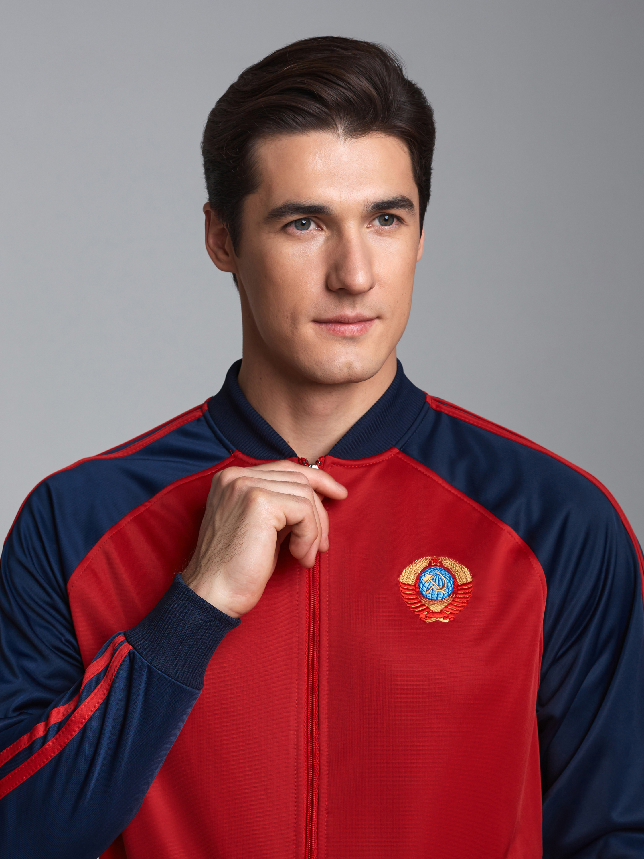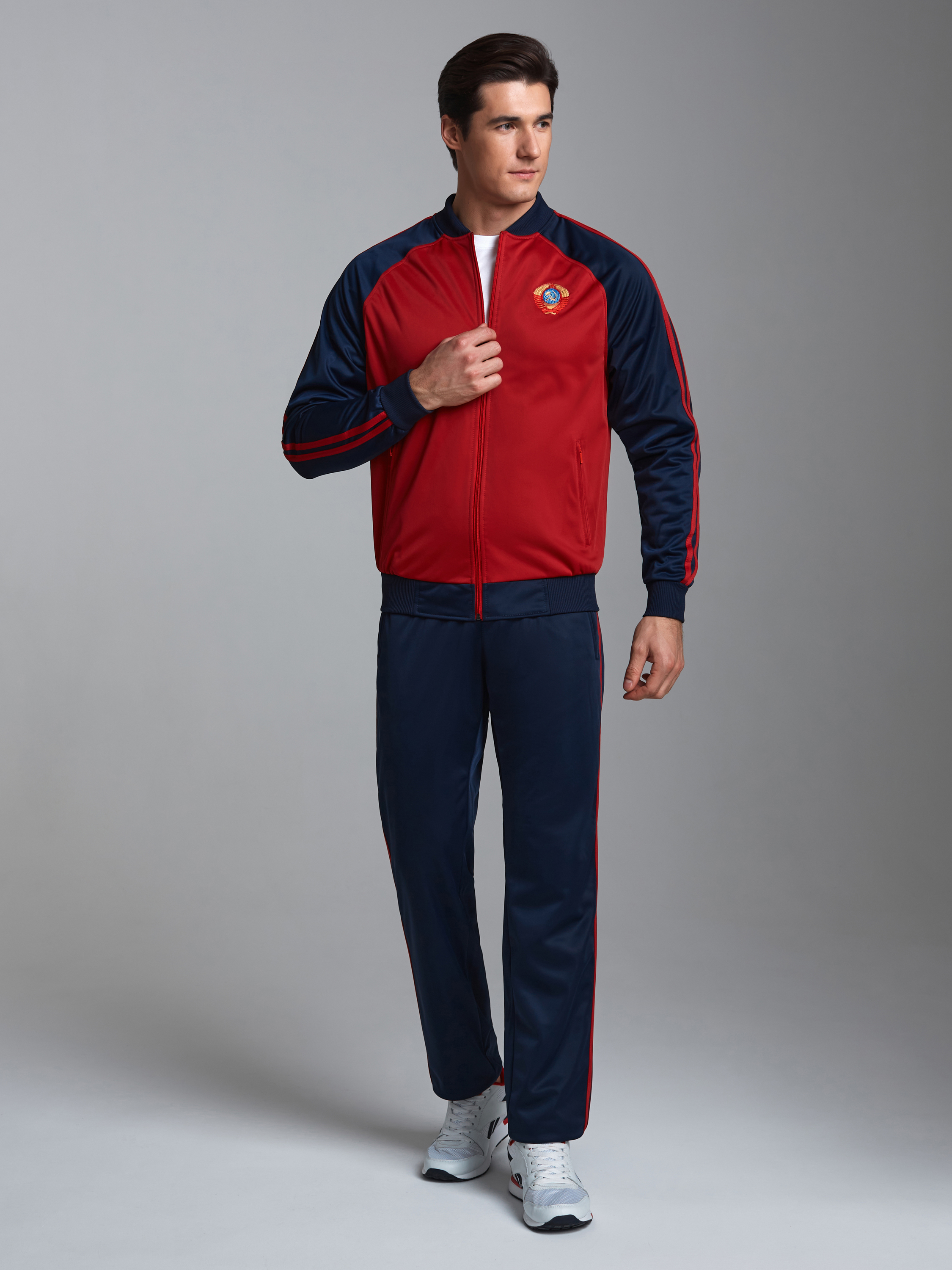 Спортивный костюм из полиэстровой ткани с изнаночным начесом. Карманы куртки и карманы на брюках прорезные "в рамку" на молнии. По рукавам куртки и боковым швам брюк настрочены по два параллельных лампаса красного цвета. Посадку по фигуре обеспечивает эластичная трикотажная рибана по воротнику-бомбер, поясу и рукавам куртки. На левой полочке выполнена вышивка "герб". На спинке выполненна аппликация "СССР". Пояс по линии талии регулируется шнурком.