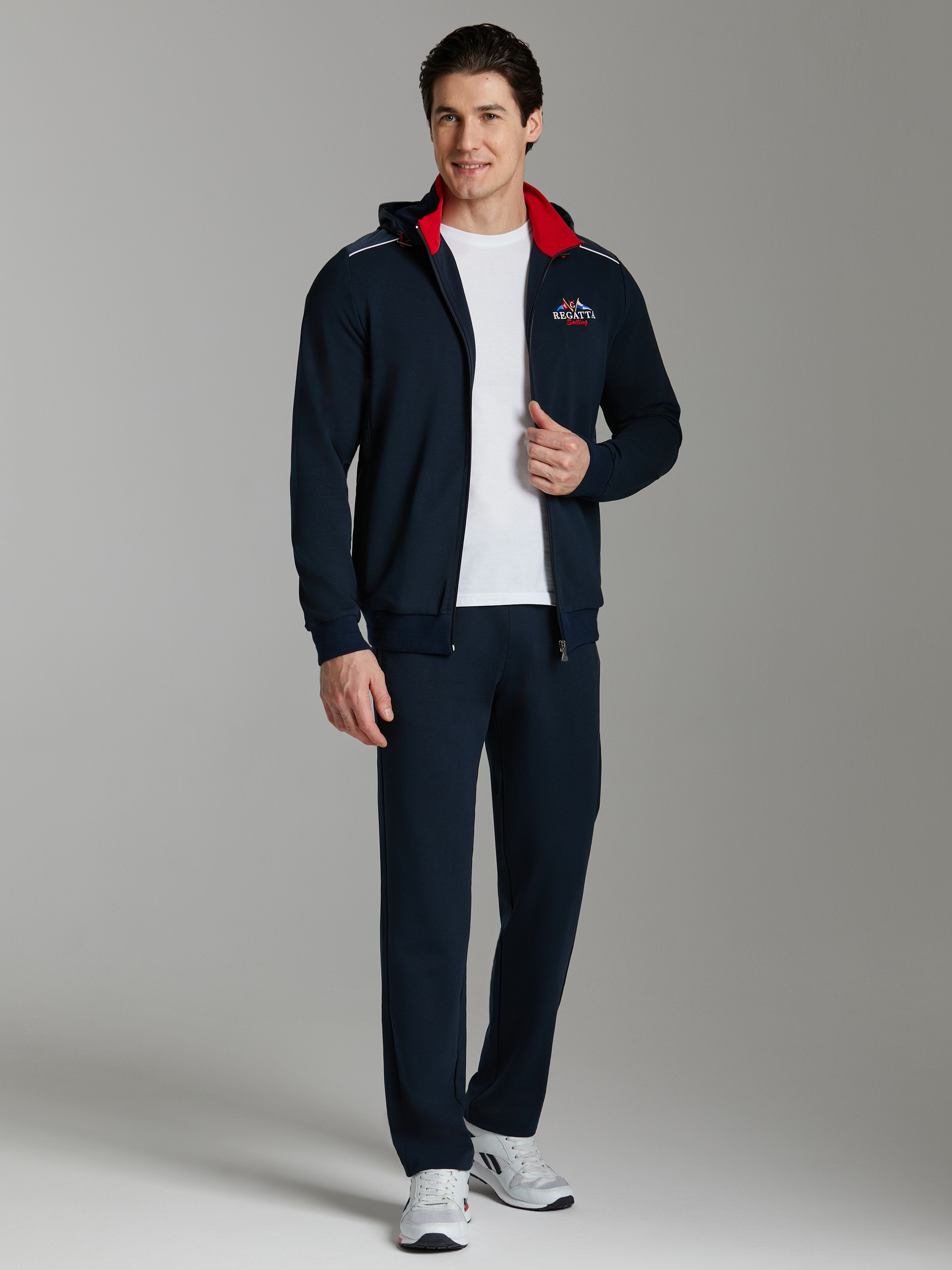 Мужской артикул 11M-RR-1829 темно-синего цвета спортивный спортивный костюм из хлопкового трикотажного полотна с эластаном. Костюм выполнен в морской стилистике и имеет яркую отделку и дополнен функциональными деталями. Боковые вставки, кокетка куртки и капюшон выполнены из водоотталкивающей плащевой ткани. Функциональность капюшона улучшена за счет регулировки лицевой части фиксаторами с эластичным шнуром. Дополнительно защищает от ветра воротник-стойка. Яркая вышивка на кокетке, контрастные строчки молний, канты и полосы на подкладочных тканях пояса и манжет дополняют стильный дизайн изделия. Карманы куртки и брюк прорезные, застегиваются на молнии. Брюки прямого силуэта, слегка заужены книзу. Пояс брюк по линии талии с эластичной резинкой, дополнительно регулируется шнуром.