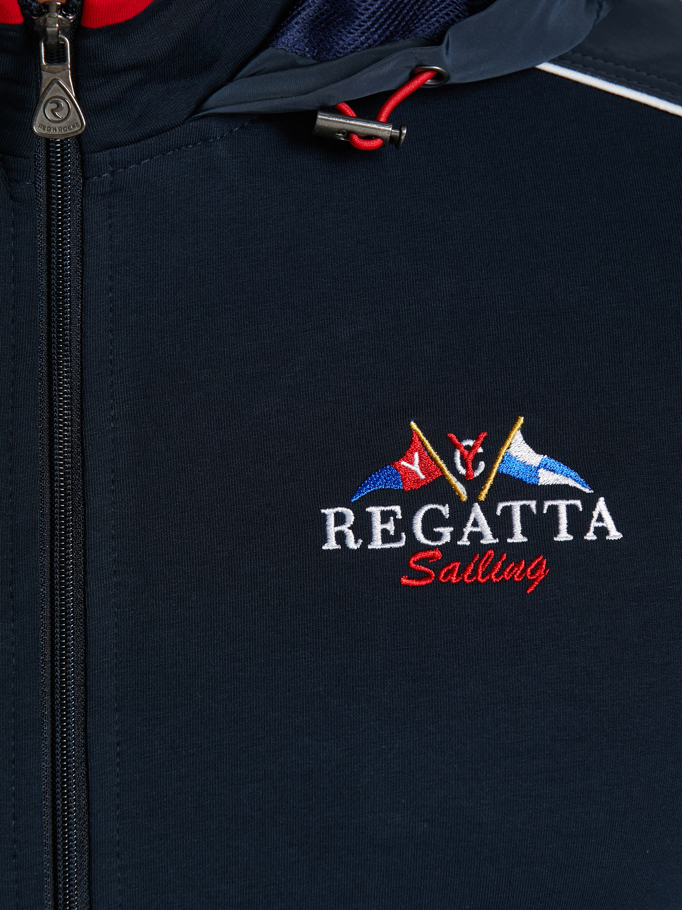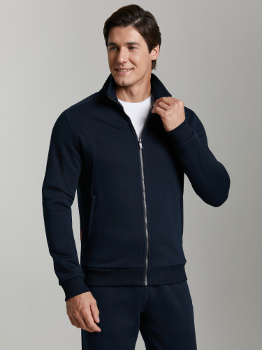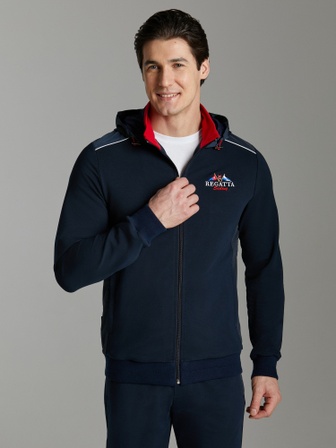 Мужской артикул 11M-RR-1829 темно-синего цвета спортивный спортивный костюм из хлопкового трикотажного полотна с эластаном. Костюм выполнен в морской стилистике и имеет яркую отделку и дополнен функциональными деталями. Боковые вставки, кокетка куртки и капюшон выполнены из водоотталкивающей плащевой ткани. Функциональность капюшона улучшена за счет регулировки лицевой части фиксаторами с эластичным шнуром. Дополнительно защищает от ветра воротник-стойка. Яркая вышивка на кокетке, контрастные строчки молний, канты и полосы на подкладочных тканях пояса и манжет дополняют стильный дизайн изделия. Карманы куртки и брюк прорезные, застегиваются на молнии. Брюки прямого силуэта, слегка заужены книзу. Пояс брюк по линии талии с эластичной резинкой, дополнительно регулируется шнуром. 77% хлопок, 17% полиэстер, 6% эластан
