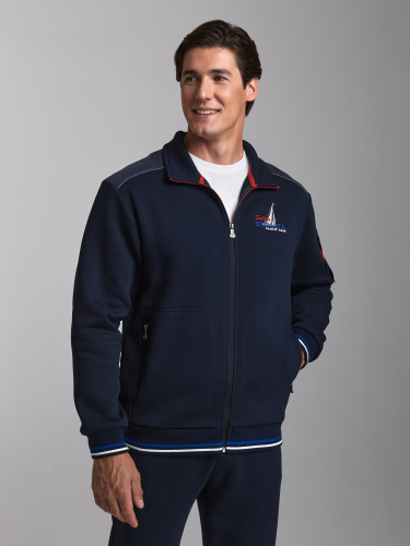 Мужской спортивный костюм из плотного хлопкового трикотажа с изнаночным начесом. Комплект выполнен в стиле «Яхтинг», который подчеркивается яркой вышивкой, контрастными отделочными строчками и деталями из плотной водоотталкивающей плащевой ткани. Костюм состоит из куртки с воротником на молнии и брюк. Куртка свободного силуэта на поясе, рукава втачные. На изделии много модных функциональных деталей. Кокетка, карман на левом рукаве и нижний воротник выполнены из темно-синей плащевки. Прорезные боковые карманы куртки и брюк застегиваются на молнии. Брюки прямые, есть дополнительный задний карман. В пояс брюк вшита эластичная резинка, ширина пояса дополнительно регулируется шнуром. 65% хлопок, 35% полиэстер