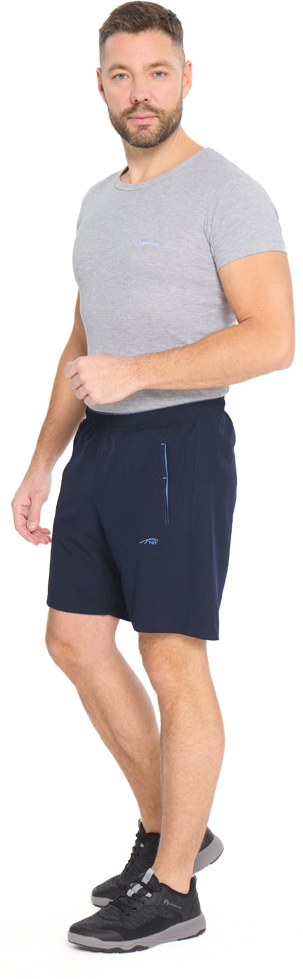 Спортивные шорты с 2-х цветным поясом на резинке. Длина – выше колена. Для дополнительной фиксации с внутренней стороны в пояс вставлен шнурок. Отшиты из тонкого гладкого синтетического материала (бистреч). Нити эластана расположены как по утку, так и по основе ткани, что придаёт материалу чрезвычайную подвижность, формоустойчивость и комфорт в носке. Передние карманы фиксируются молниями в цвет отделки пояса. Молнии прикрыты листочками, декорированными вышивками. Под левым карманом вышивка в фирменном стиле.