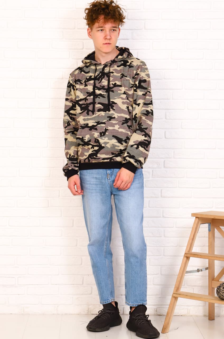 Ткань - футер двухнитка с небольшим начёсом. Приятная к телу и мягкая. Расцветка ткани с набивным эксклюзивным рисунком в стиле "милитари" делает модель интересной и эффектной.