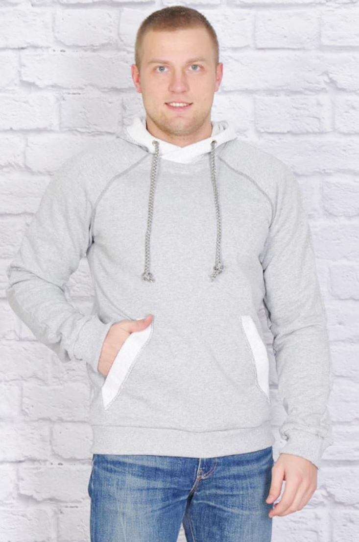 Мужская толстовка с капюшоном в спортивном стиле, с удобным карманом "кенгуру", рукав - реглан с декоративной отстрочкой. Низ и рукава изделия на манжете из эластичной рибаны. Оригинально и стильно смотрится отделка капюшона и кармана - изнаночной стороной ткани. Для пошива модели используется петельчатый футер трёхнитка турецкого производства.
