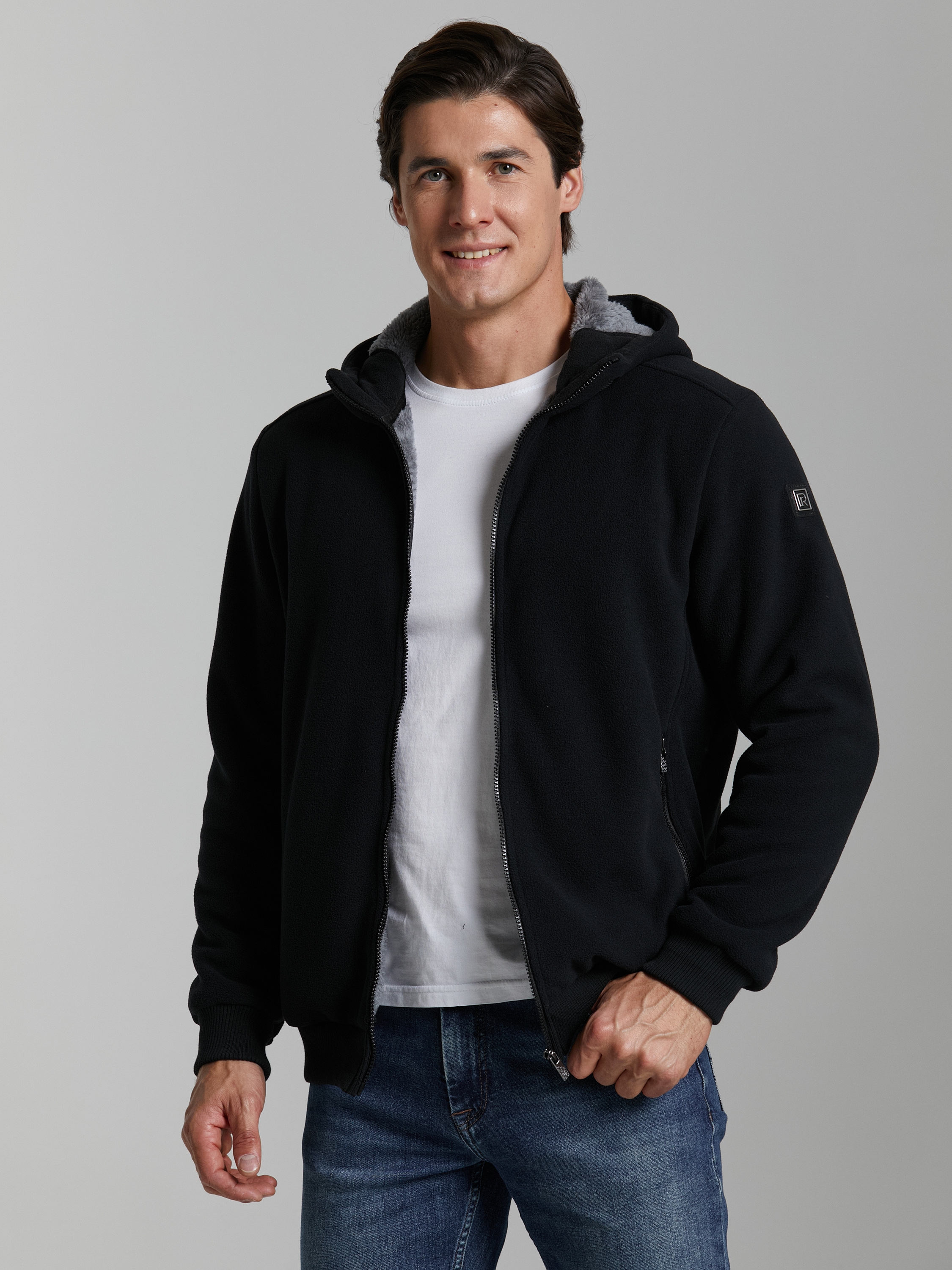 Толстовка мужская из плотного флиса, дублированного мехом. Толстовка с капюшоном. Карманы прорезные с открытыми молниями. Низ куртки заужен трикотажным поясом. Рукава втачные, низы рукавов с манжетами. На левом рукаве шеврон с фирменным логотипом.