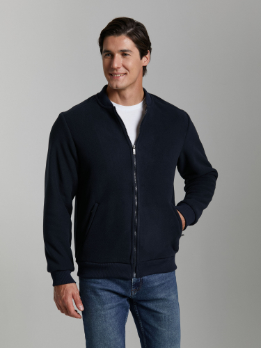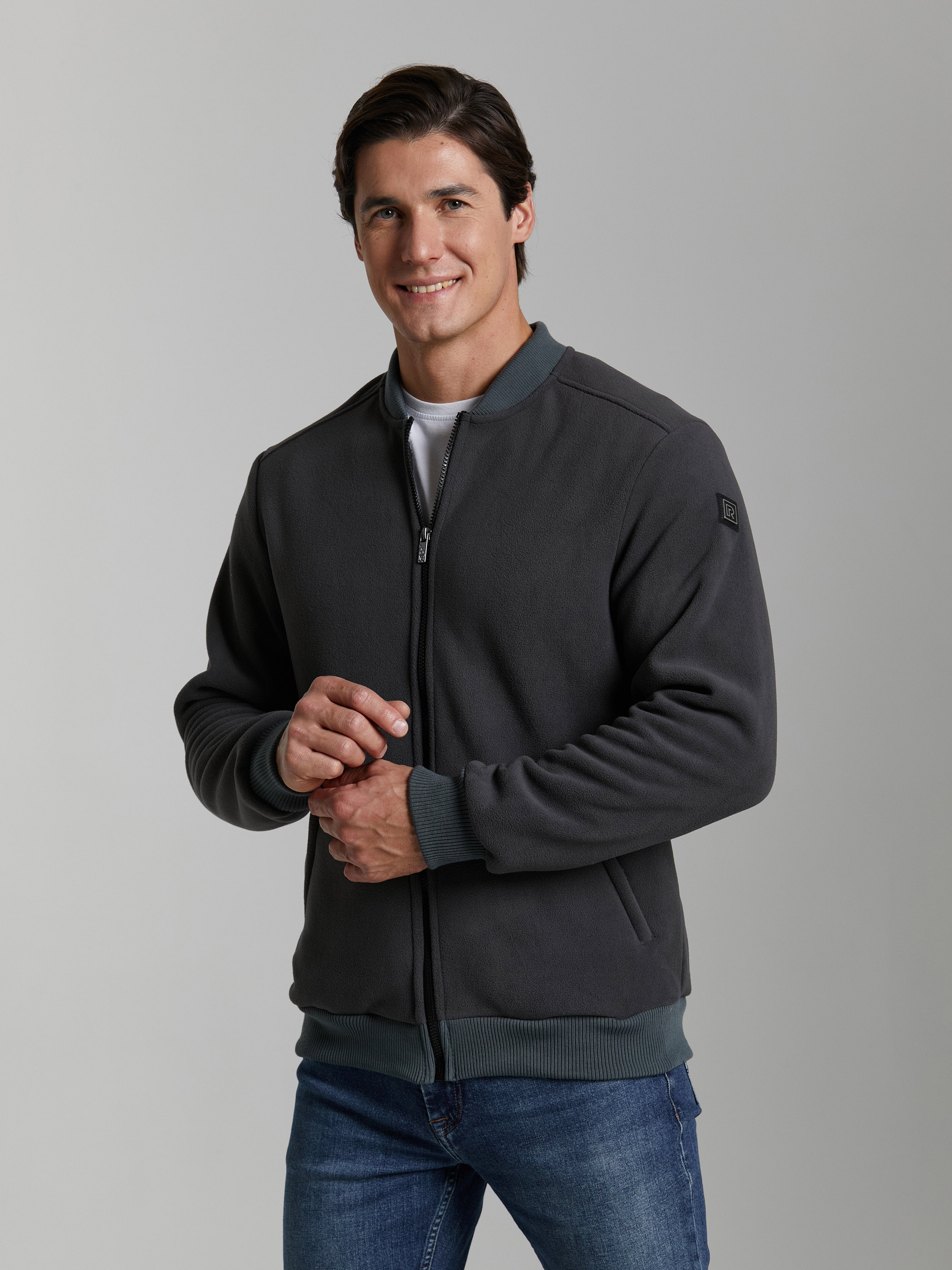 Толстовка-бомбер мужская из плотного флиса, дублированного мехом. Застегивается на молнию. Воротник - стойка из эластичного трикотажа. Низ куртки заужен трикотажным поясом. Рукава втачные, низы рукавов на трикотажном манжете. Карманы прорезные, с молниями На левом рукаве шеврон с фирменным логотипом. 100% полиэстер
