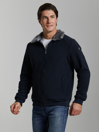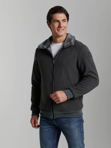 Толстовка мужская в стилистике летной куртки изготовлена из плотного флиса, дублированного мехом. Застегивается на молнию. Воротник отложной, отделан внутренним мехом. Низ куртки заужен трикотажным поясом. Рукава втачные, низы рукавов на трикотажном манжете. Карманы прорезные, с молниями На левом рукаве шеврон с фирменным логотипом. 100% полиэстер