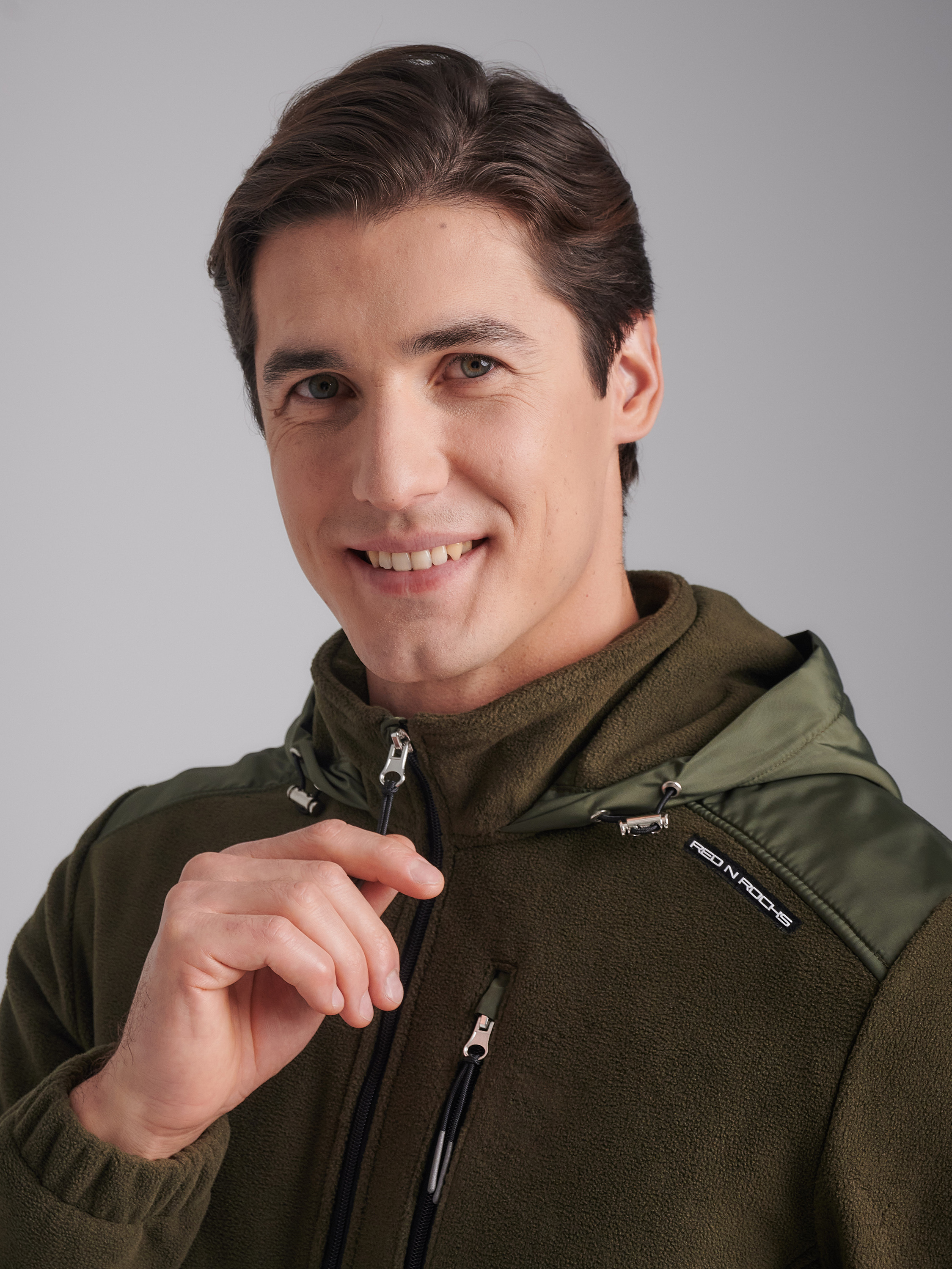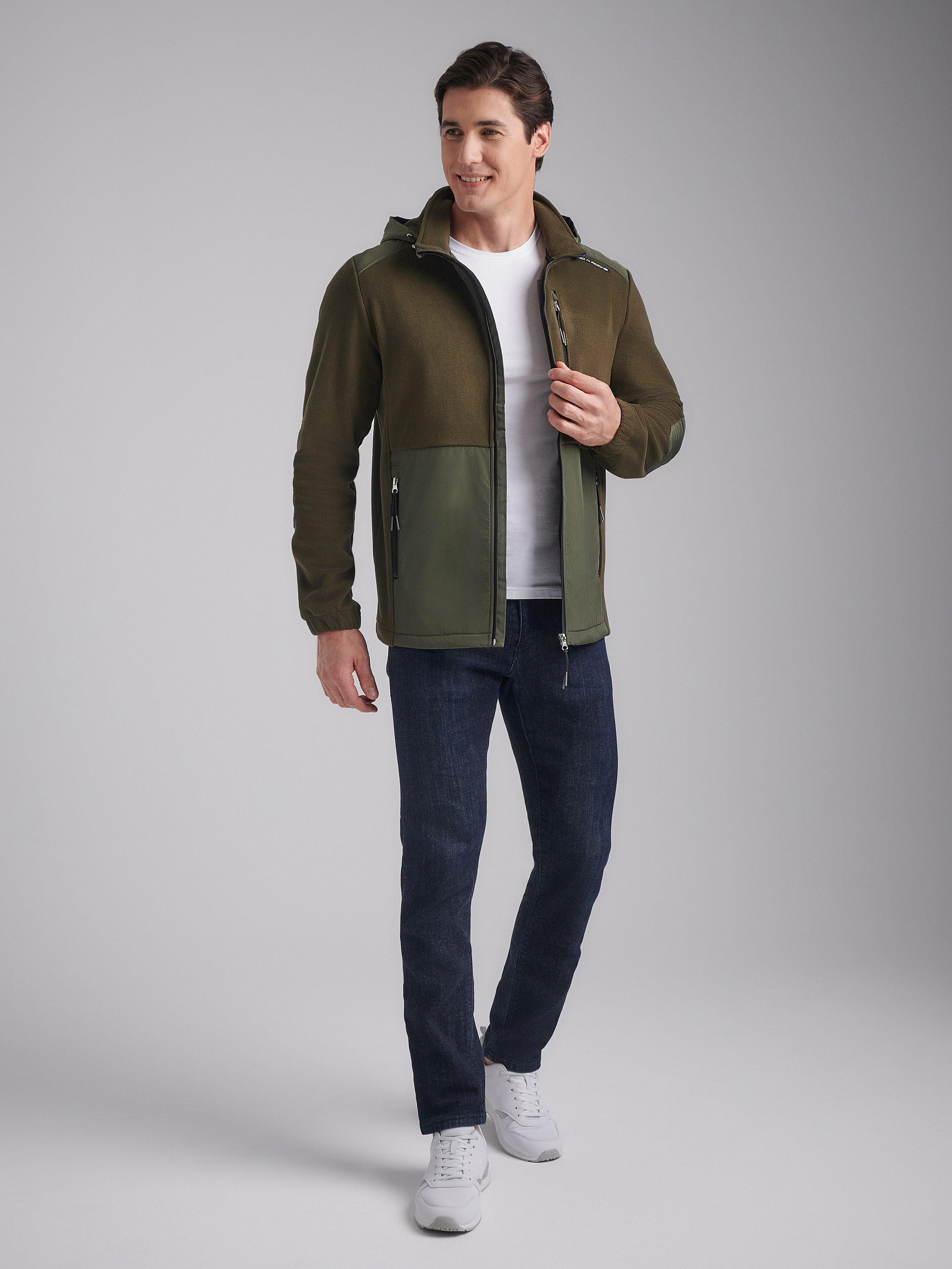 Толстовка мужская из флиса с капюшоном. Низ куртки и низ рукавов выполнены с эластичной рибаной. Толстовка с накладными карманами "кенгуру". Рукава "реглан". По всем швам выполнена отделочная строчка. По низу толстовки расположен, вдоль шва притачивания пояса настрочен шеврон с фирменным логотипом. В капюшоне расположены декоративные шнуры. 100% полиэстер