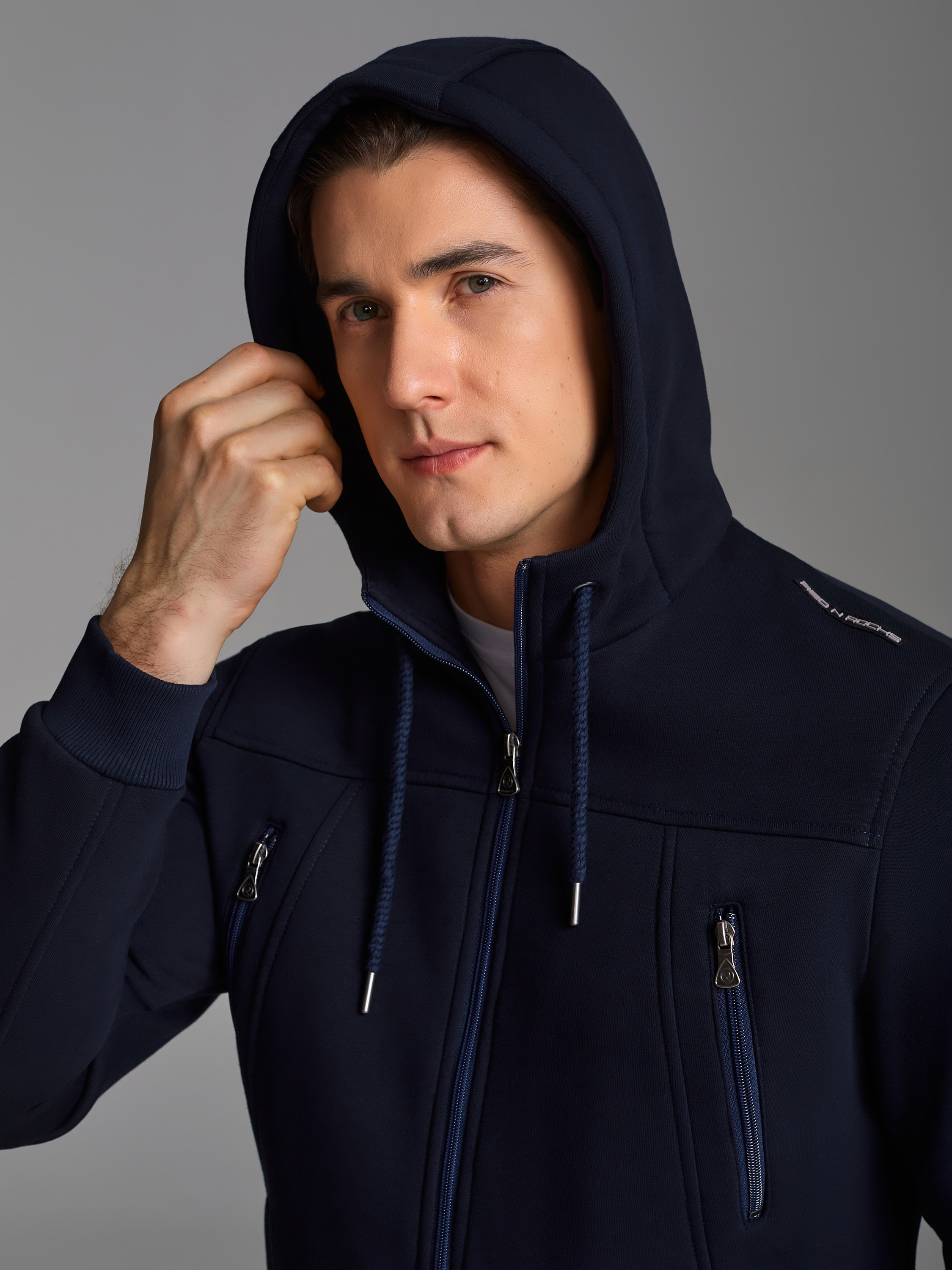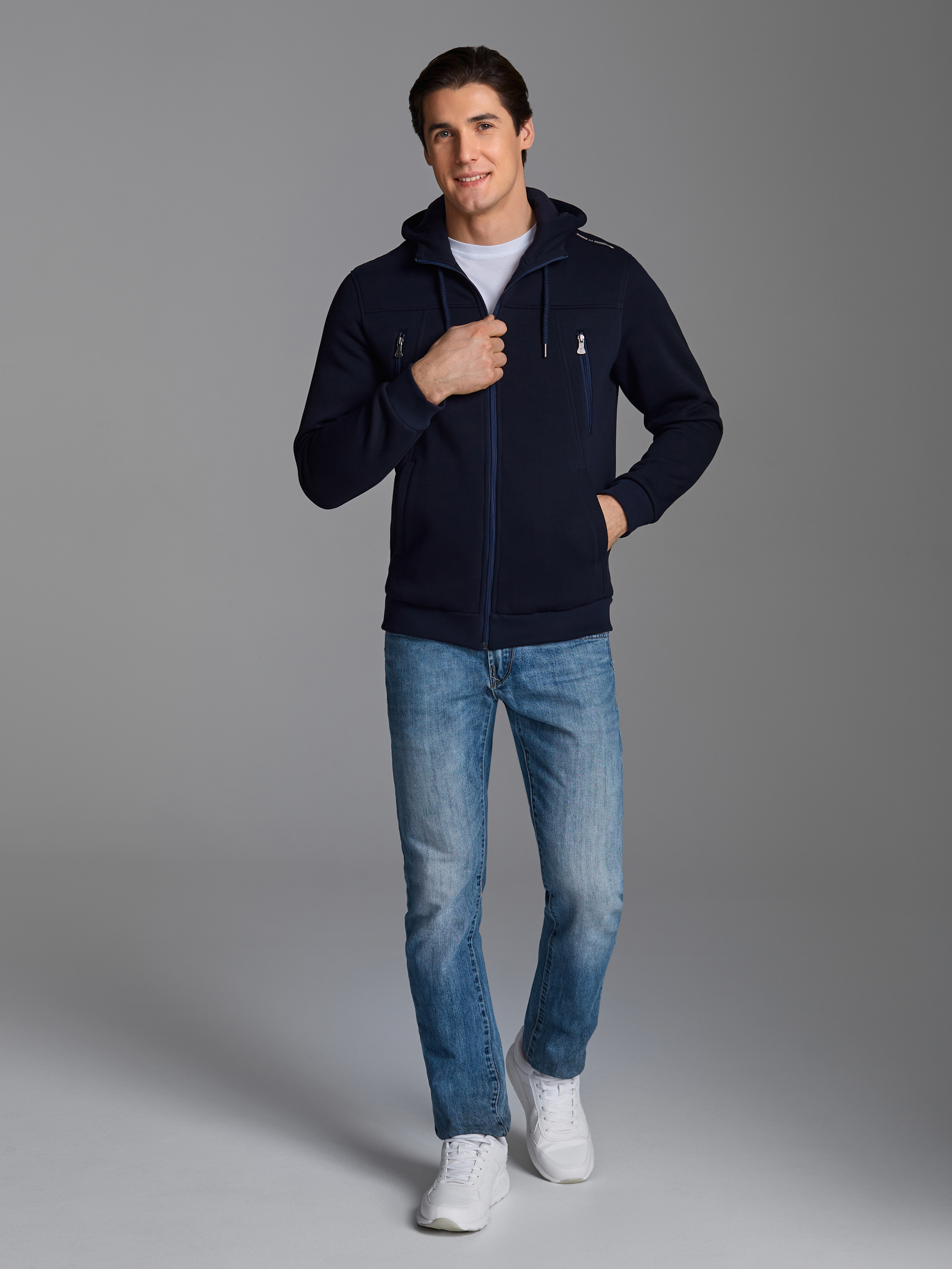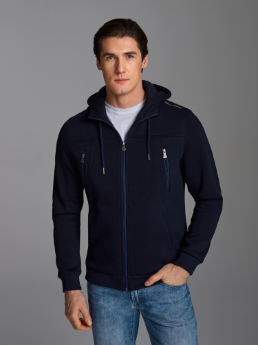 Толстовка мужская из плотного и мягкого хлопкового трикотажного полотна с изнаночным начесом. Капюшоном с подкладкой из кулирного полотна. Манжеты по рукавам и пояс толстовки из рибаны. На полочке и спинке отрезные кокетки. Карманы выполнены в отрезных деталях полочки с листочками без молний. На обоих полочках выполнены прорезные вертикальные нагрудные карманы с открытыми молниями. На полочках, с внутренней стороны, подкладка из кулирного полотна. 65% хлопок, 35% полиэстер