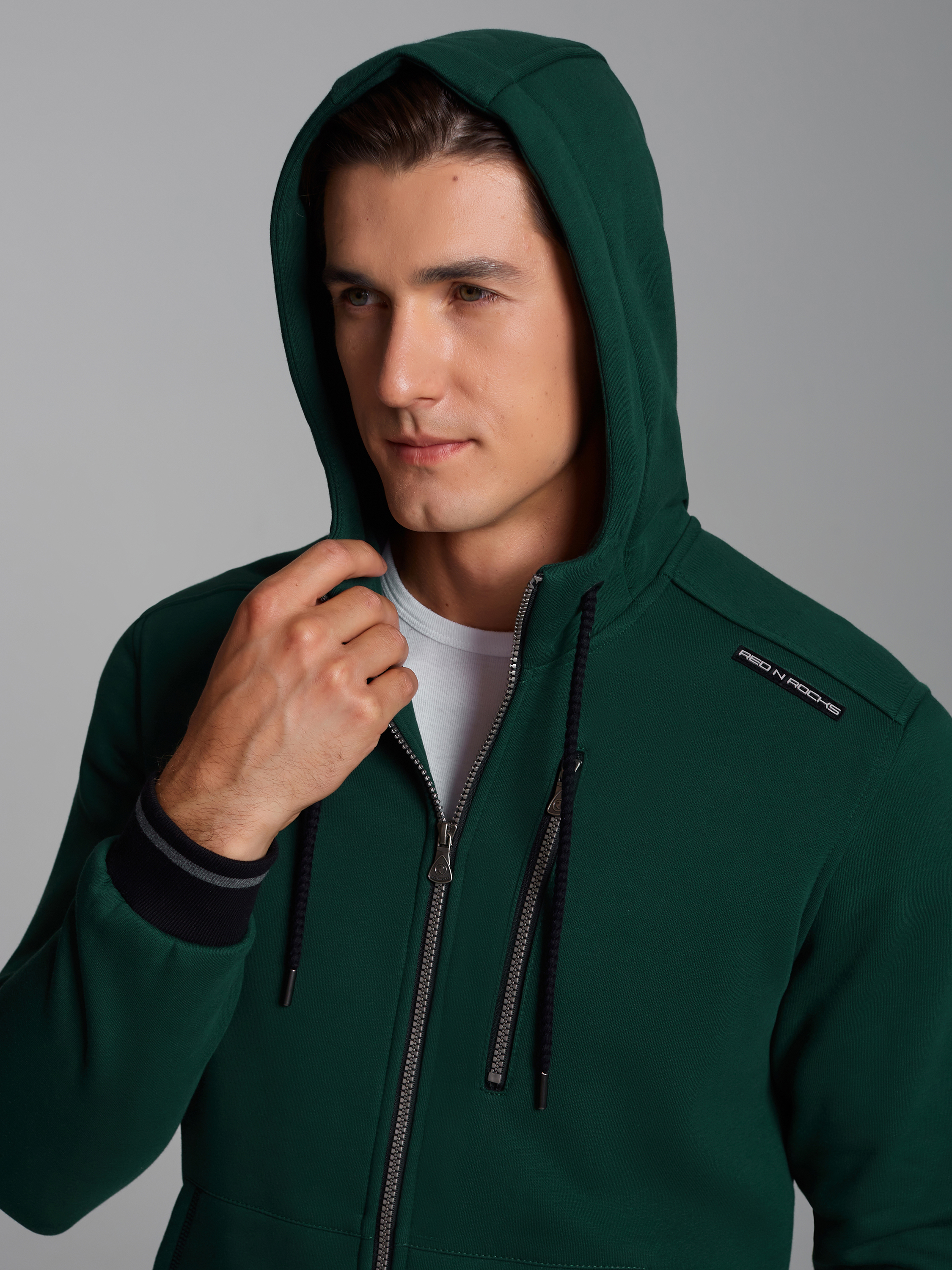 Толстовка мужская из плотного и мягкого хлопкового трикотажного полотна с изнаночным начесом. Изделие на молнии, с капюшоном, внутри капюшона - подкладка из клетчатой ткани. Спереди на изделии большие накладные карманы, слева на груди карман на молнии. По низу толстовки и низу рукавов пришита вязанная декоративная резинка. 65% хлопок, 35% полиэстер